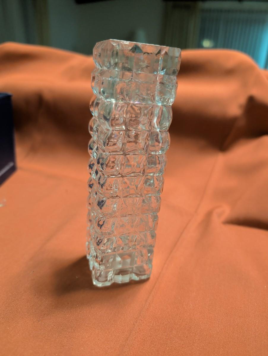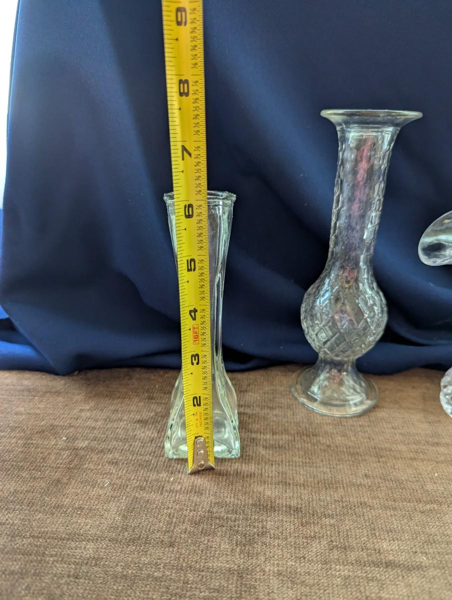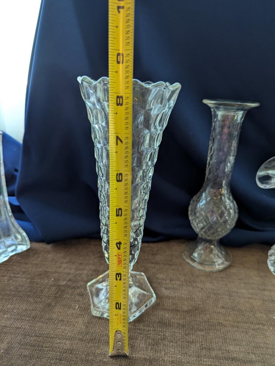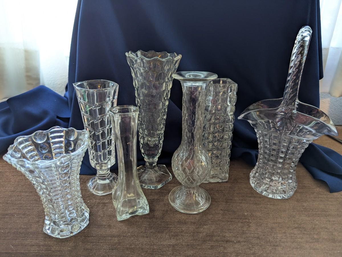 Lead crystal Cristal Darques vase, Indiana glass Mayflower pattern, pattered Brady glass bud vase, stacked look bud vase, Indiana Monticello Waffle Block Bridal Basket.