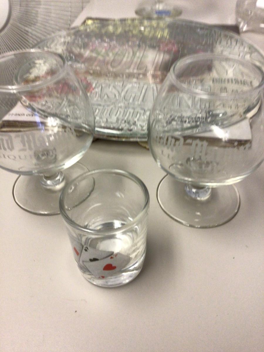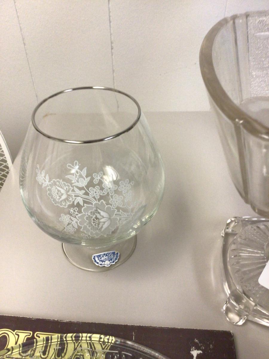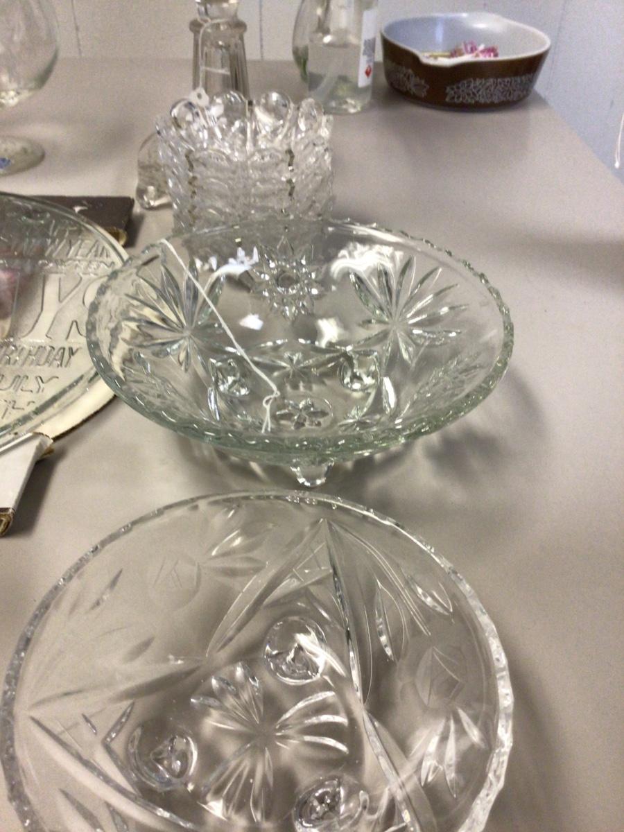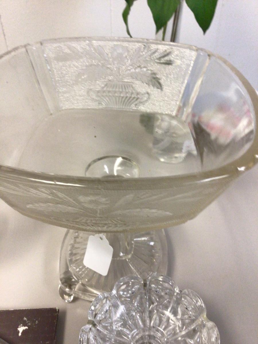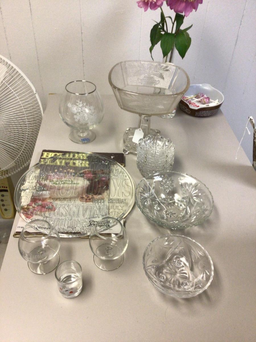 Here is clear vintage glass lot. There is a large compote, cake plate brandy snifters, candy dishes and a playing card shot glass