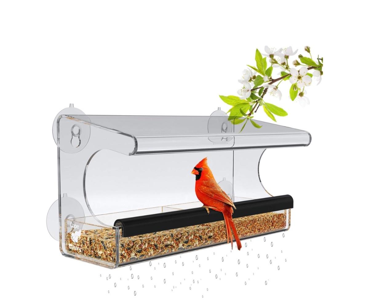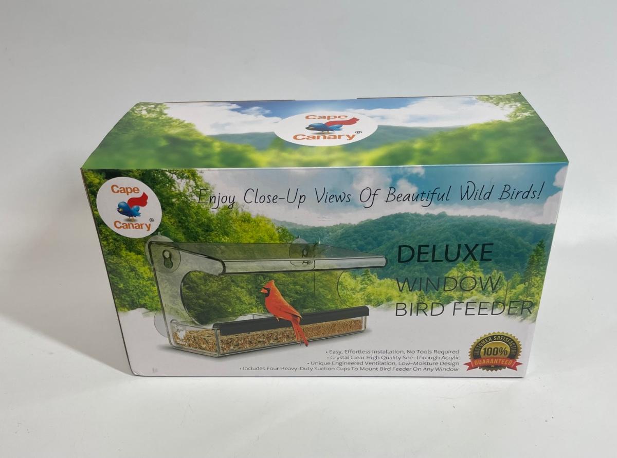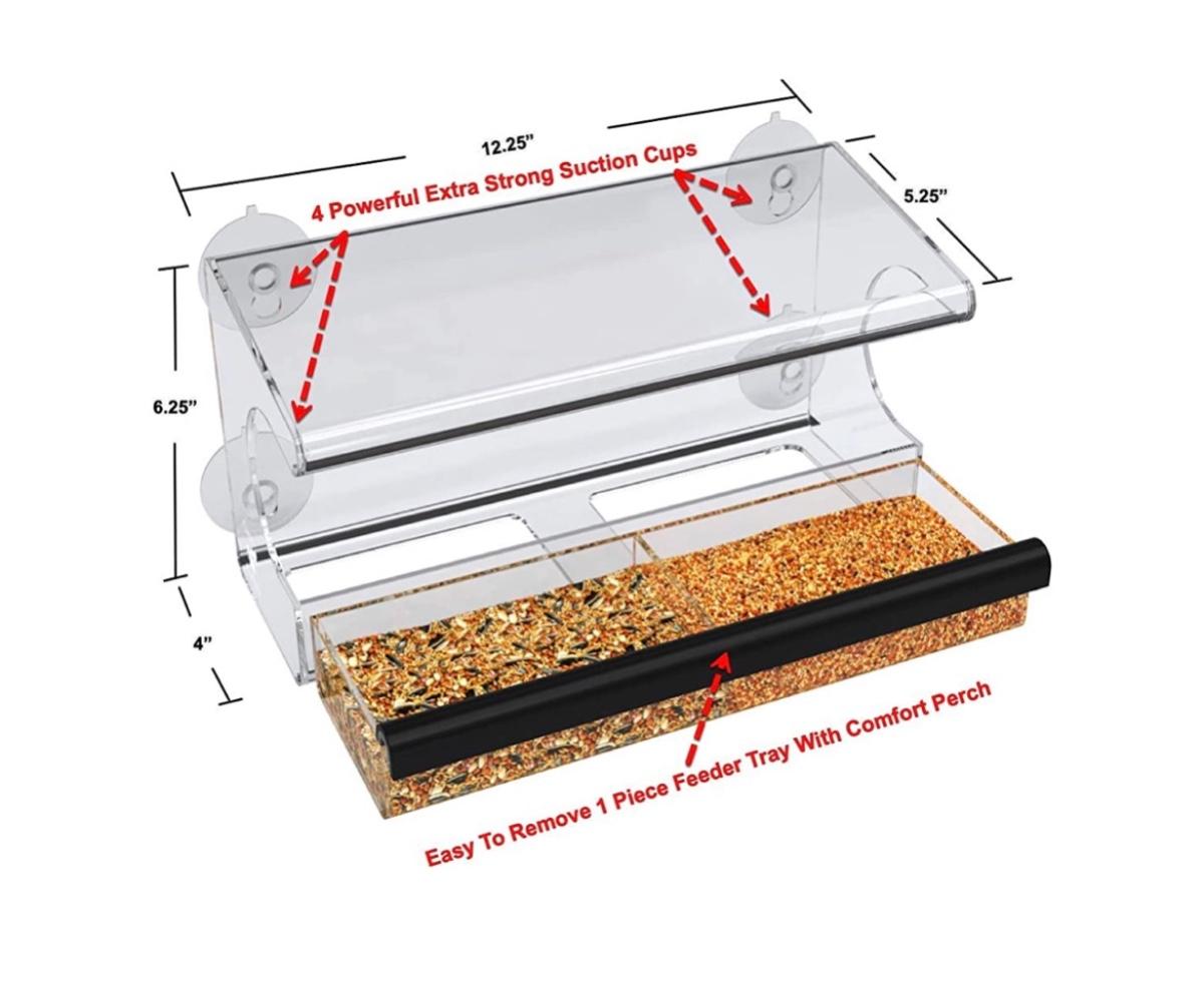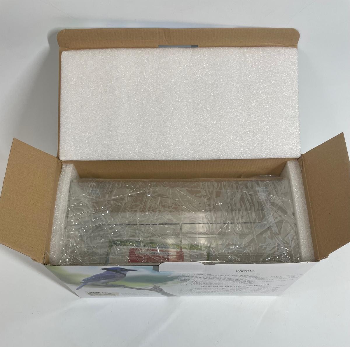 New-in-box Bird feeder made from clear plexi, mounts outside a window using suction cups. Approx. 13” long, great for watching birds up close.