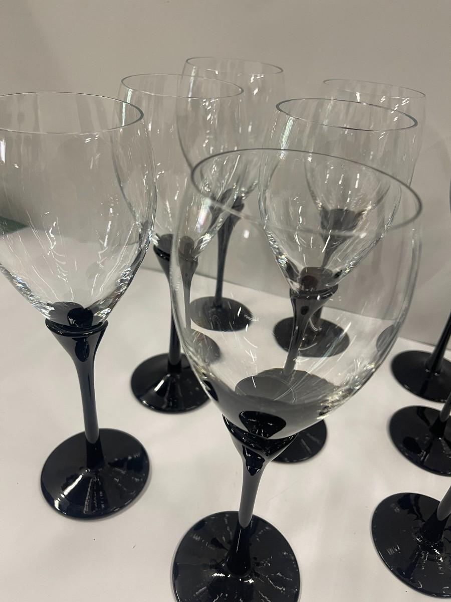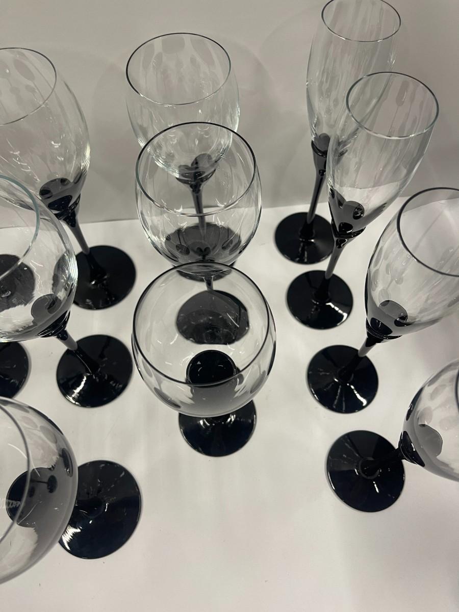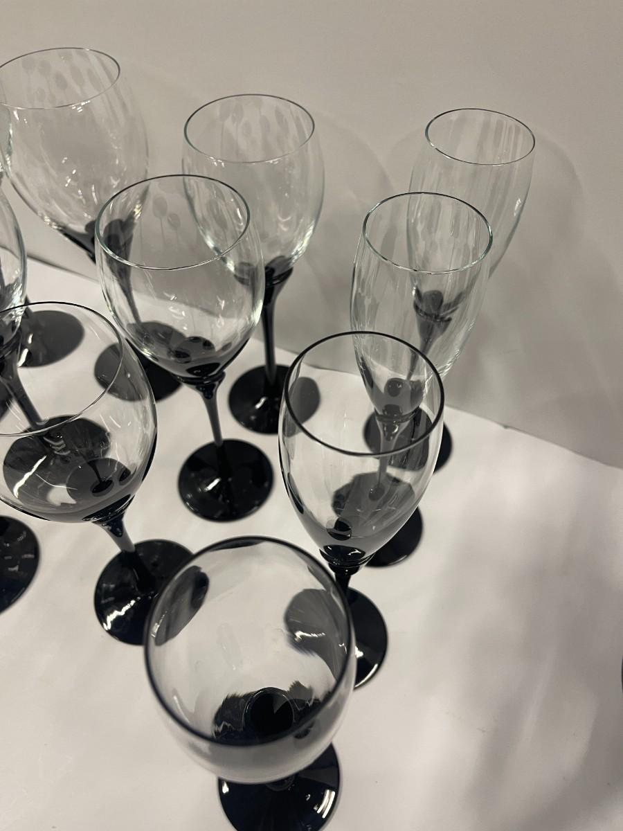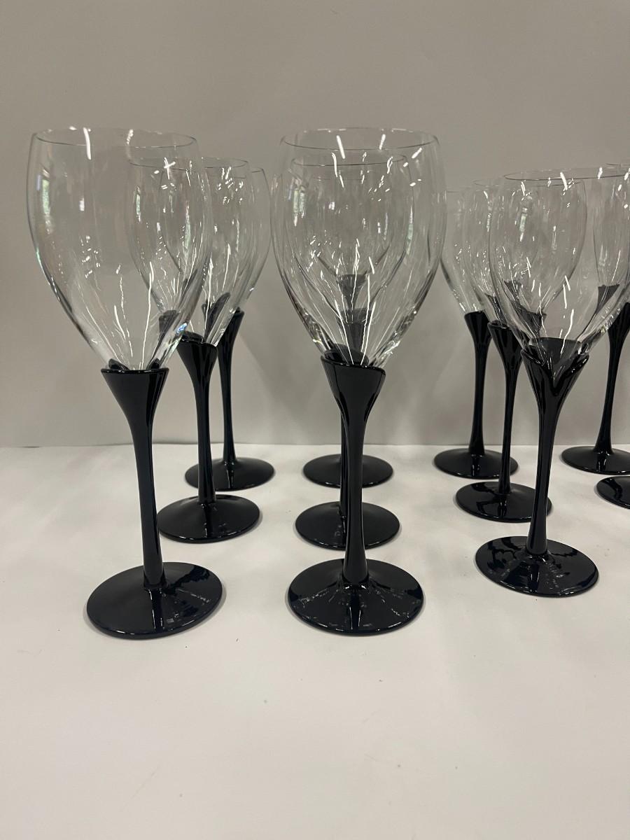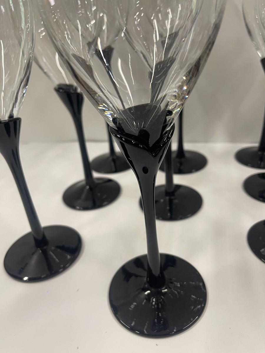 Lot of wine glasses with black stems and clear bowls. 6 large, 3 small and 4 flutes.