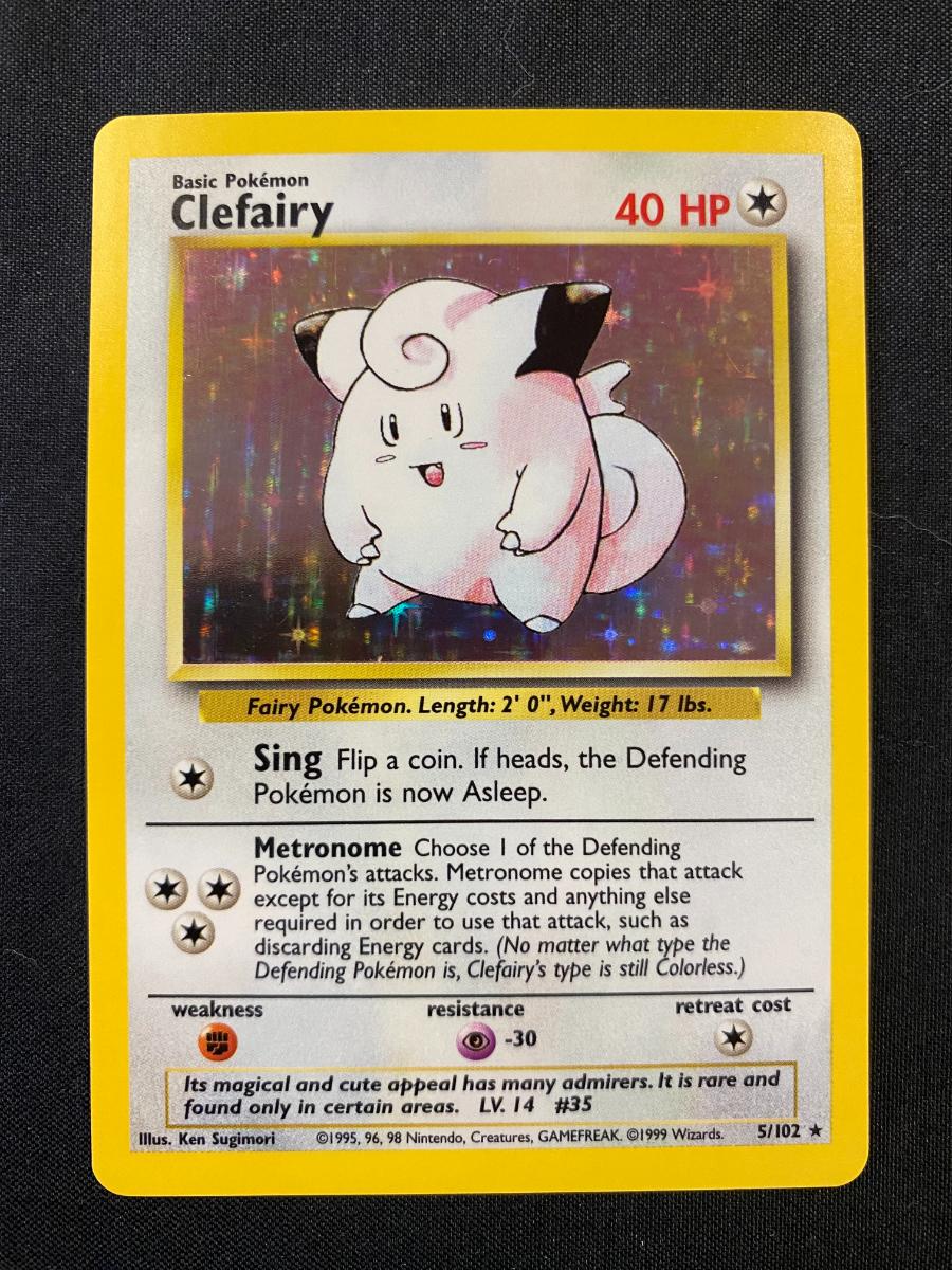 Clefairy holographic card from the Pokemon Base Set series. Card number 5/102, released in 1999 by Wizards of the Coast. Condition is light play, with minor surface wear visible under inspection. This version is not a 1st Edition, as specified.