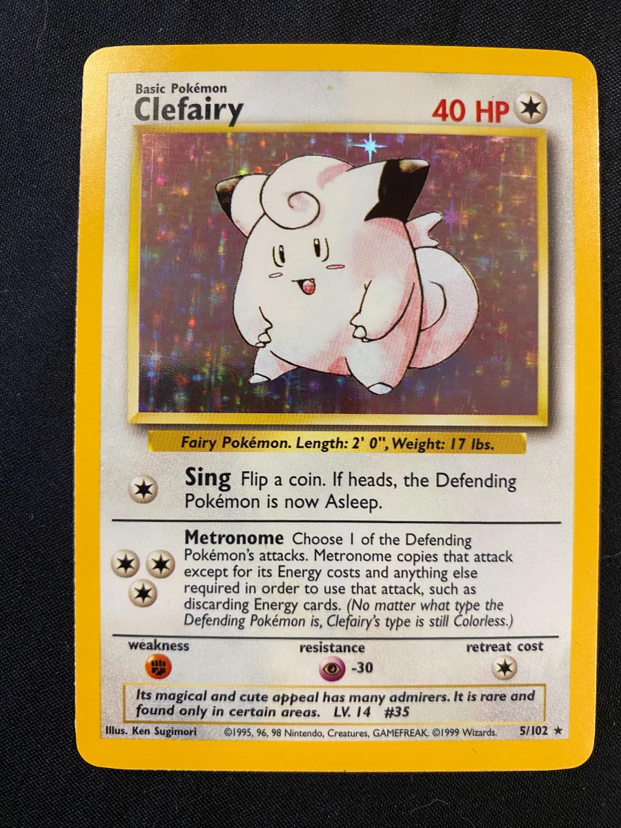 Basic Pokemon card from the Unlimited variant of Base Set. Clefairy is a rare holo card, No. 35 in the Pokedex with card number 5/102. Initially released in 1999 by Wizards of the Coast. Condition described as light play, with signs of handling yet no major damage affecting card legibility. Features Fairy Pokemon with 40 HP.