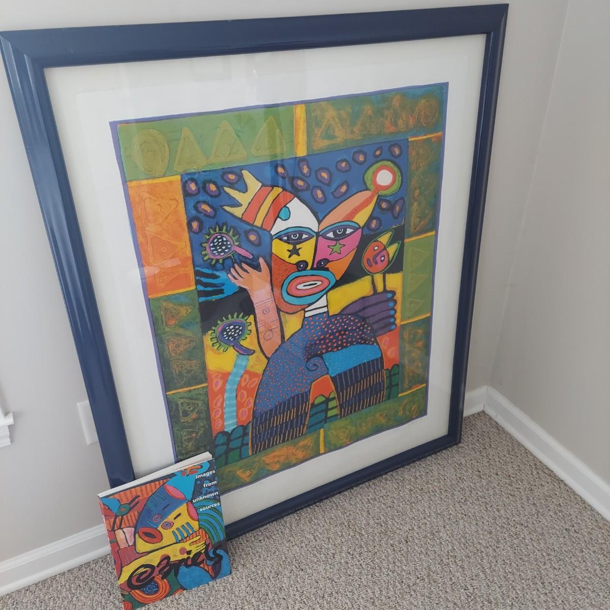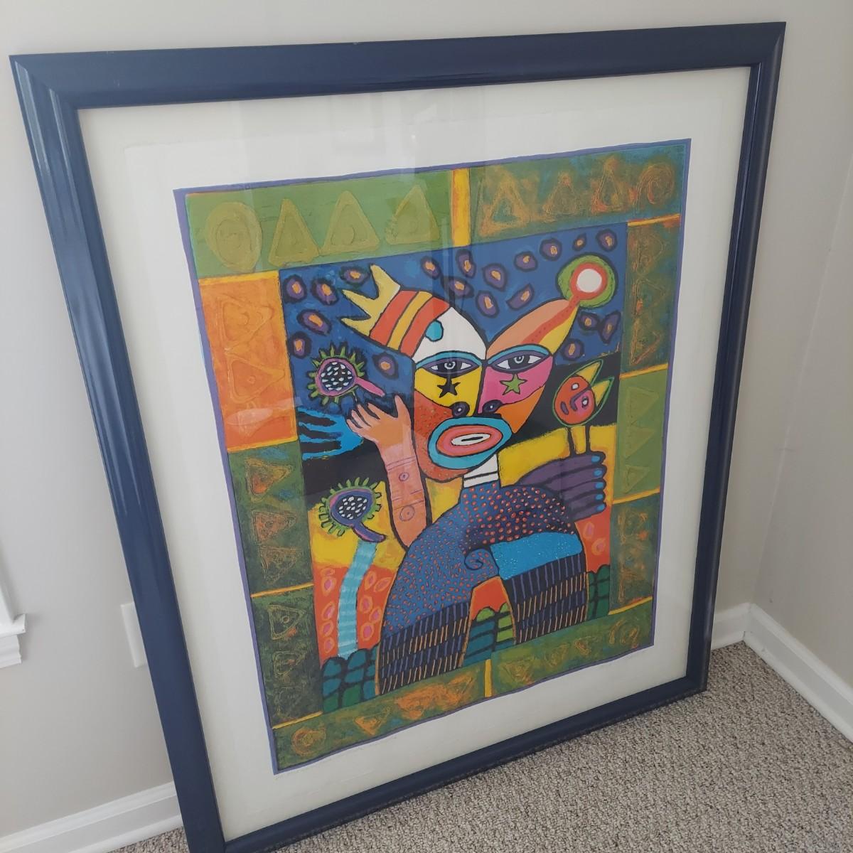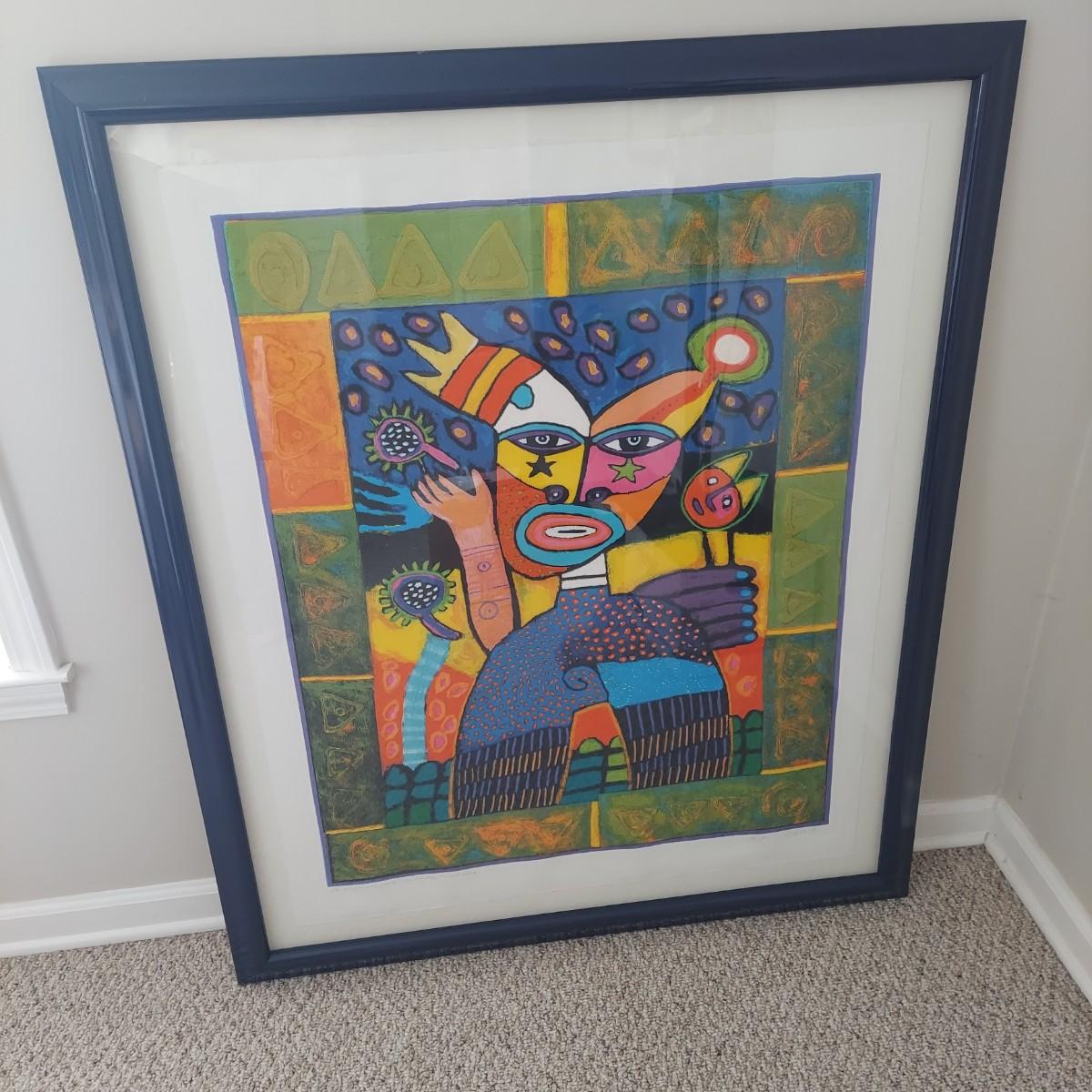 Large piece of art is framed under glass in a mat-free style. The wooden frame measures 39” x 46"H. Also includes a paperback coffee table book about Briels’ art. Please see photos for details. Shipping available. Shipping certain items can be costly. We suggest contacting our preferred local shipping provider, Postage Express, with dimensions and getting an estimate before bidding: (828) 255-9250 or shipping@postageexpressnc.com