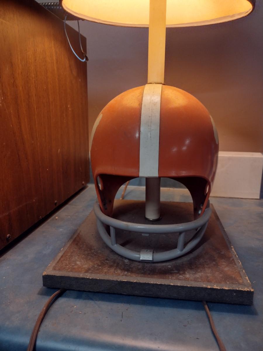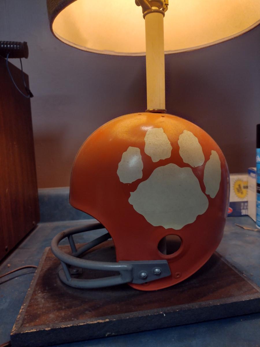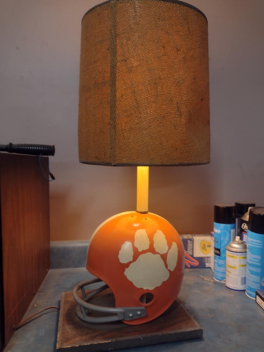Clemson Tigers Helmet Lamp on Wooden Base. Approx 26 1/2" to top of shade.