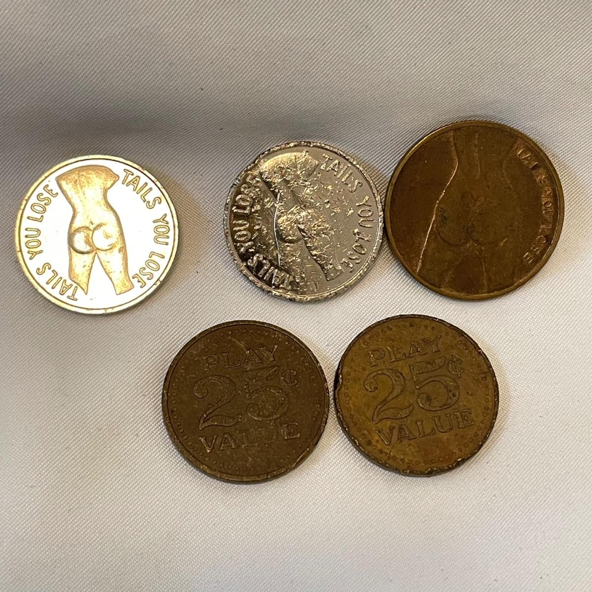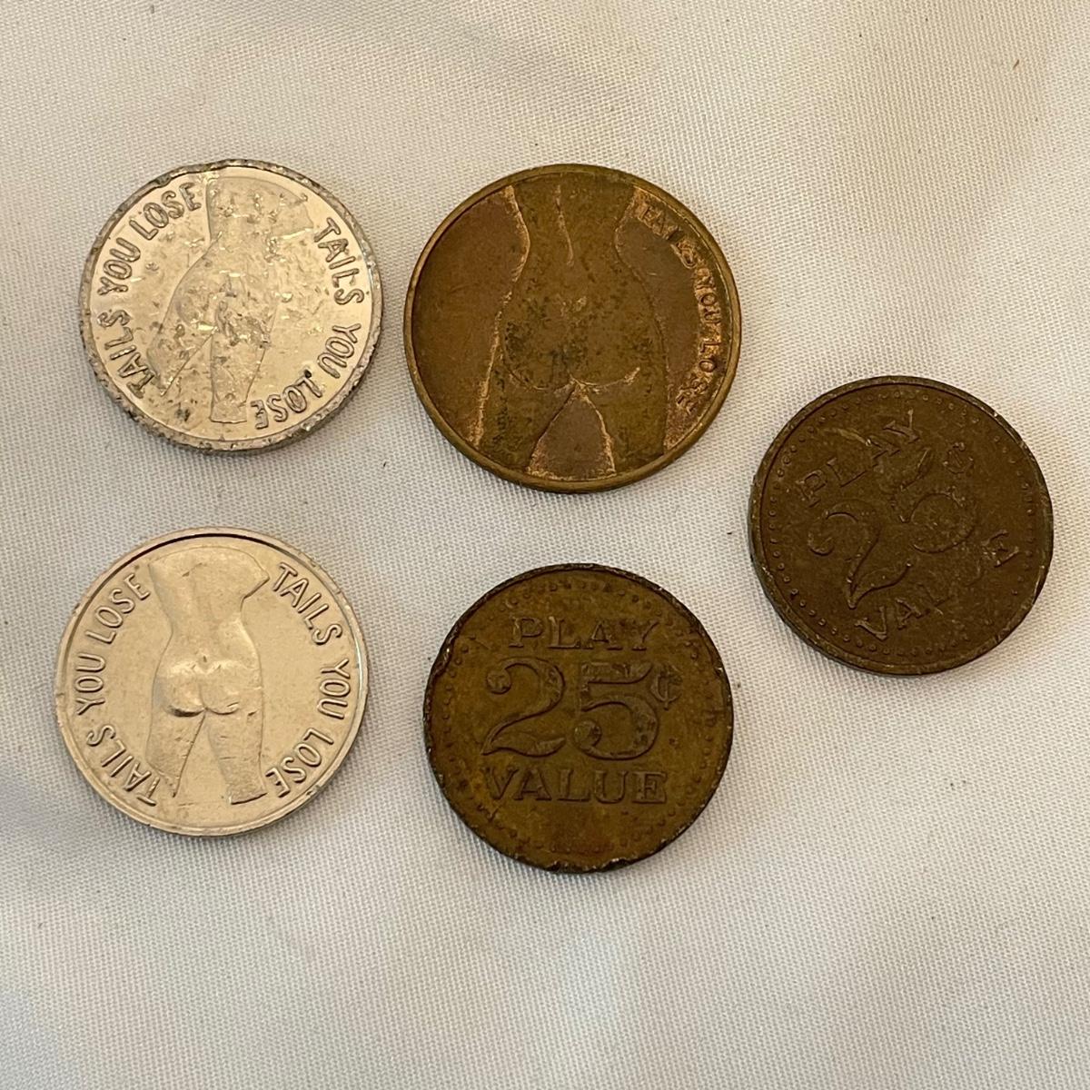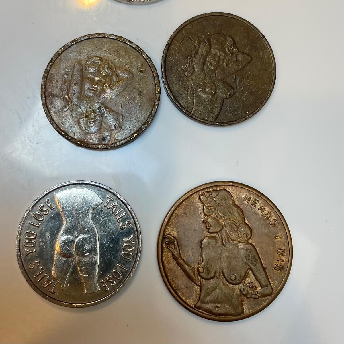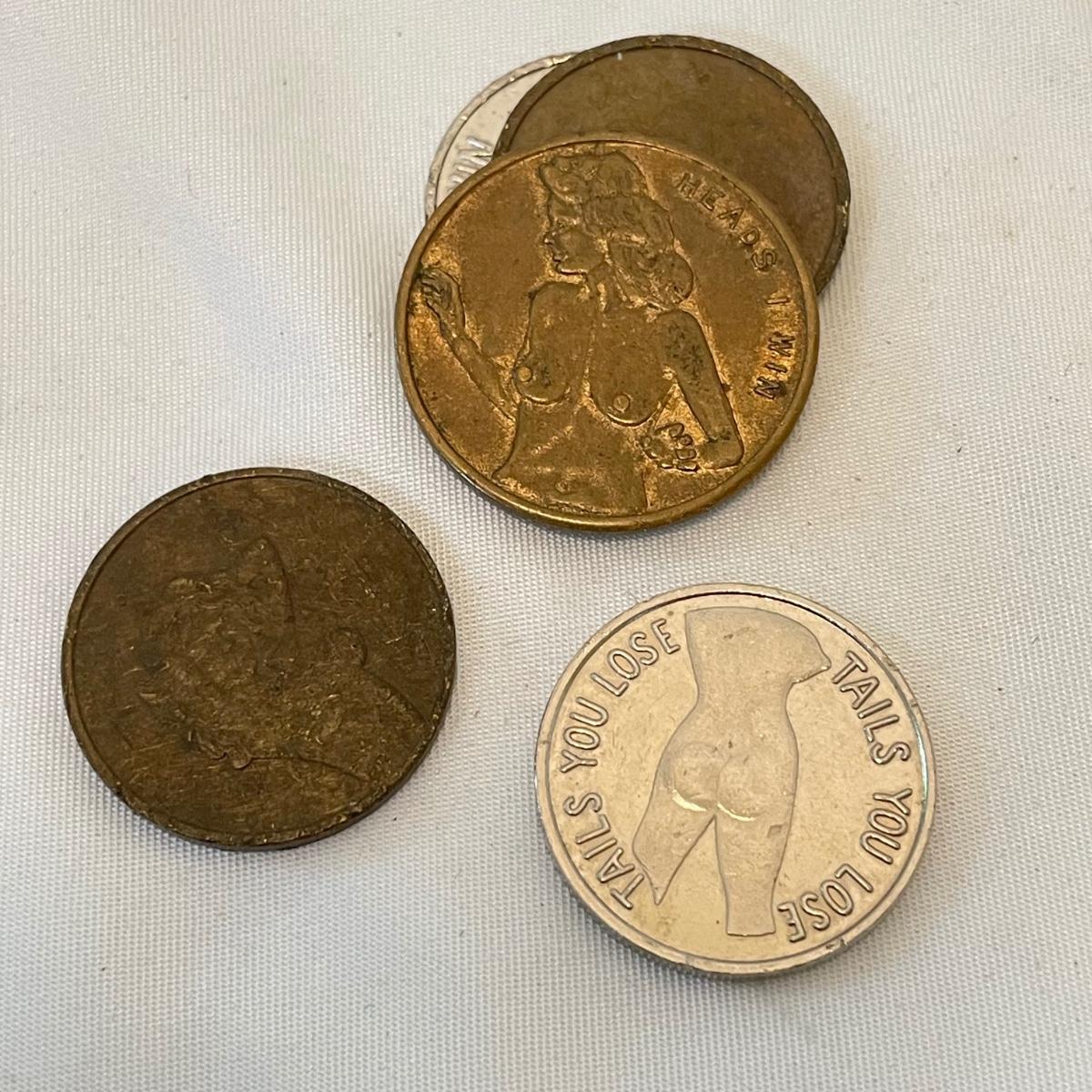 Lot has over 30 fun, interesting coins and tokens. Featuring five risqué tokens, (three are “Heads I win, Tails you lose”), a Grover Cleveland campaign token and a Masonic penny. Lot includes several other collectible tokens. All are metal except the off-white Post #2445 drink token which appears to be plastic. See images. Shipping available. All sales are final. No returns or refunds. Please bid accordingly.
