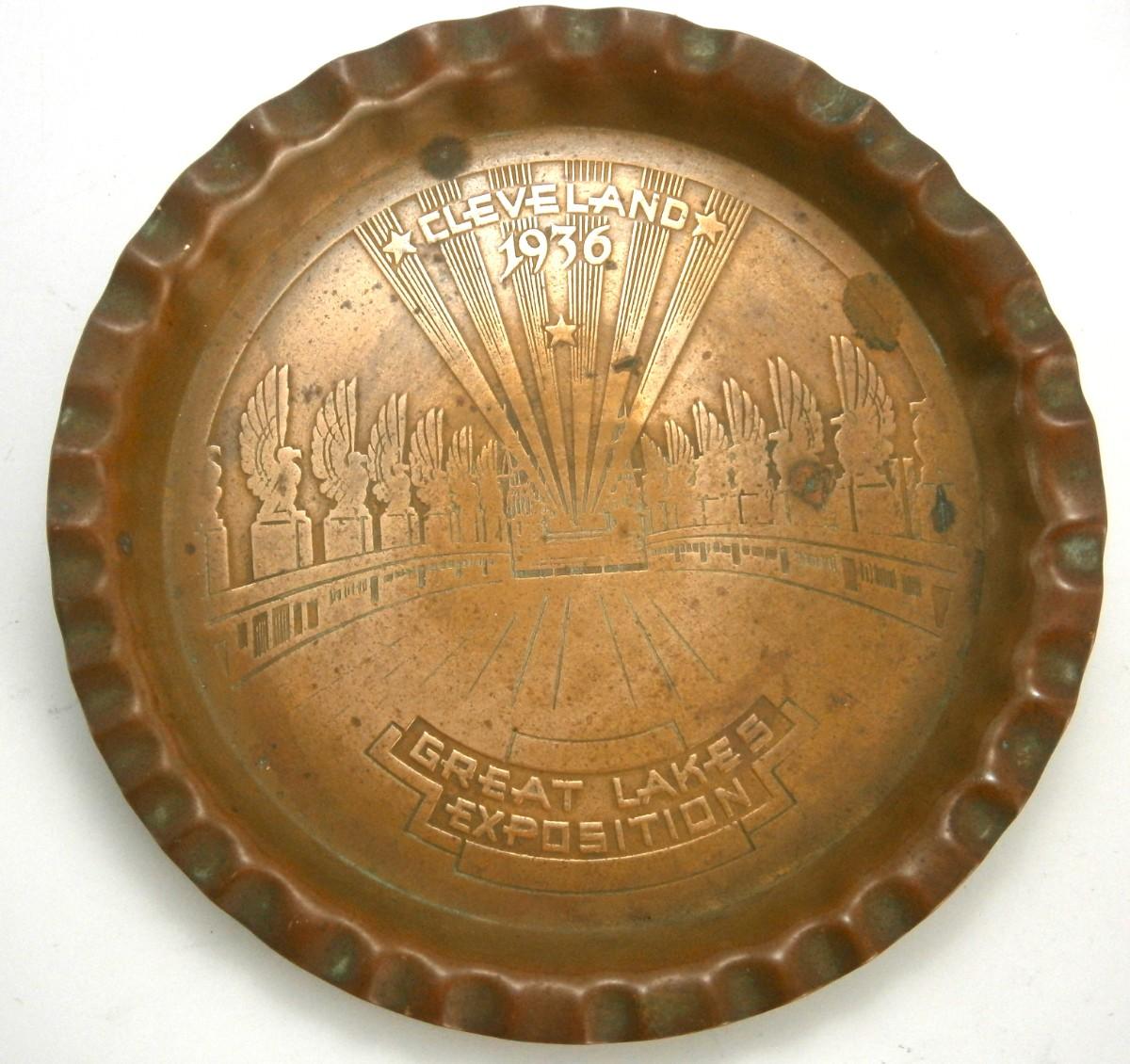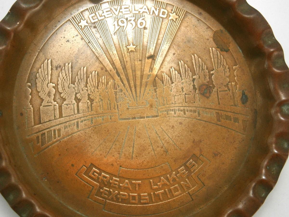 Cleveland 1936 GREAT LAKES EXPOSITION Souvenir Tray, 3 3/4 in. diameter, stamped copper.