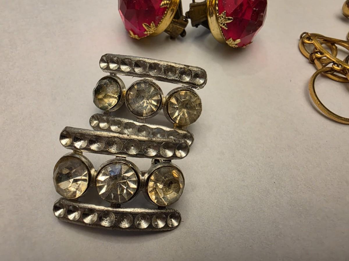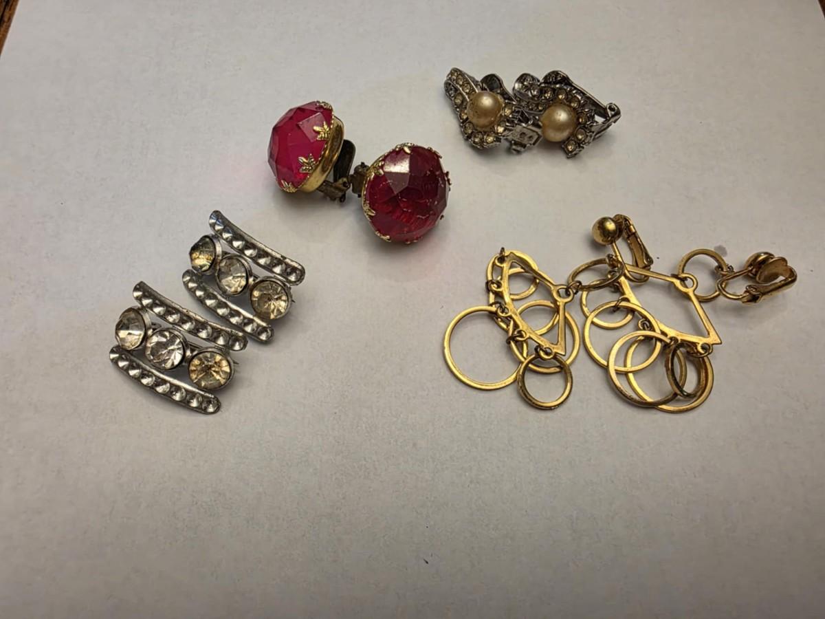 4 pair, red ruby colored are plastic jewels, have gold dangle, one is faux pearl, rhinestone pair present also