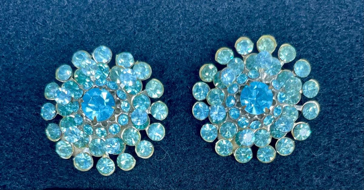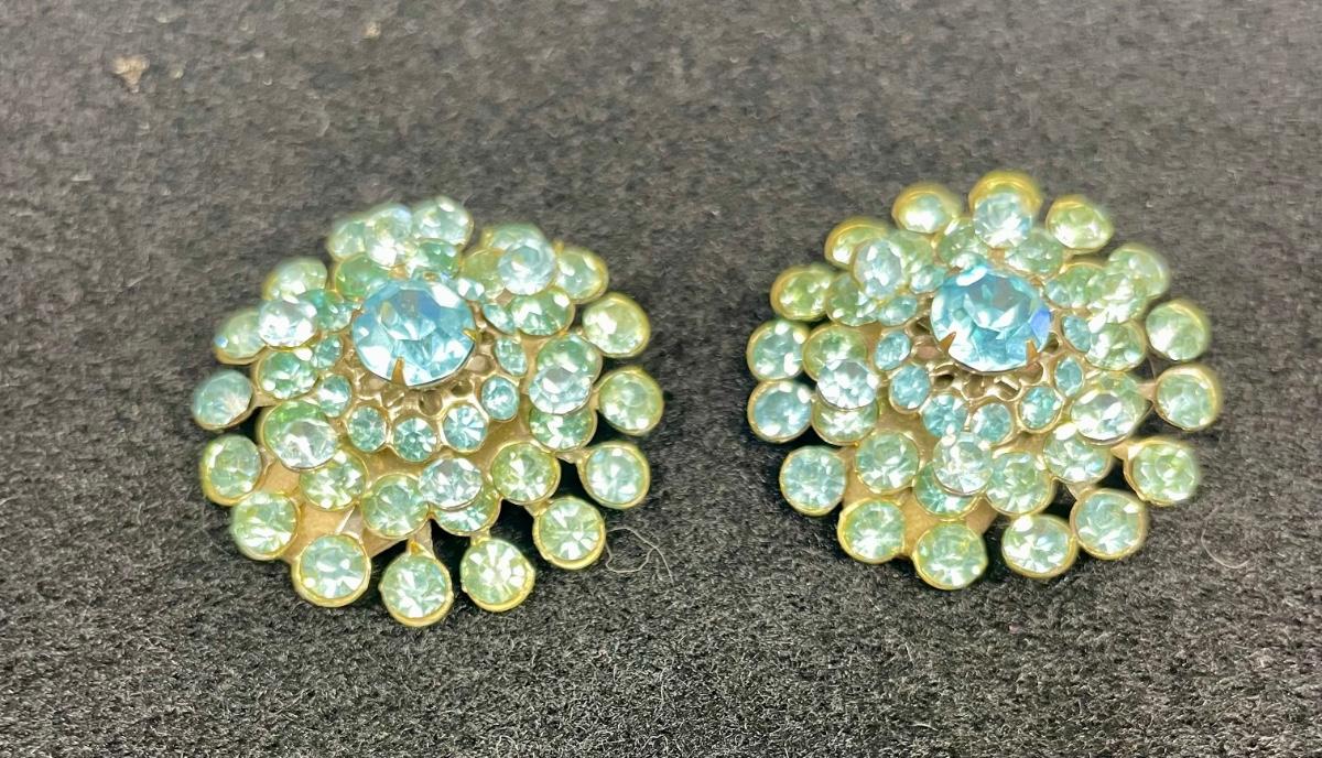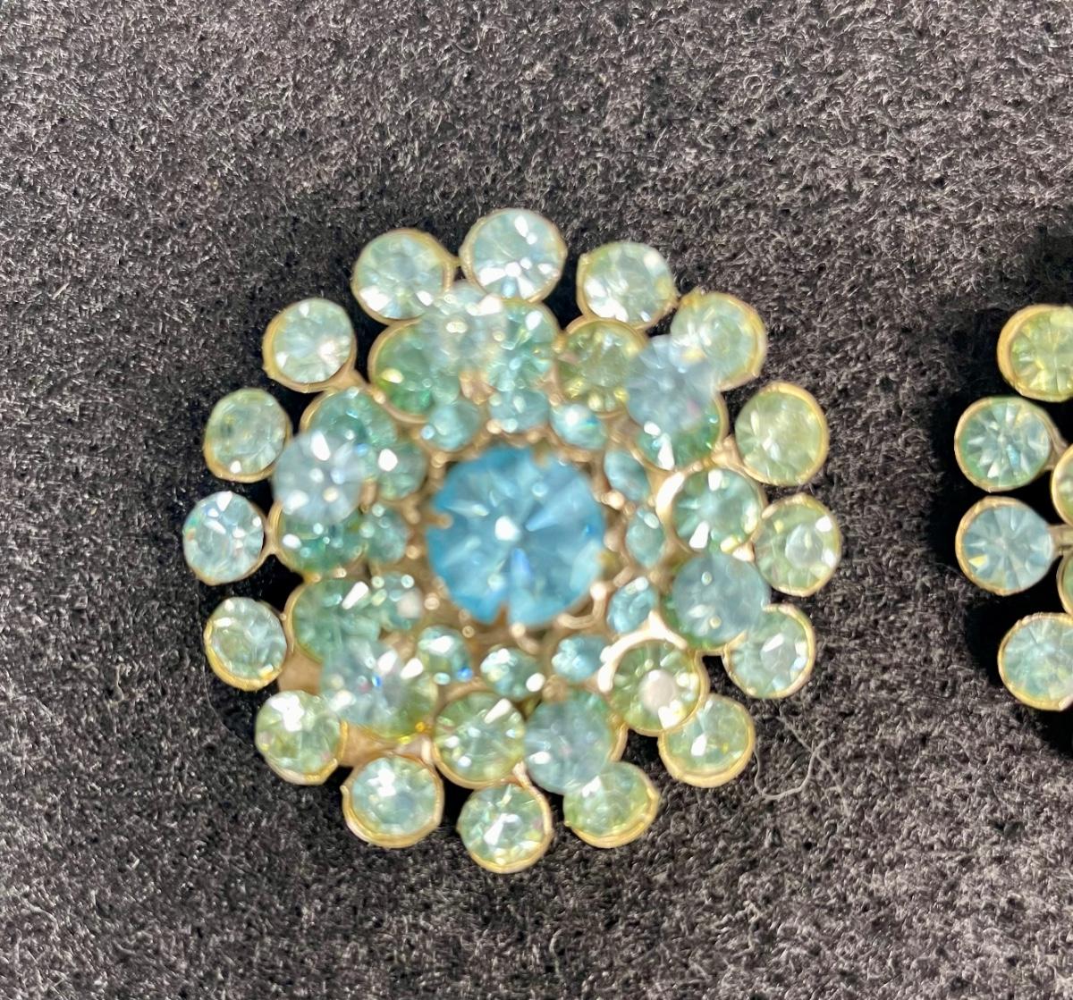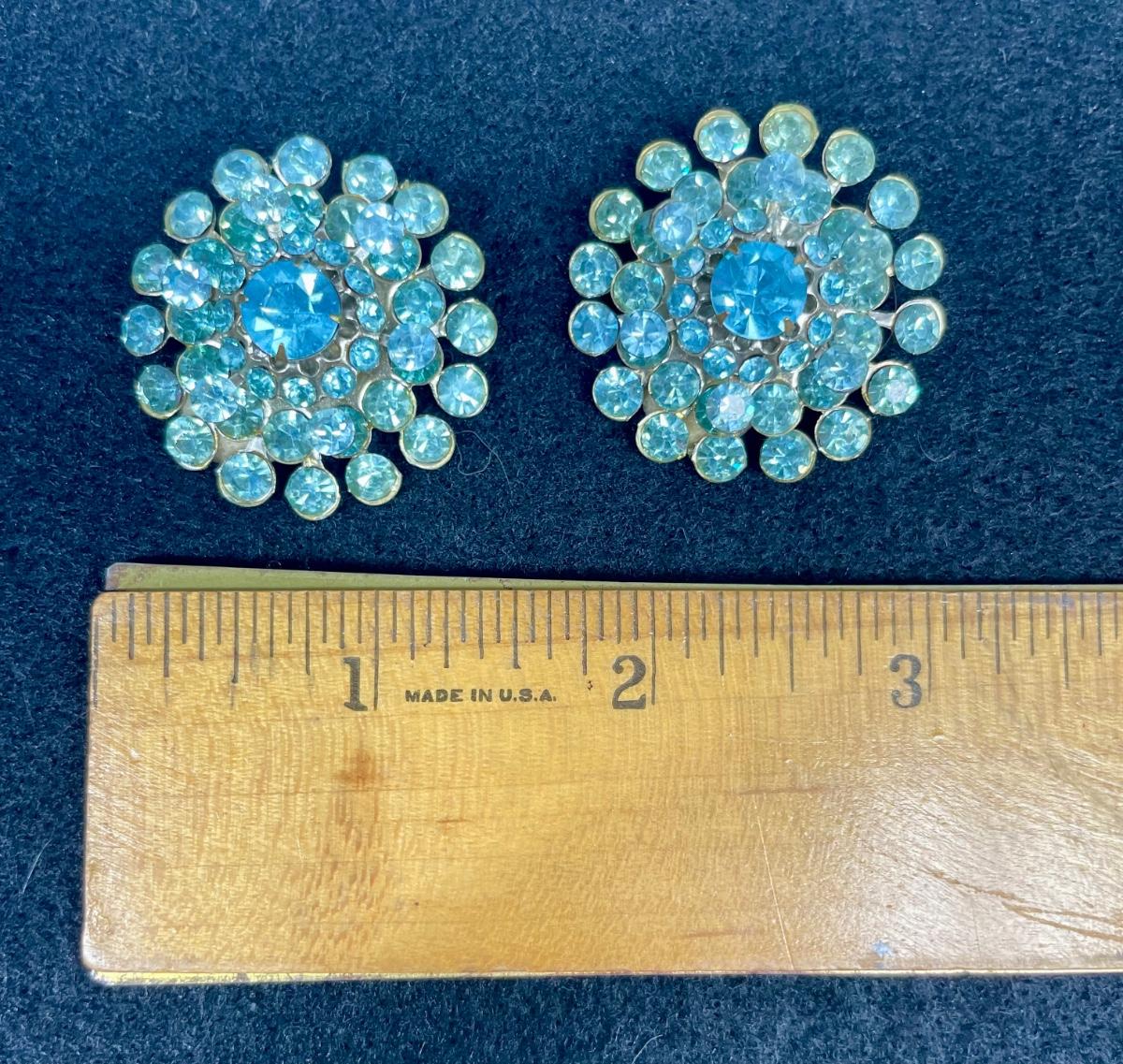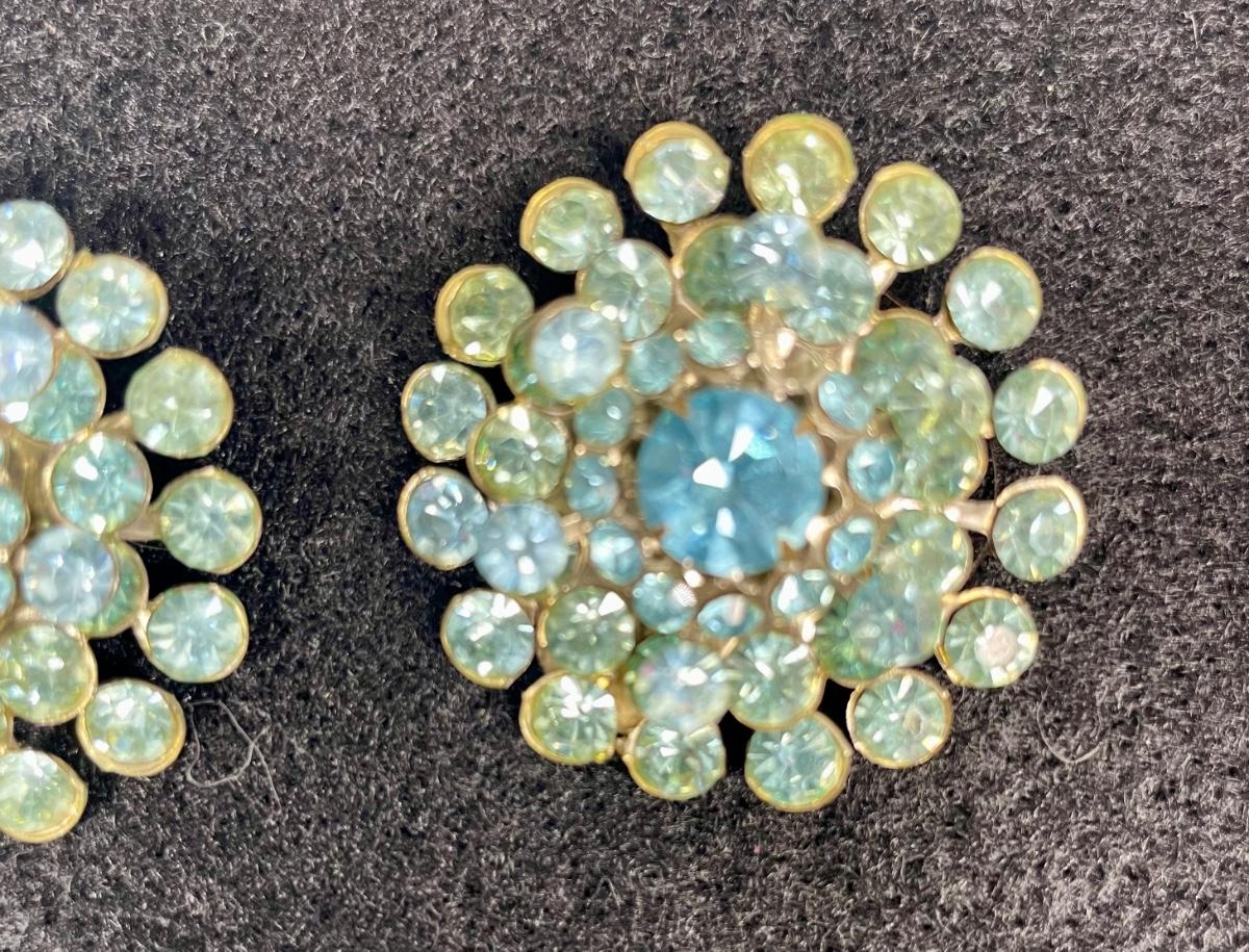 Blue-tint clip-on earrings. 1 small stone looks to be missing from the right earring, loot closely at the photos (not very noticeable).