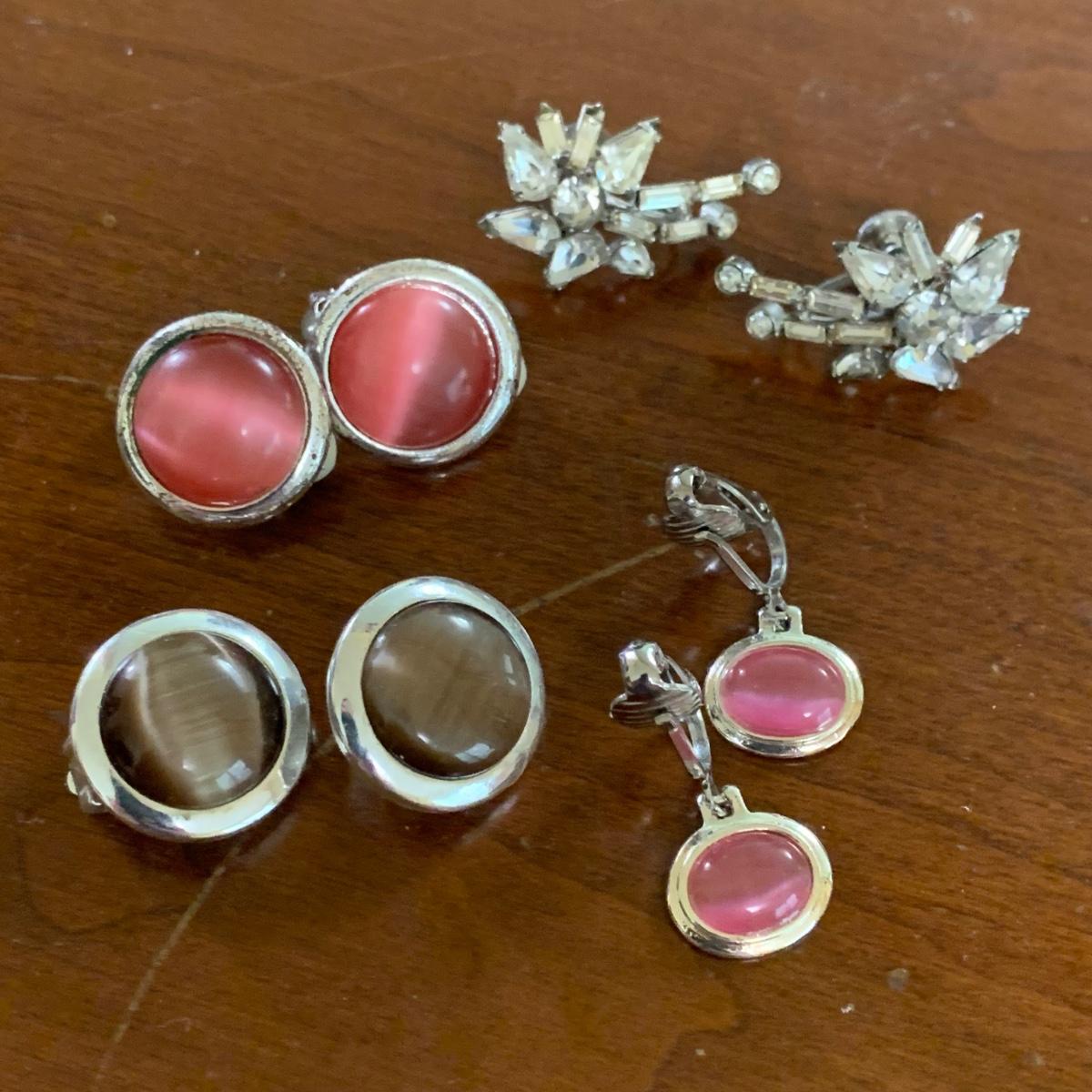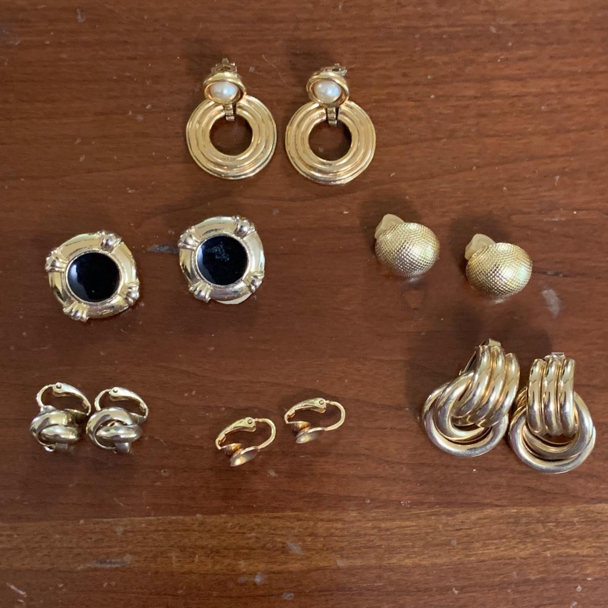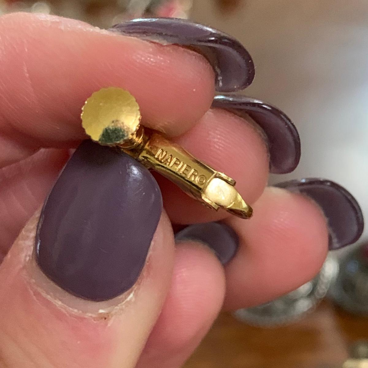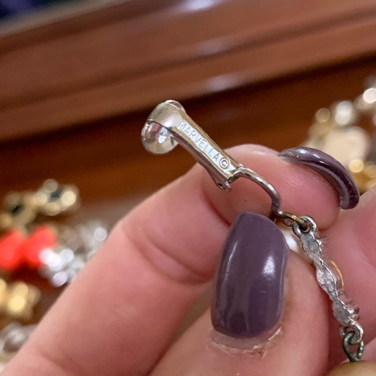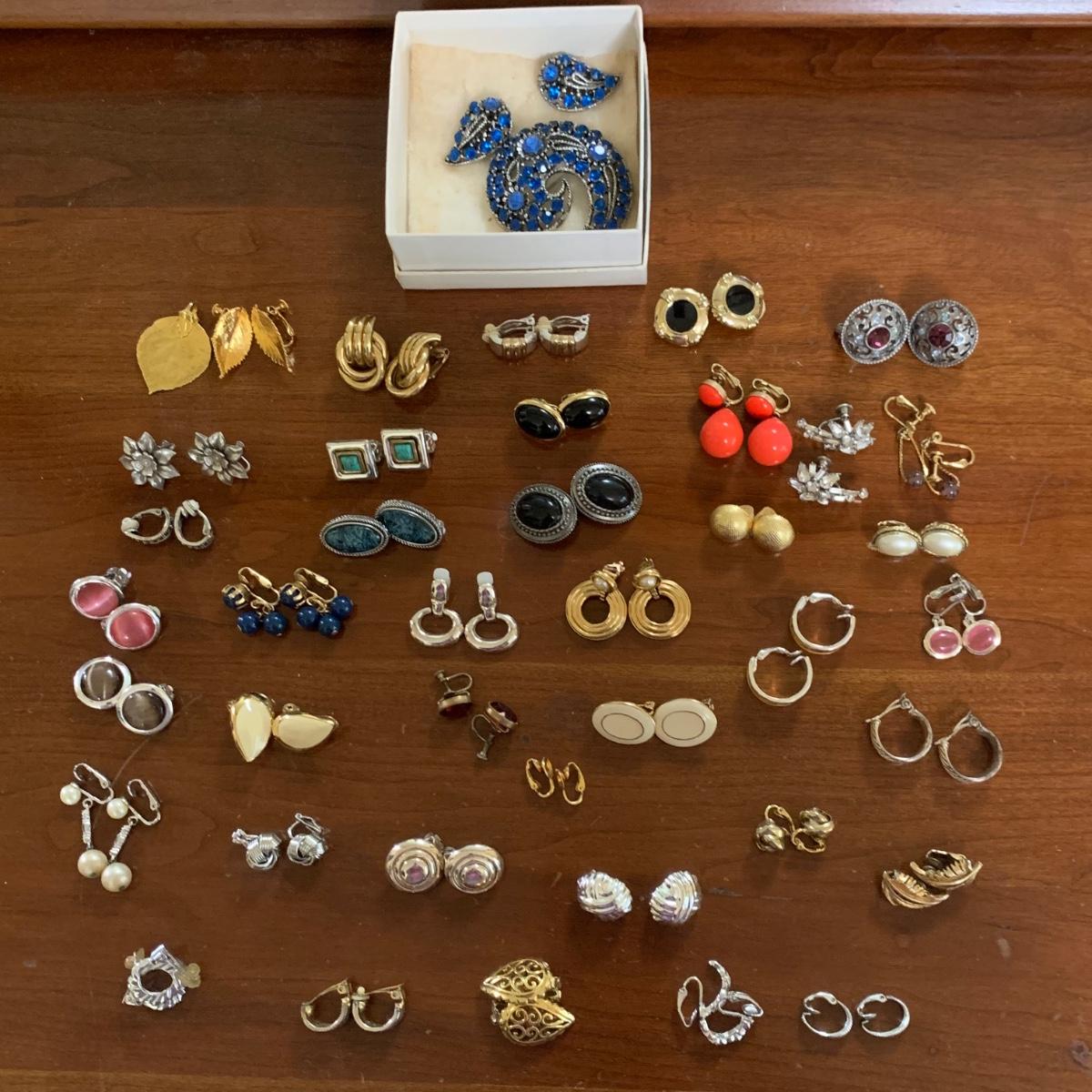 40 pairs of clip-on earrings. Brands include Monet, Trifari, Napier and Marvella. One pair comes with a matching pendant and one pair has a matching brooch. Two pairs of earrings are marked Sterling/925. All are metal with a variety of different gemstones and designs.