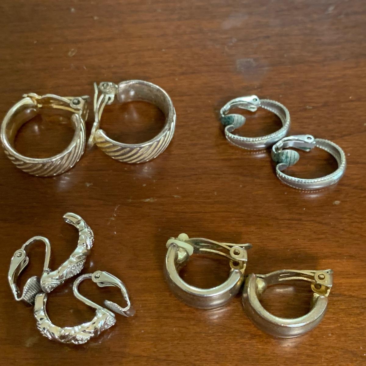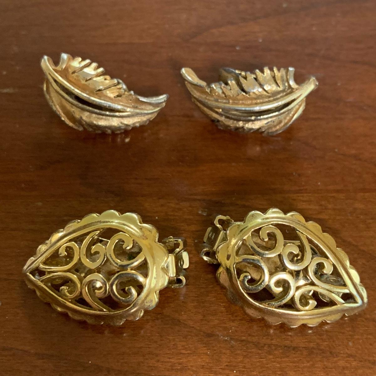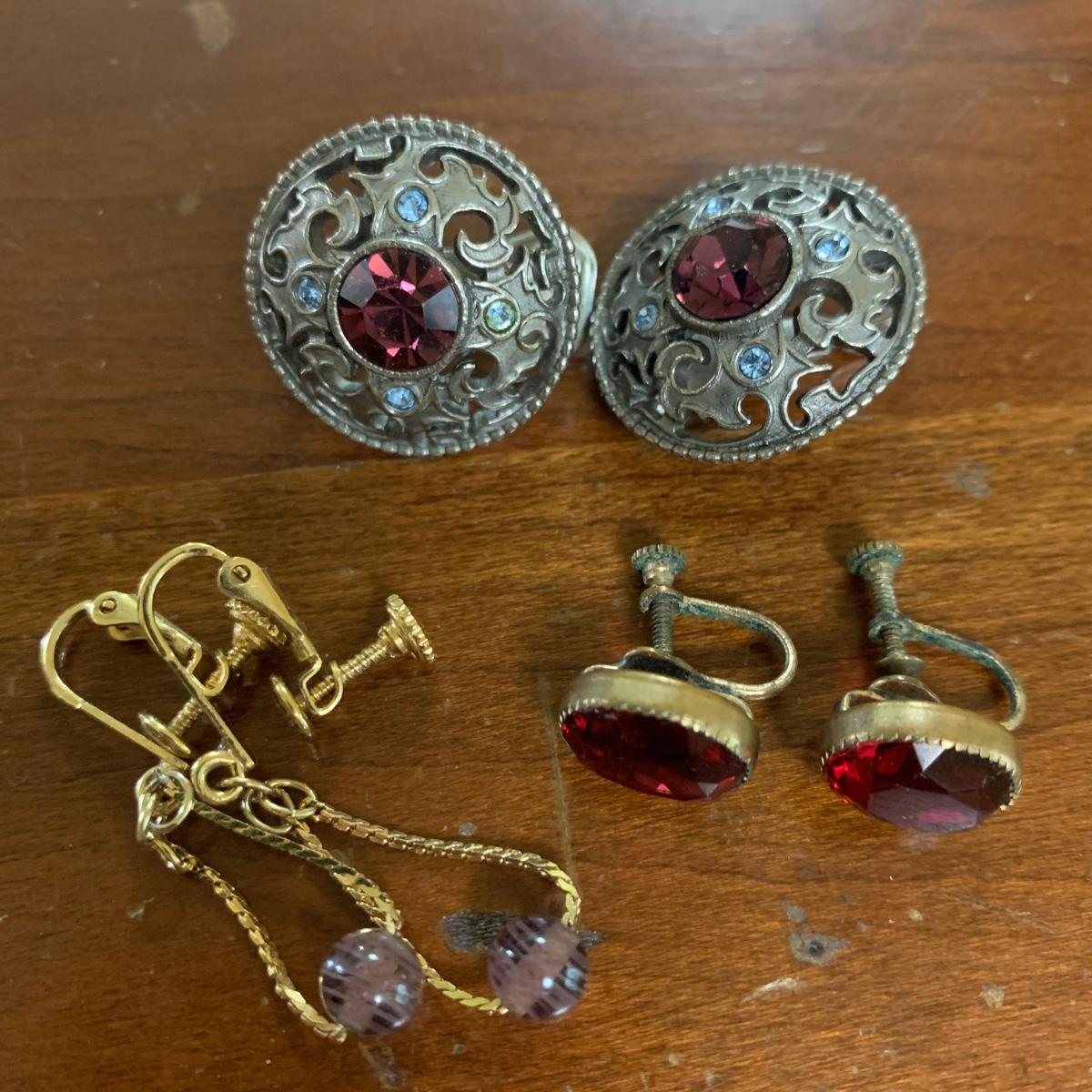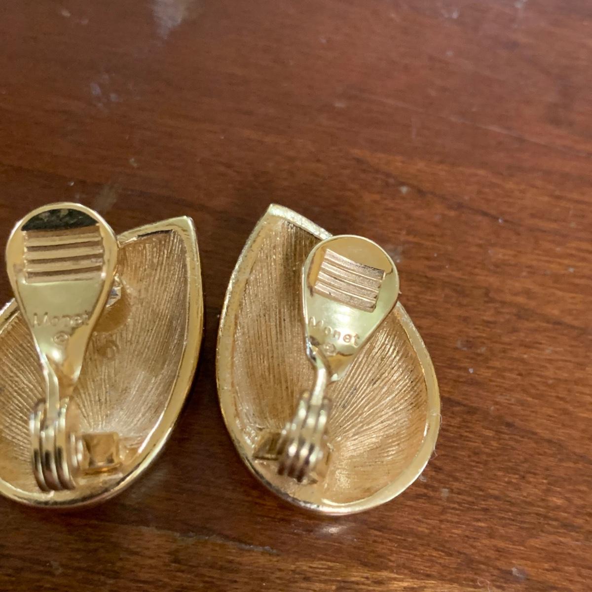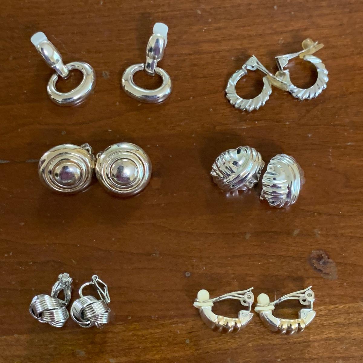 40 pairs of clip-on earrings. Brands include Monet, Trifari, Napier and Marvella. One pair comes with a matching pendant and one pair has a matching brooch. Two pairs of earrings are marked Sterling/925. All are metal with a variety of different gemstones and designs.