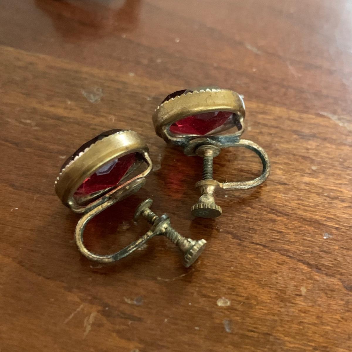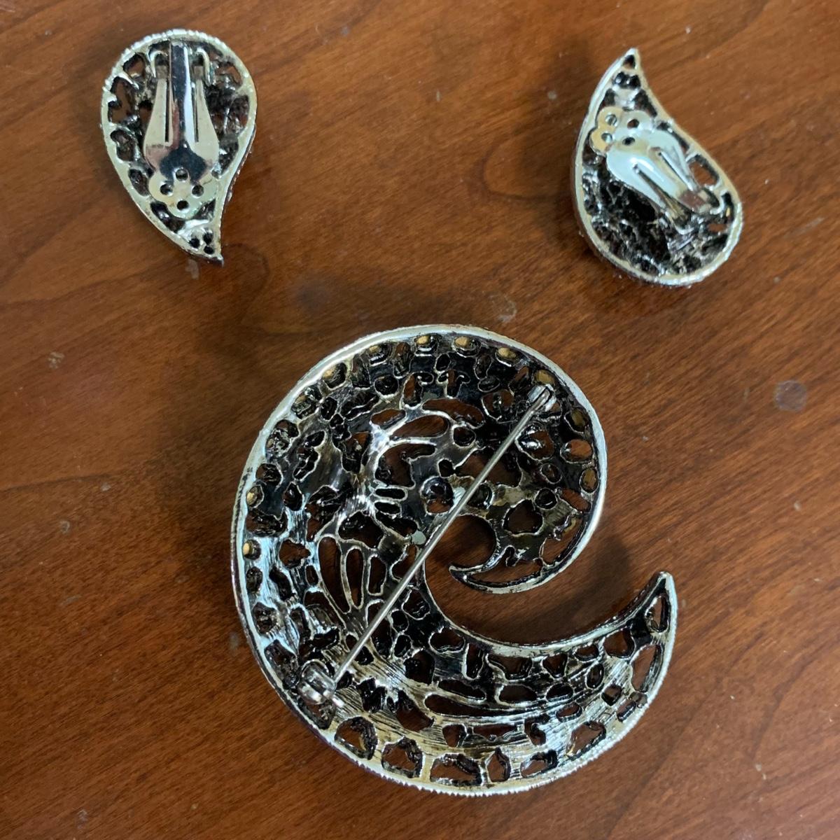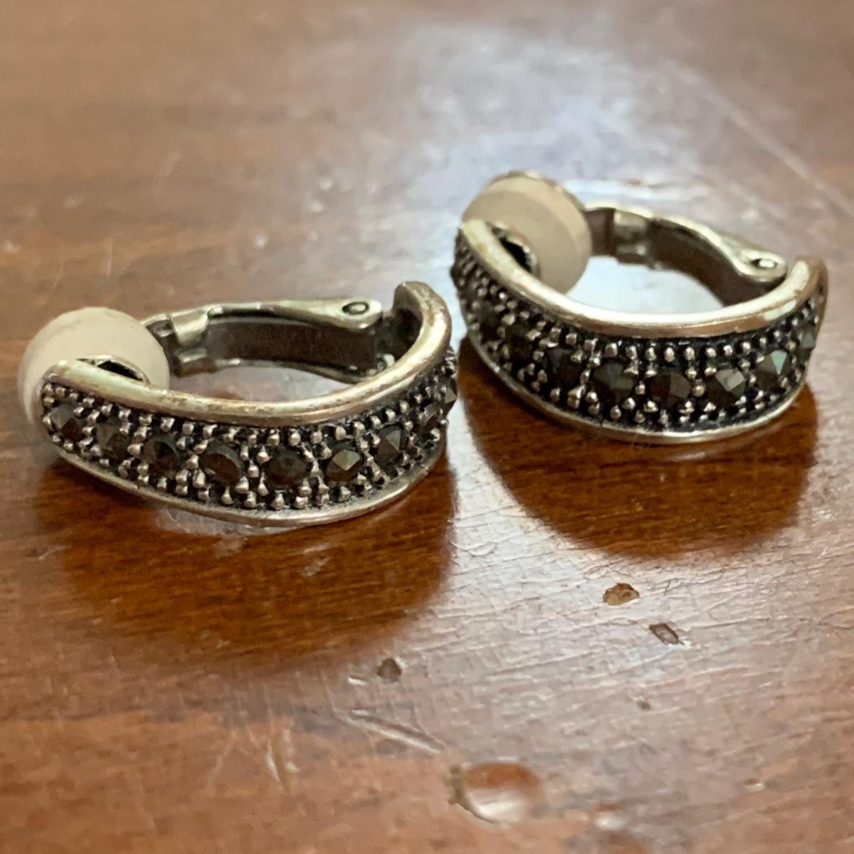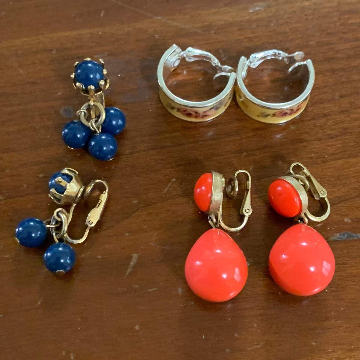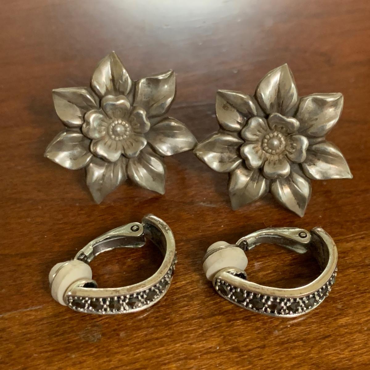 40 pairs of clip-on earrings. Brands include Monet, Trifari, Napier and Marvella. One pair comes with a matching pendant and one pair has a matching brooch. Two pairs of earrings are marked Sterling/925. All are metal with a variety of different gemstones and designs.