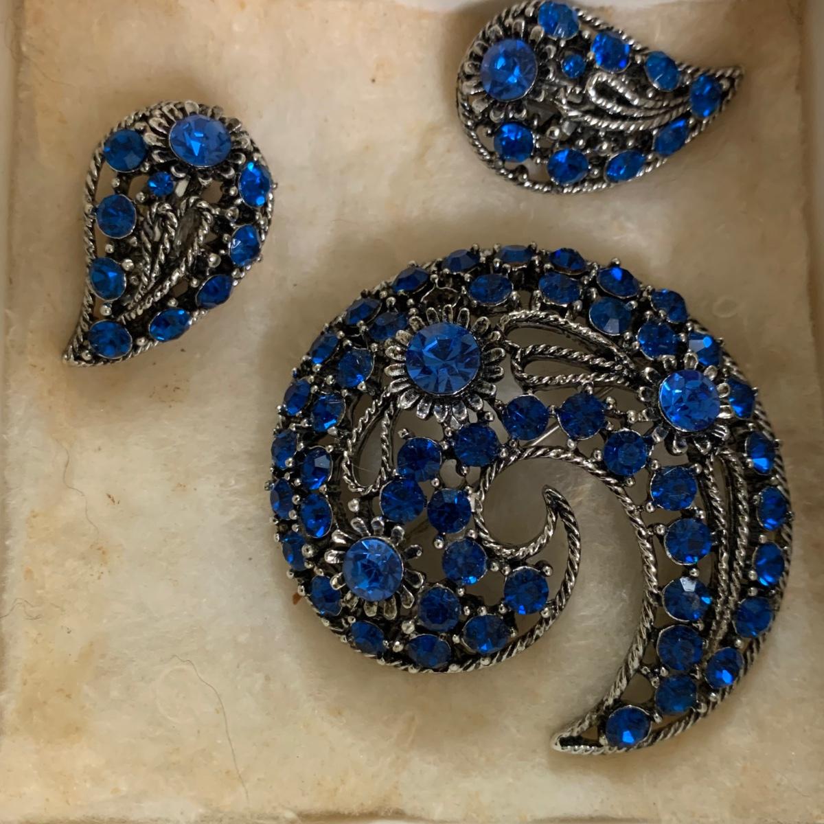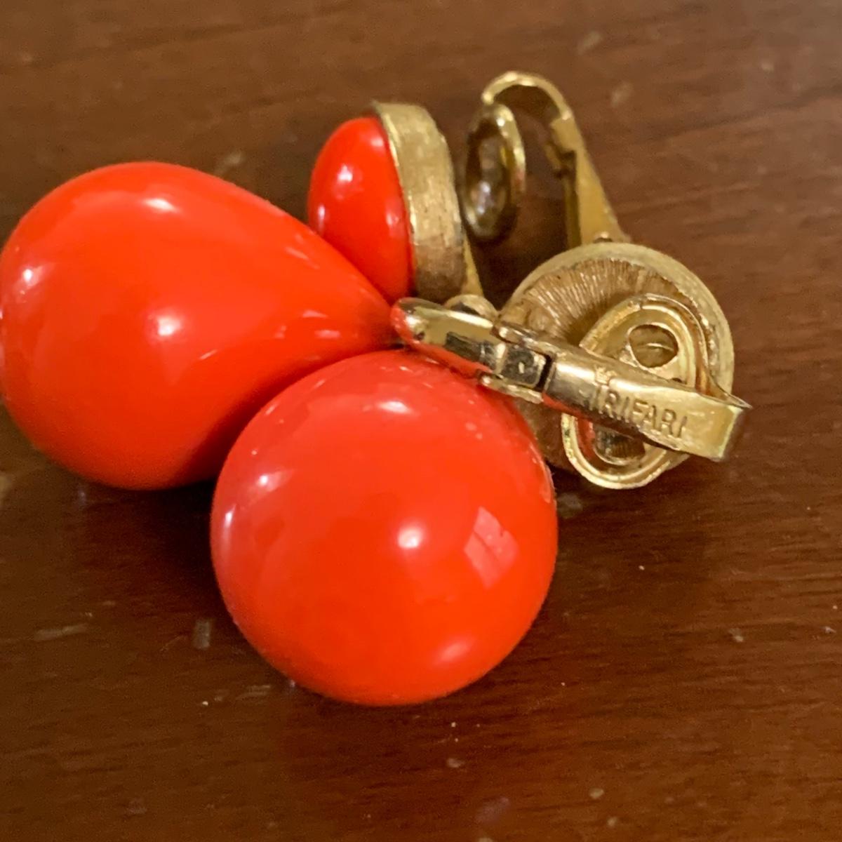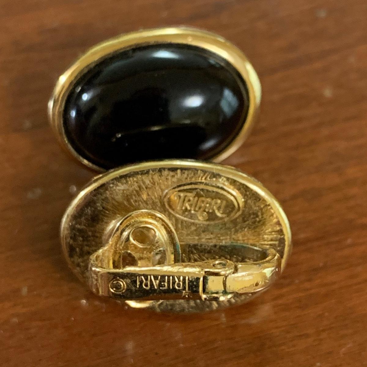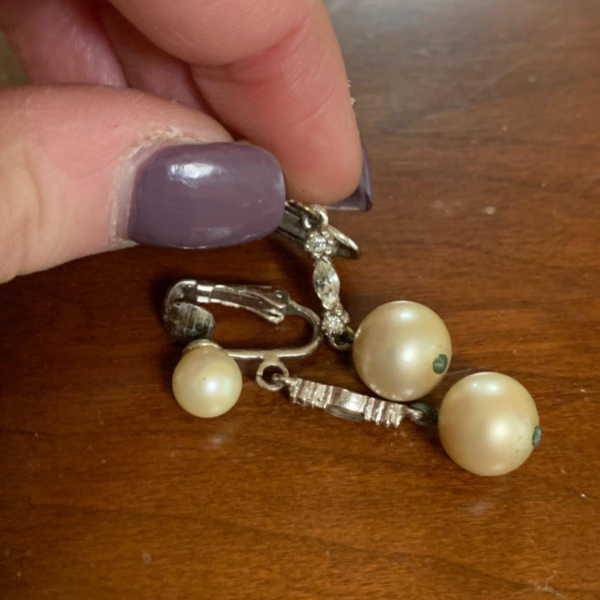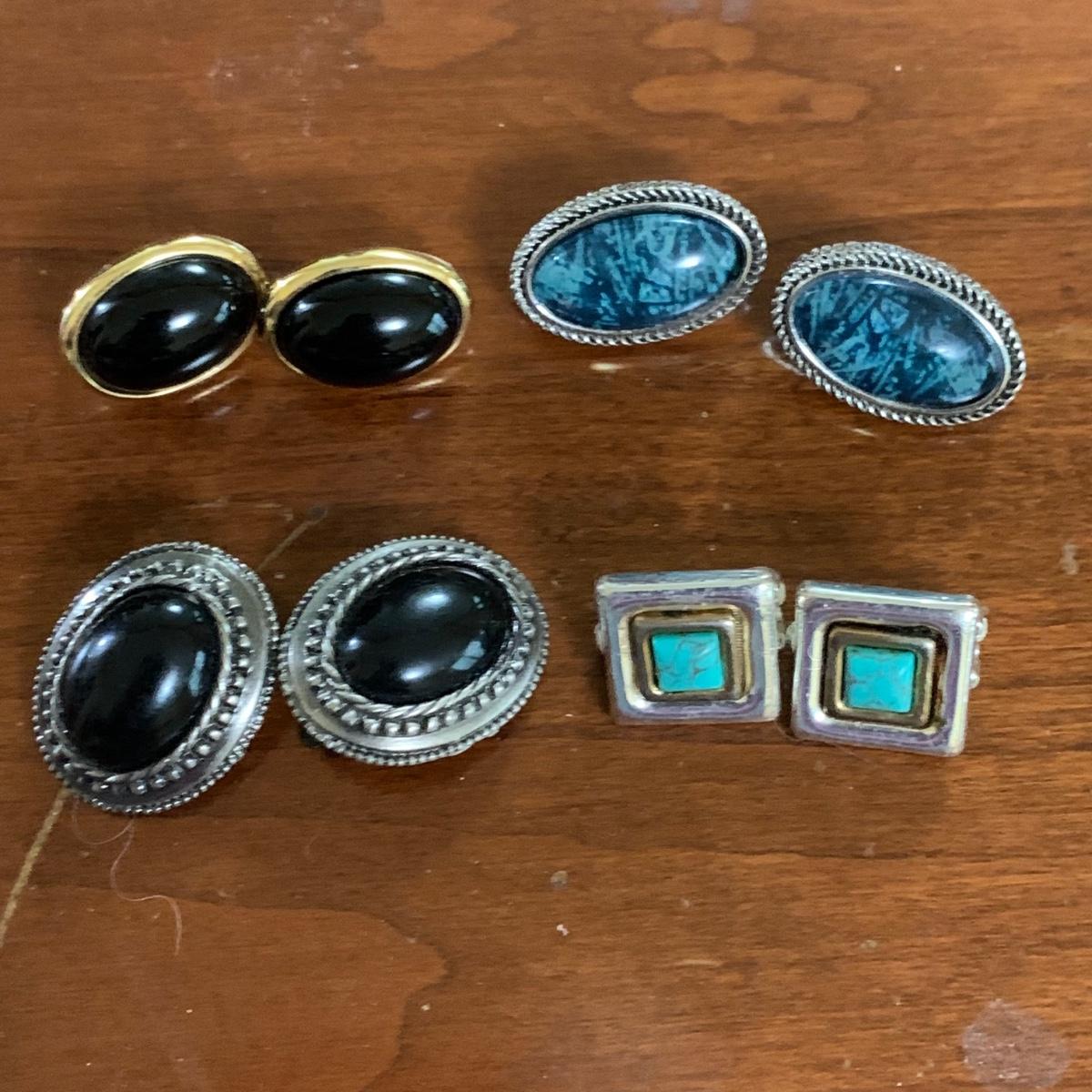40 pairs of clip-on earrings. Brands include Monet, Trifari, Napier and Marvella. One pair comes with a matching pendant and one pair has a matching brooch. Two pairs of earrings are marked Sterling/925. All are metal with a variety of different gemstones and designs.
