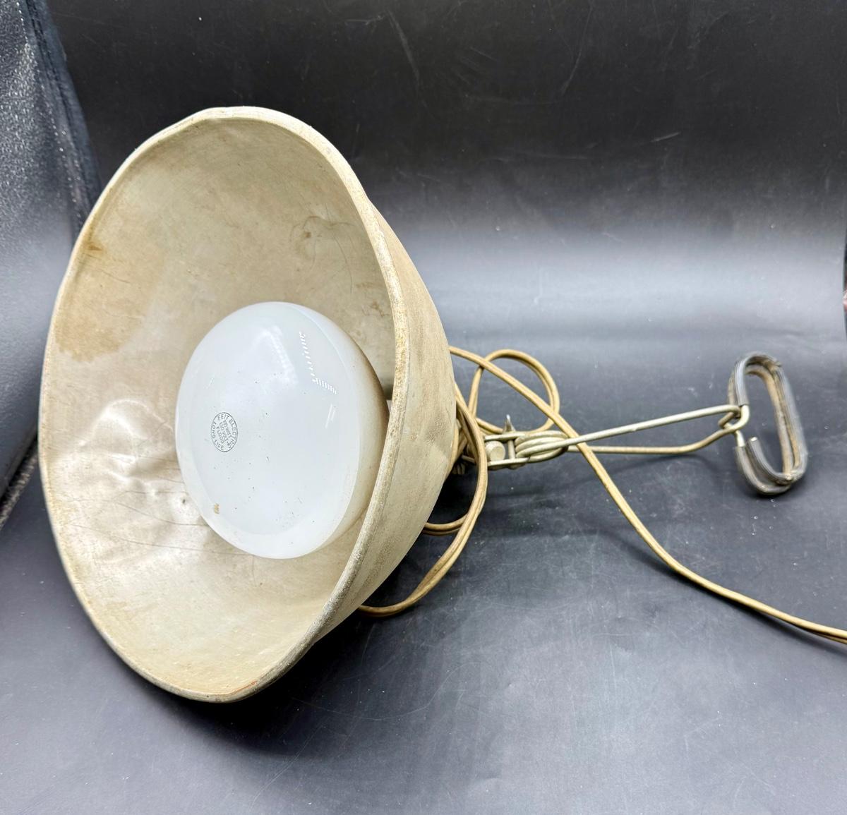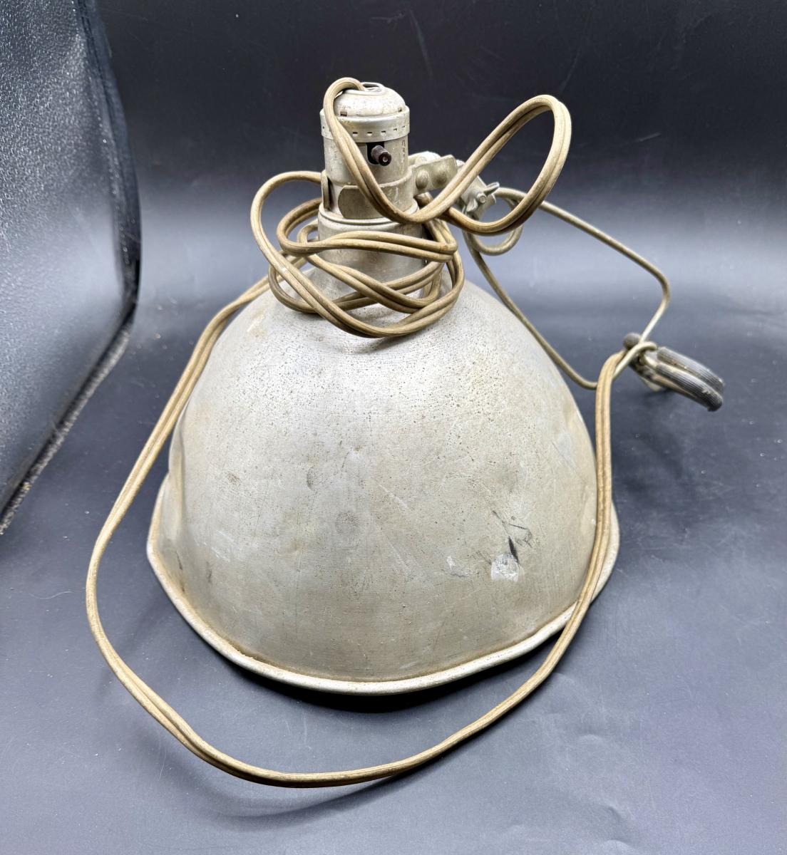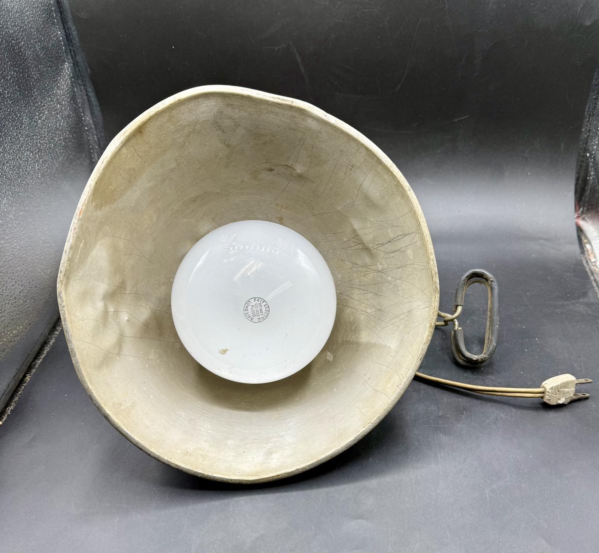 Battered and dinged aluminum shield, but in useable condition. Good attached clamp. Tested, works as expected. Shield is approx. 9” across.