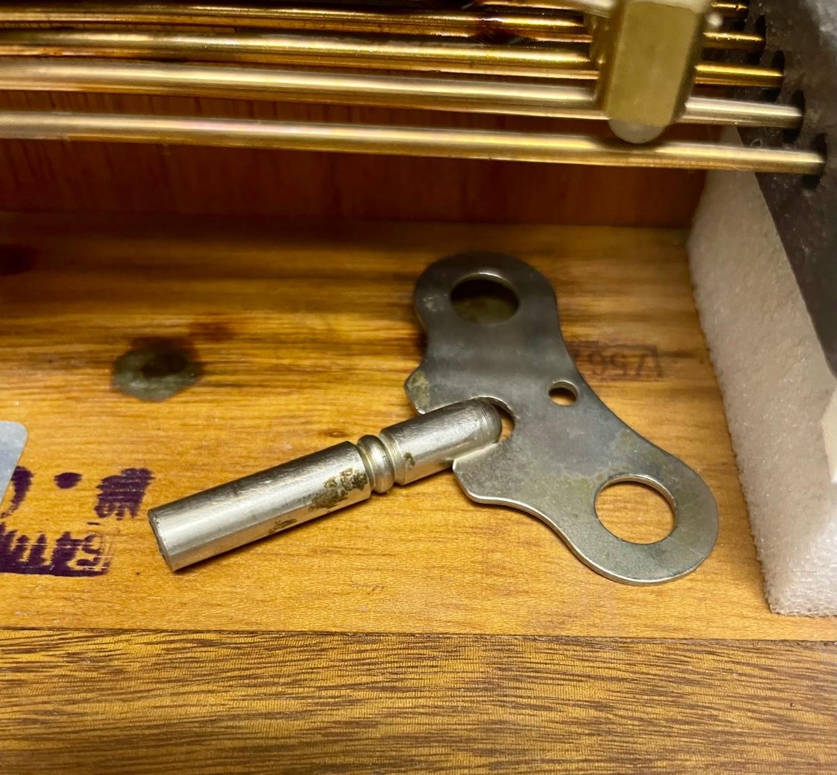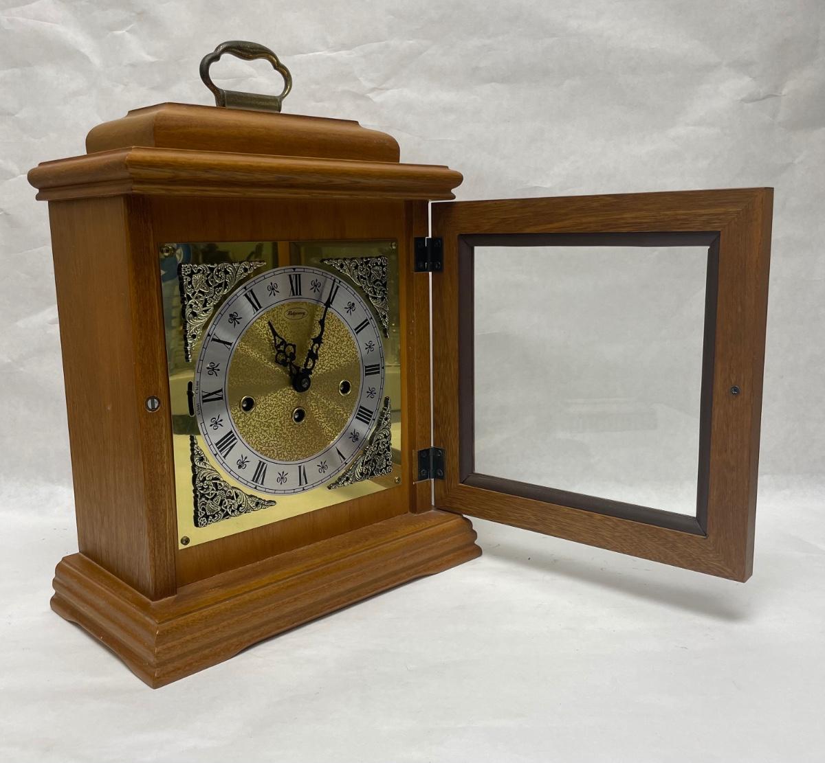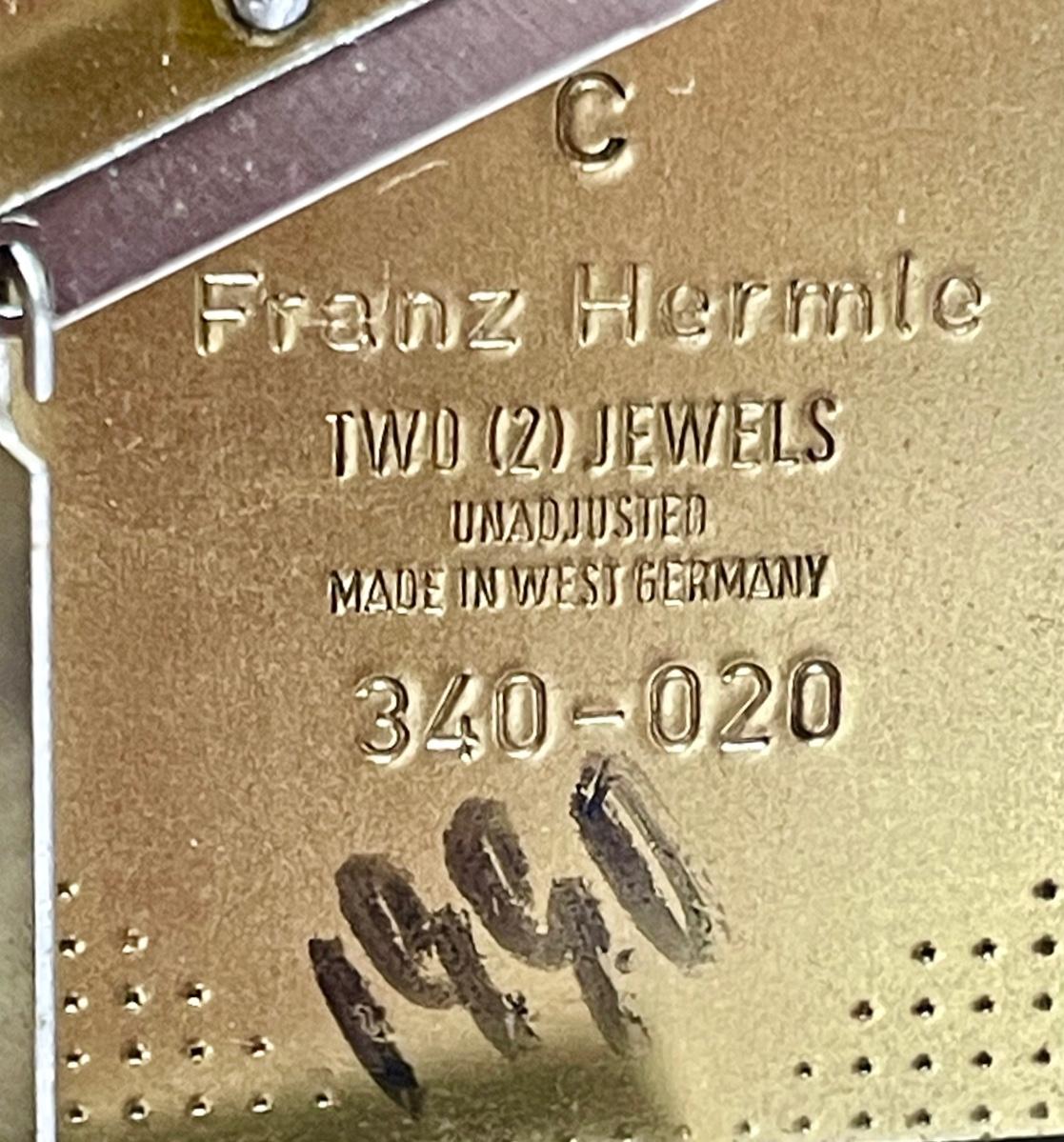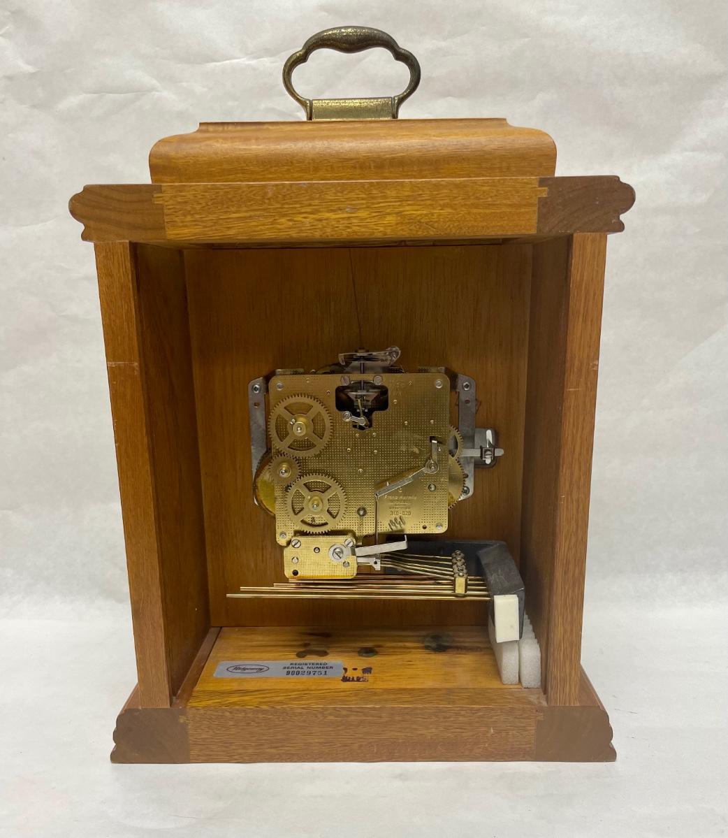 Clock has a fine wood case, removable wood door on back to access the clock mechanism and chimes, and a hinged glass door on the front to access the hands, the mechanism winders and chime on/off lever. Comes with original key. Franz Hermie movement and chimes made in West Germany. Tested, keeps good time and chimes on the quarter hour.