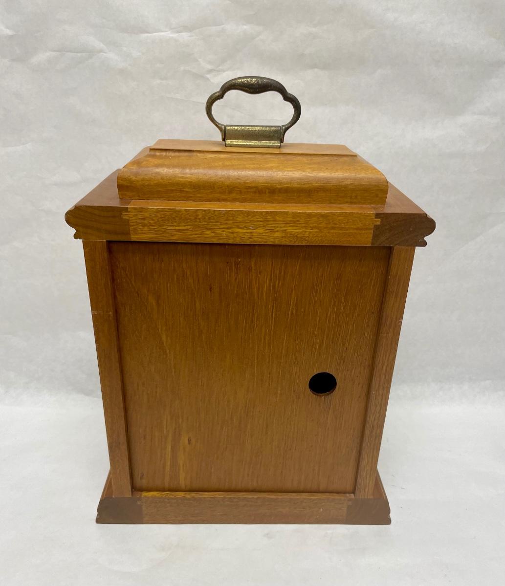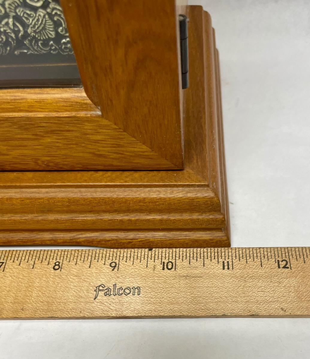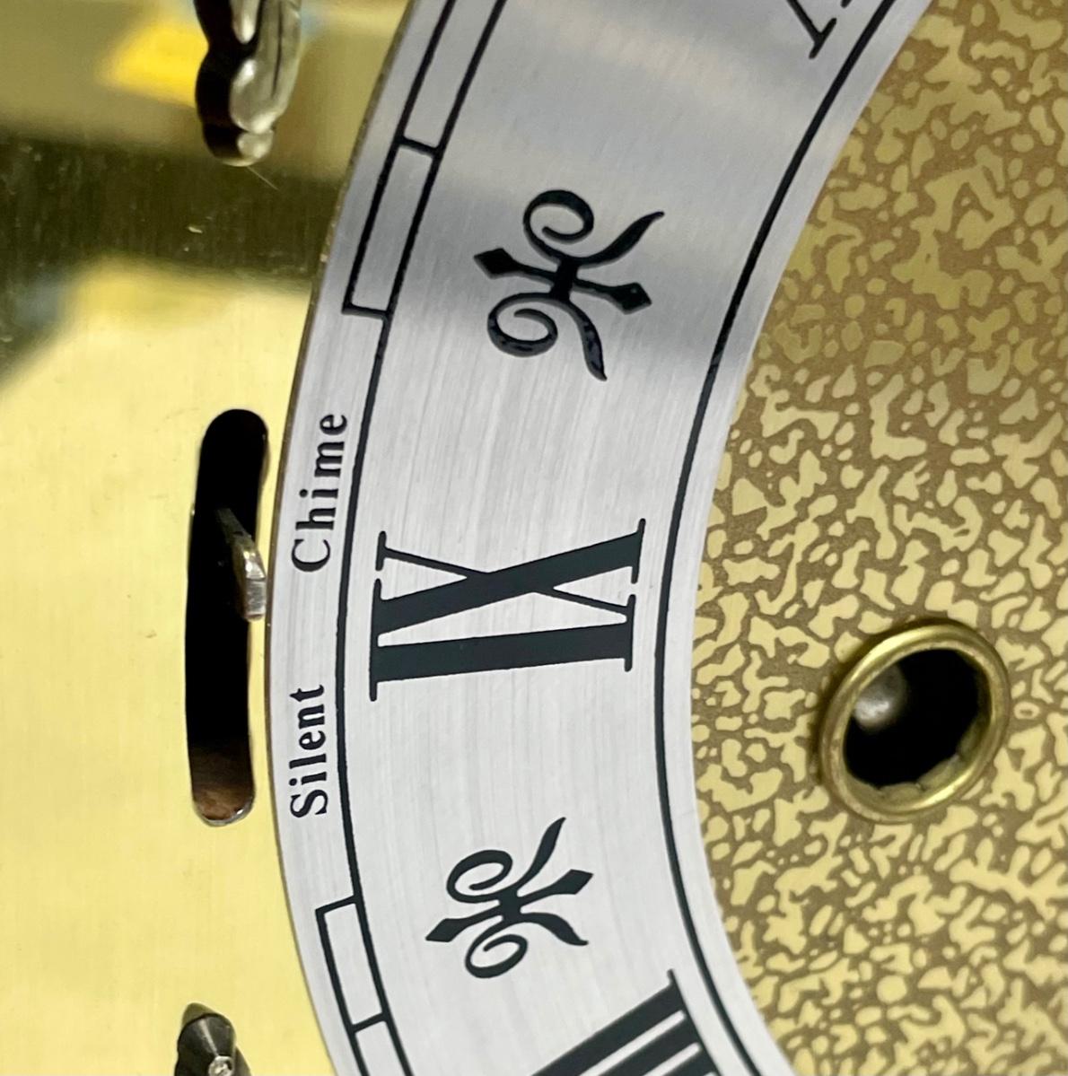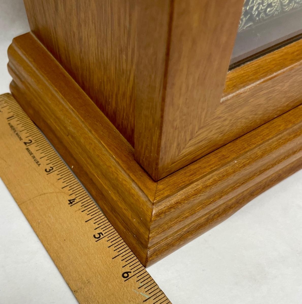 Clock has a fine wood case, removable wood door on back to access the clock mechanism and chimes, and a hinged glass door on the front to access the hands, the mechanism winders and chime on/off lever. Comes with original key. Franz Hermie movement and chimes made in West Germany. Tested, keeps good time and chimes on the quarter hour.