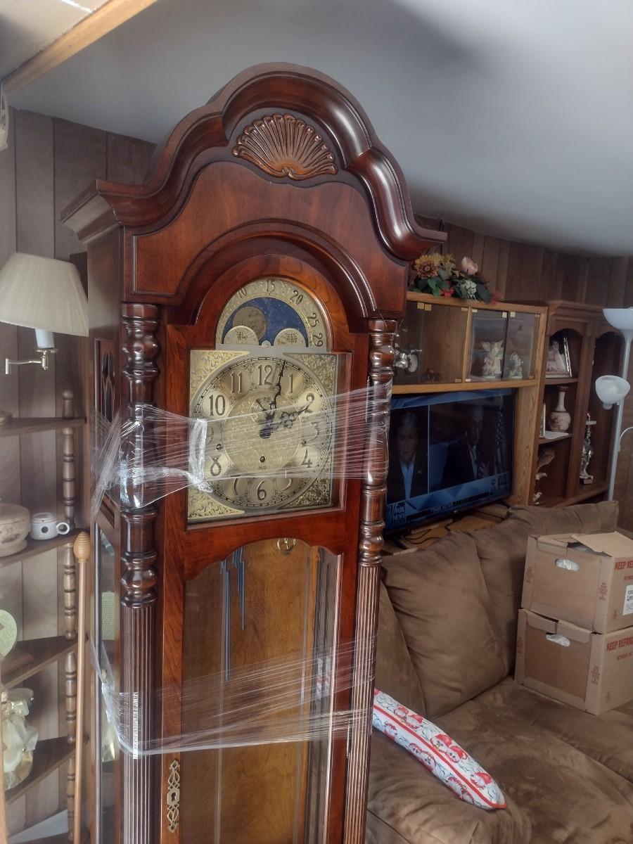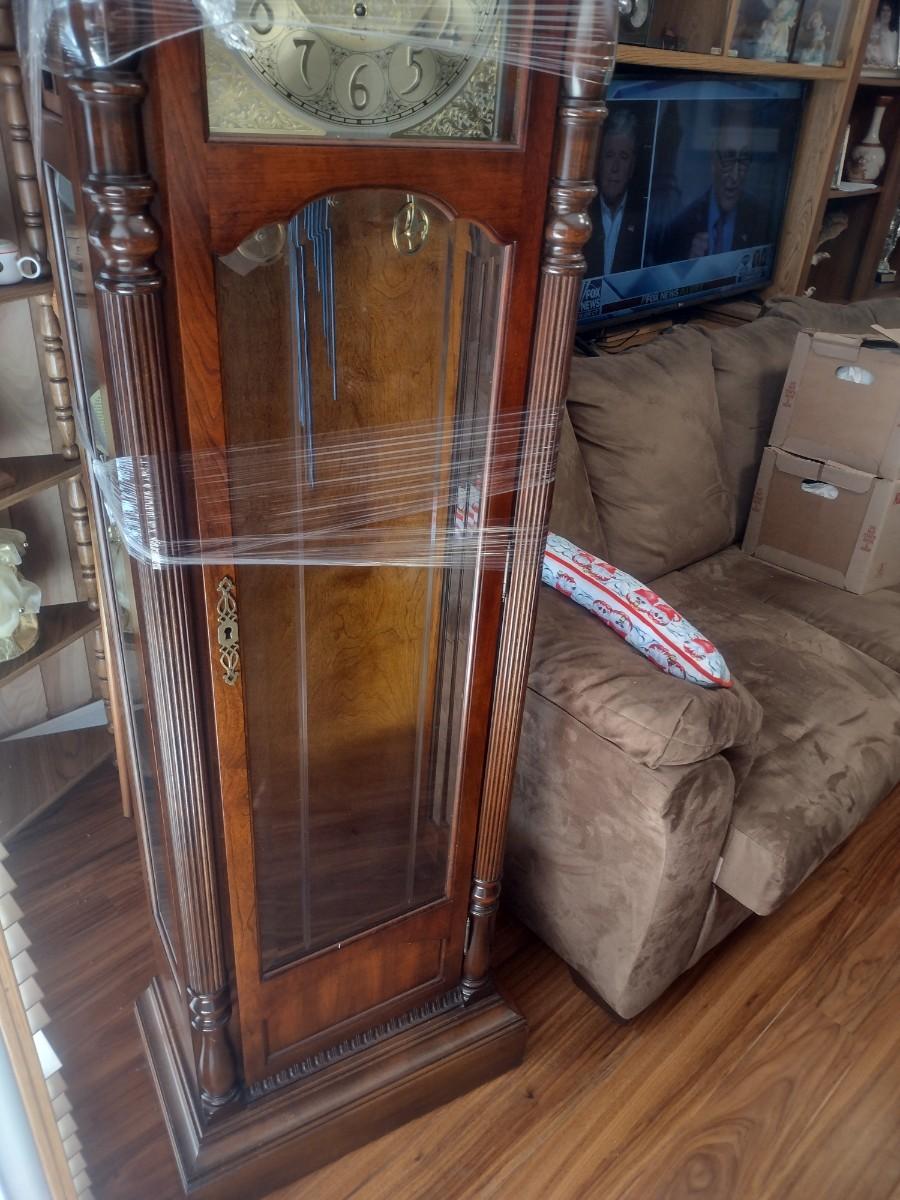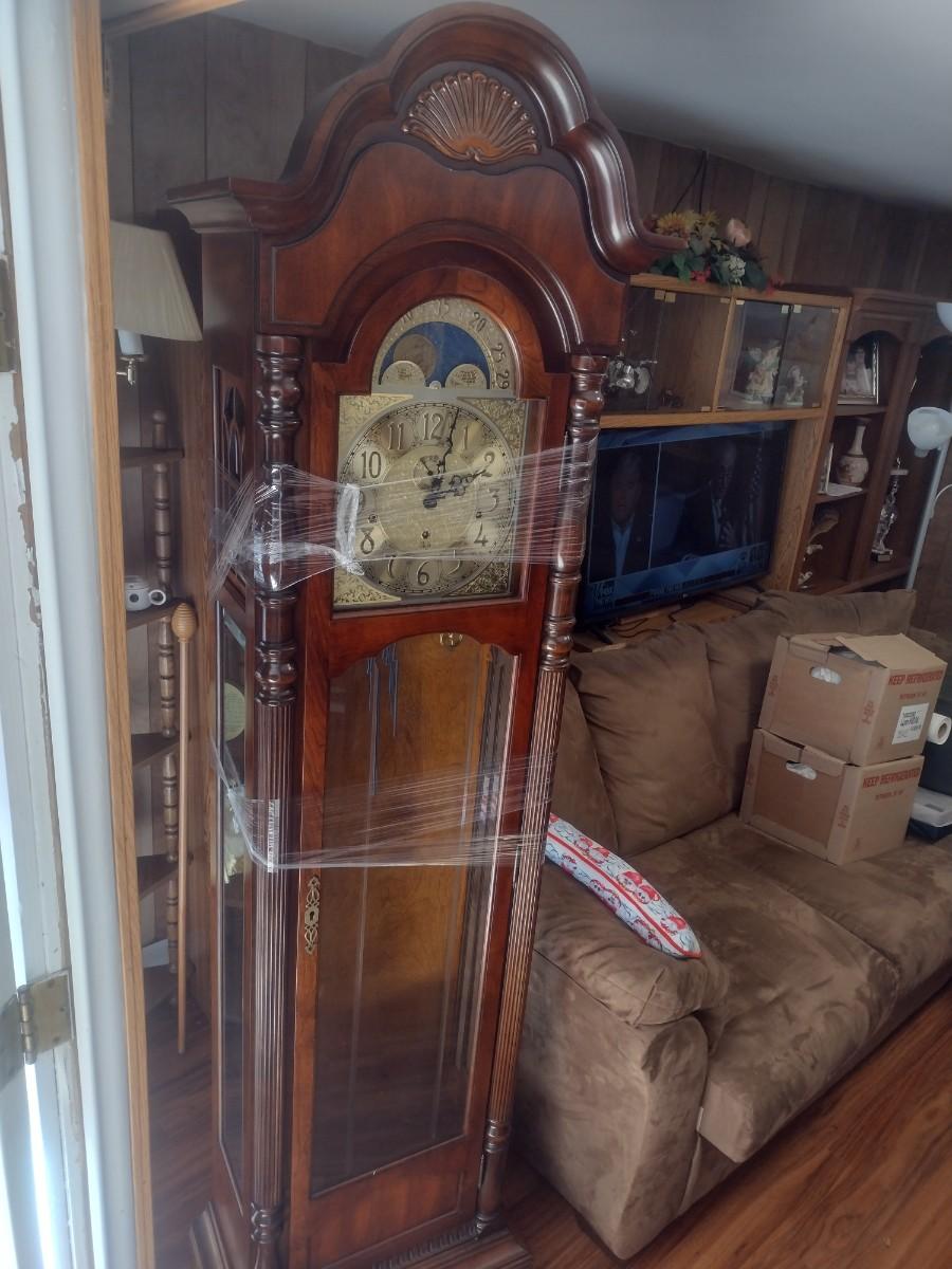 Vintage Wood Case Sligh Weight Driven Grandfather Clock. All pieces are present including key. Untested