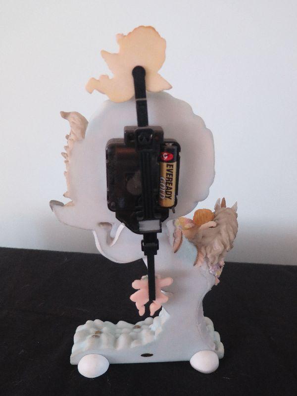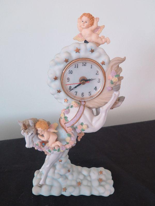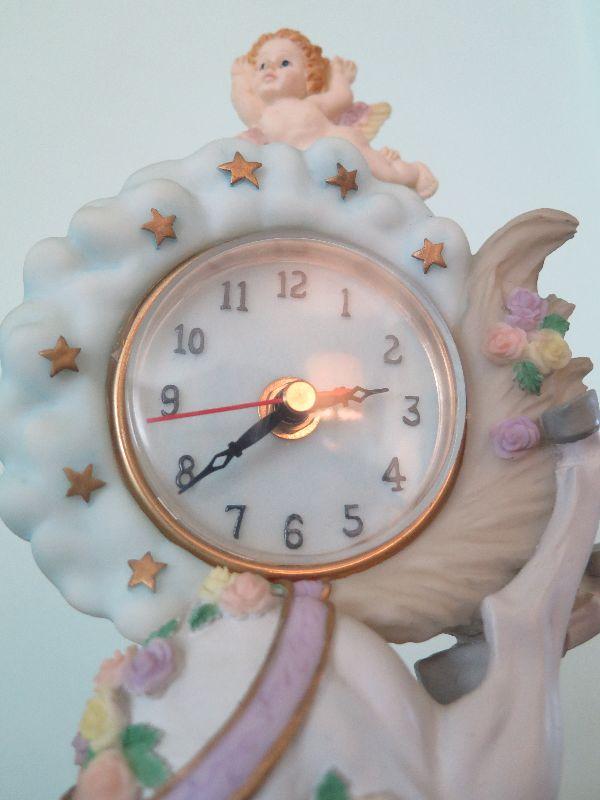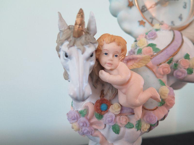 Decorative unicorn clock with cherubs. stands 13 inches tall. Untested. Please review all photos and read Terms and Conditions before placing a bid. Pick up is Wednesday, November 20 from 4-7pm and Saturday, November 23 from 9am-2pm in Mantua, New Jersey. All sales are final. All sales are as is, where is. Please bring all boxes, tools, and muscle needed to remove your items. Any photo props are not included. All measurements are approximate. Items come from dog-friendly home.