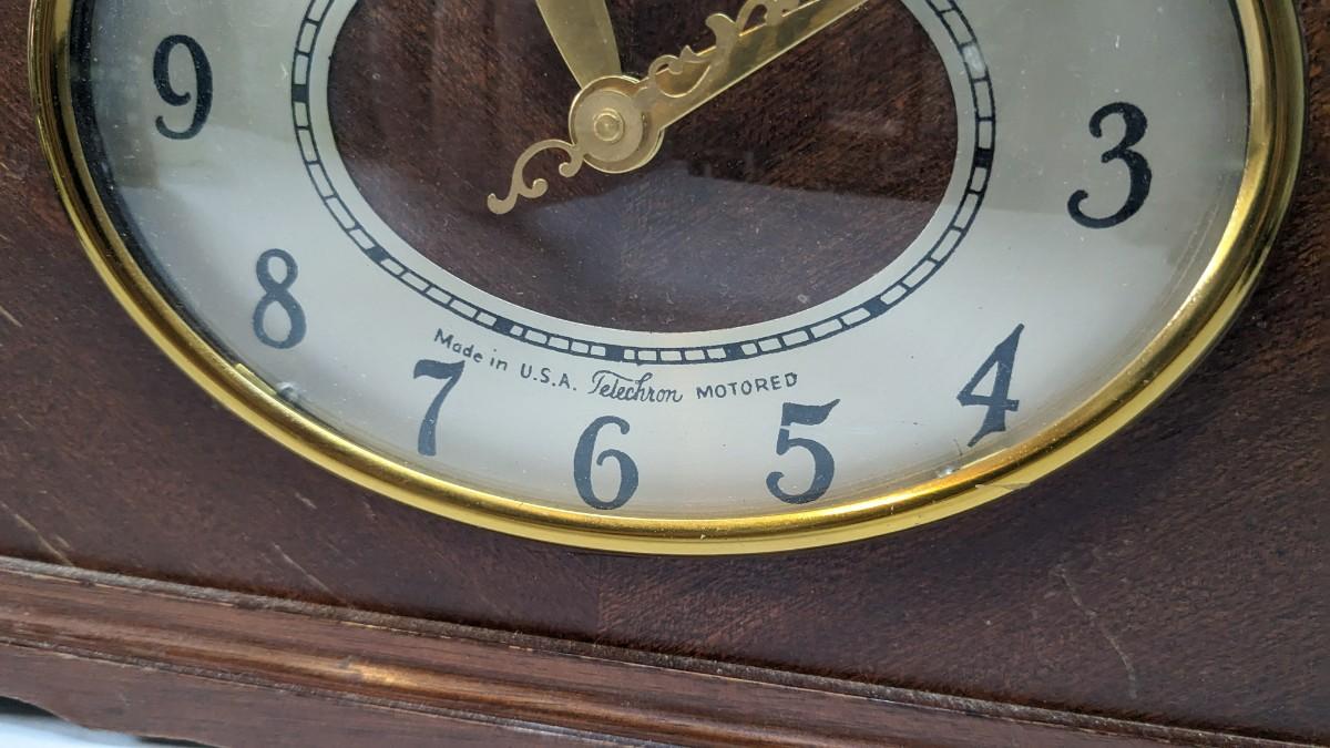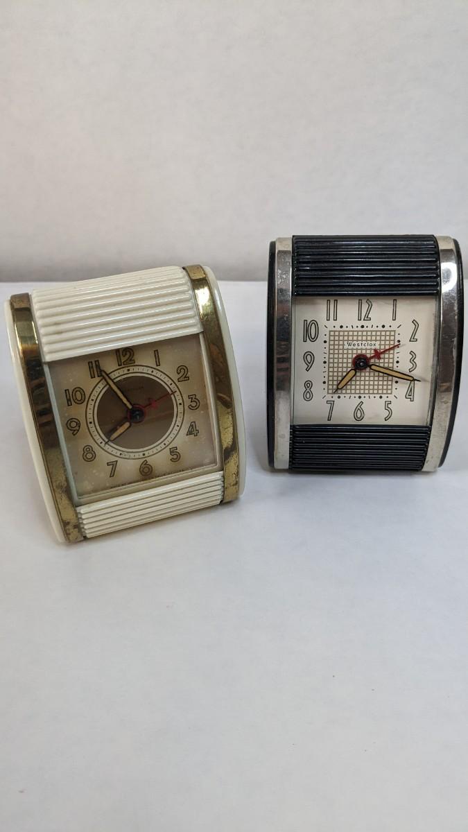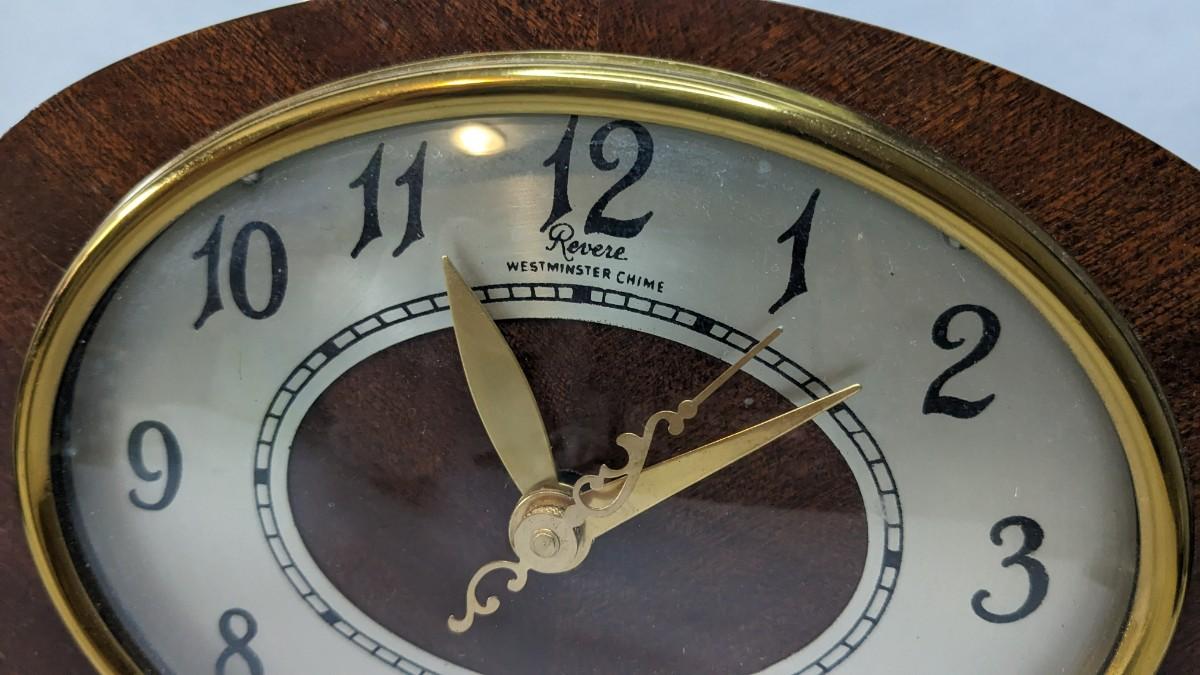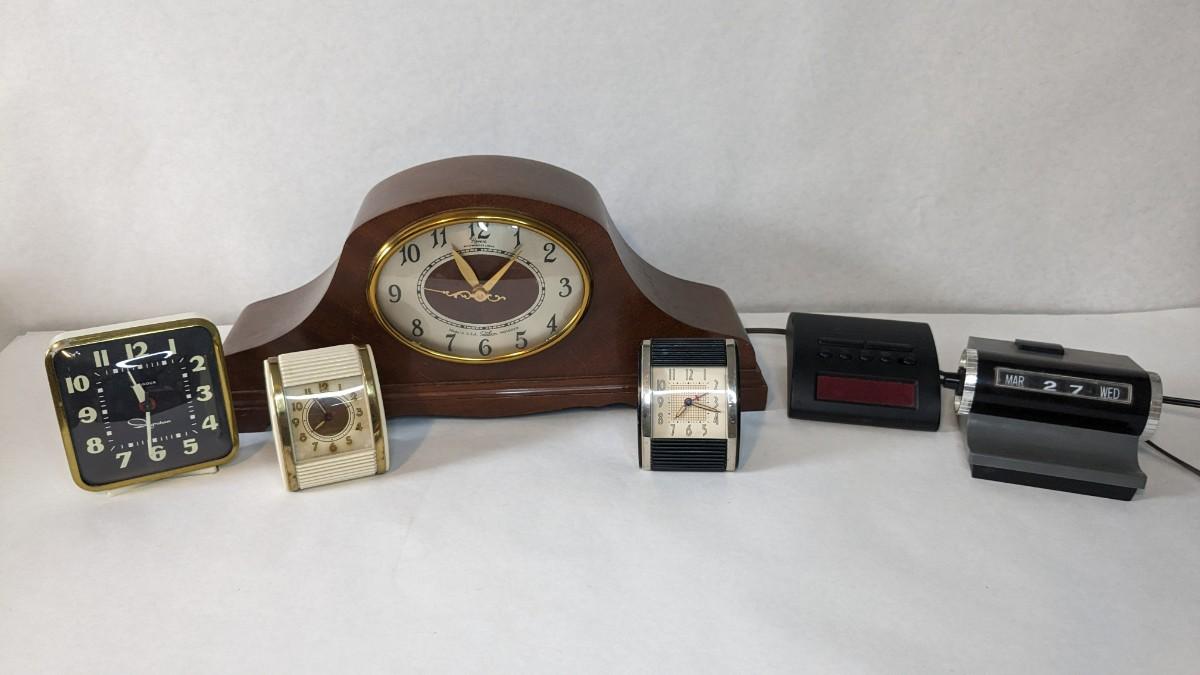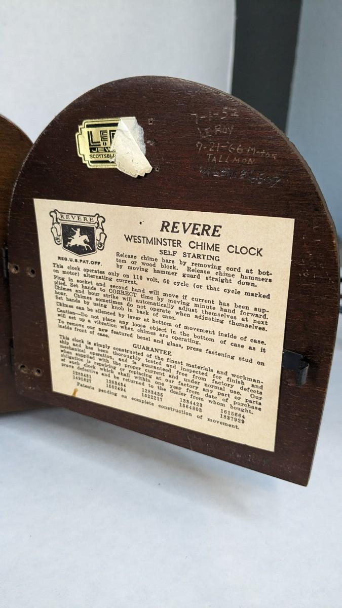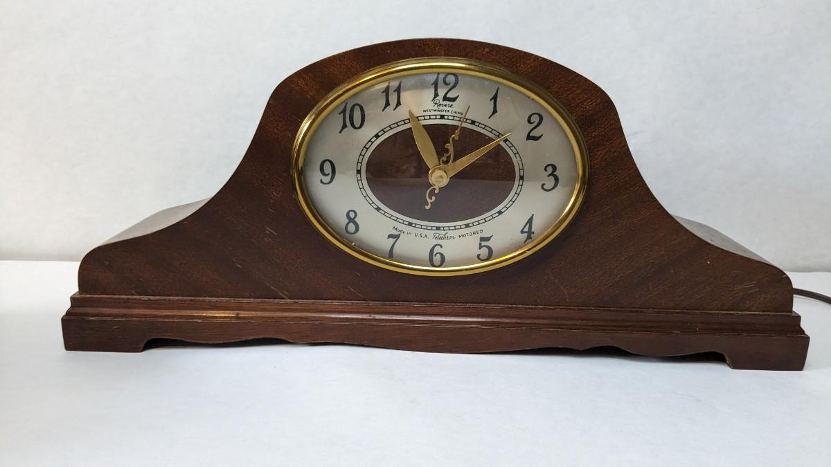 includes electric Revere Westminster chime in great cosmetic and functioning condition. 2 travelling Westclox clocks, convex face Ingraham Luminous that needs attention, 1971 revolving calendar/music box made in Japan, and electric clock.