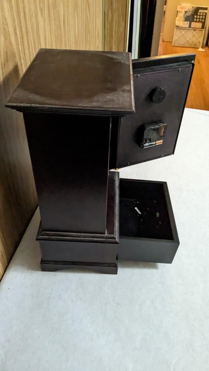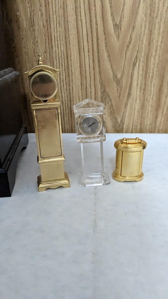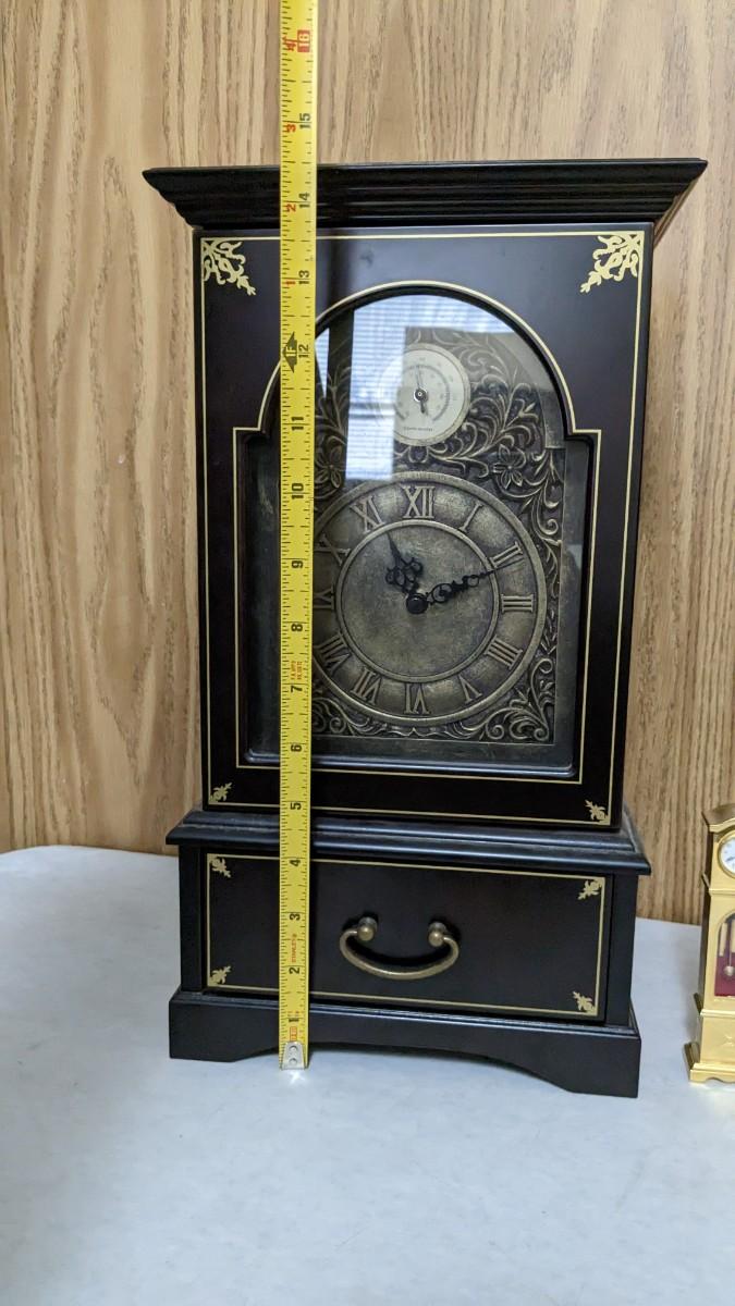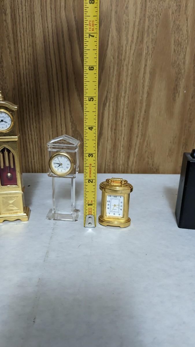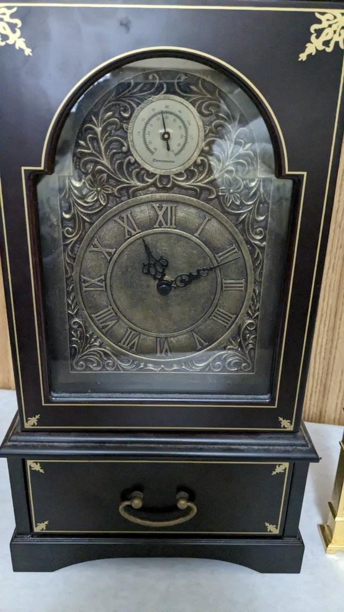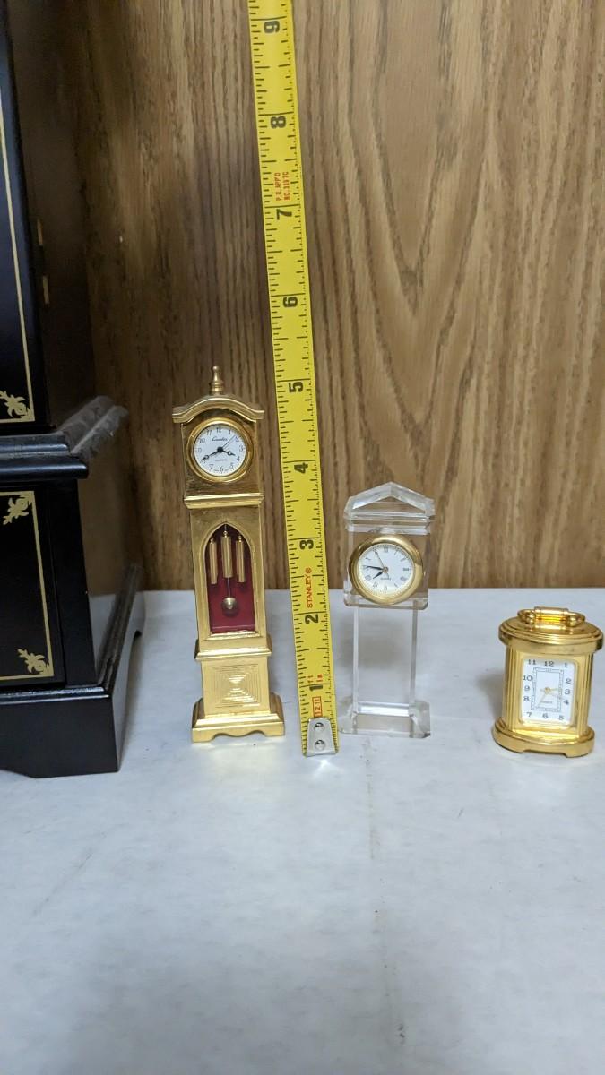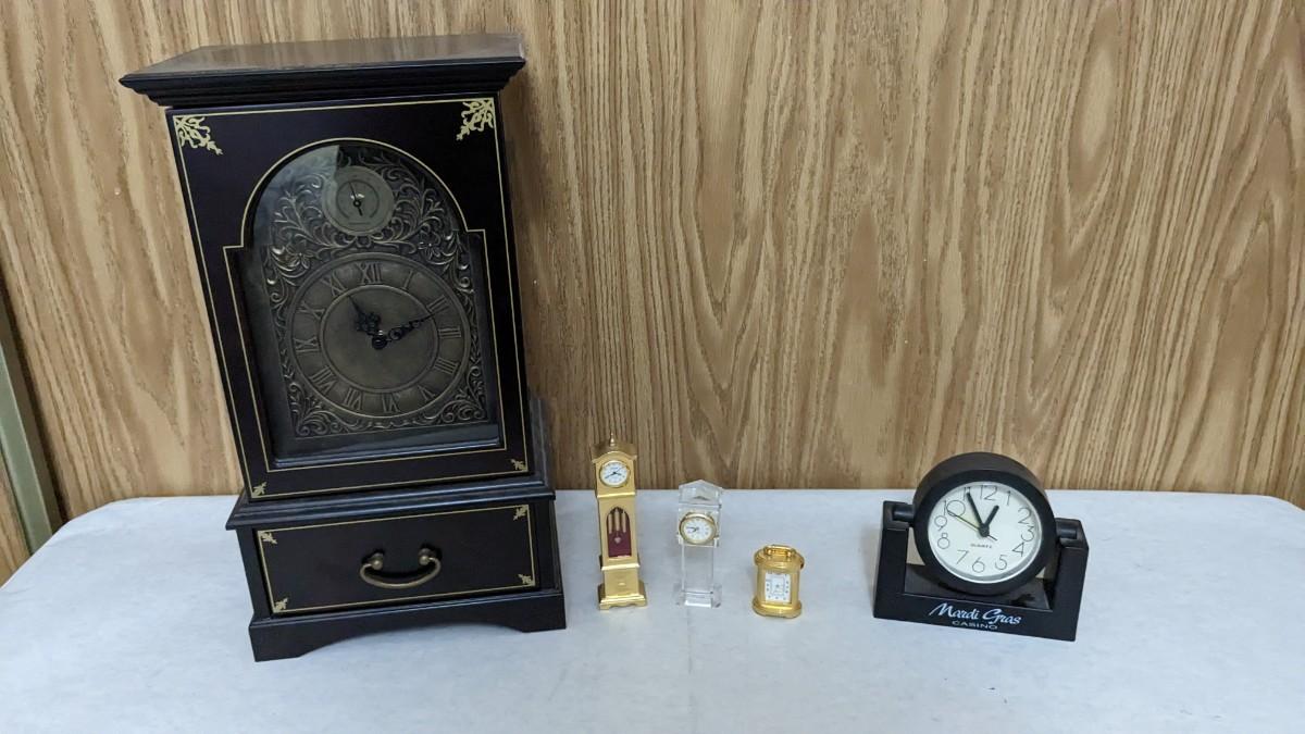 includes lovely contemporary made to look antique mantel clock with hidden storage, operable. 3 mini clocks, and a fun Mardi Gras mantel clock. bdrm1