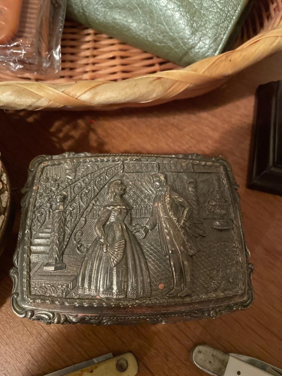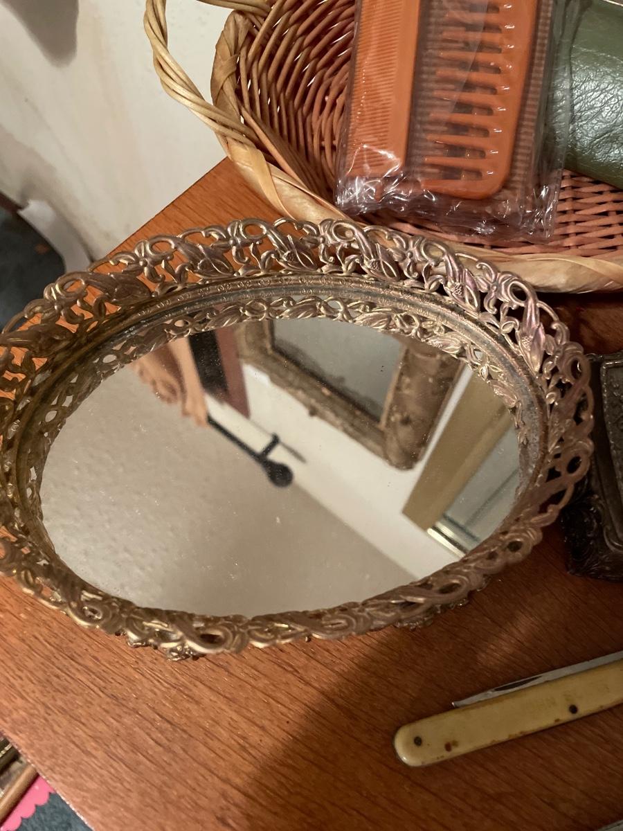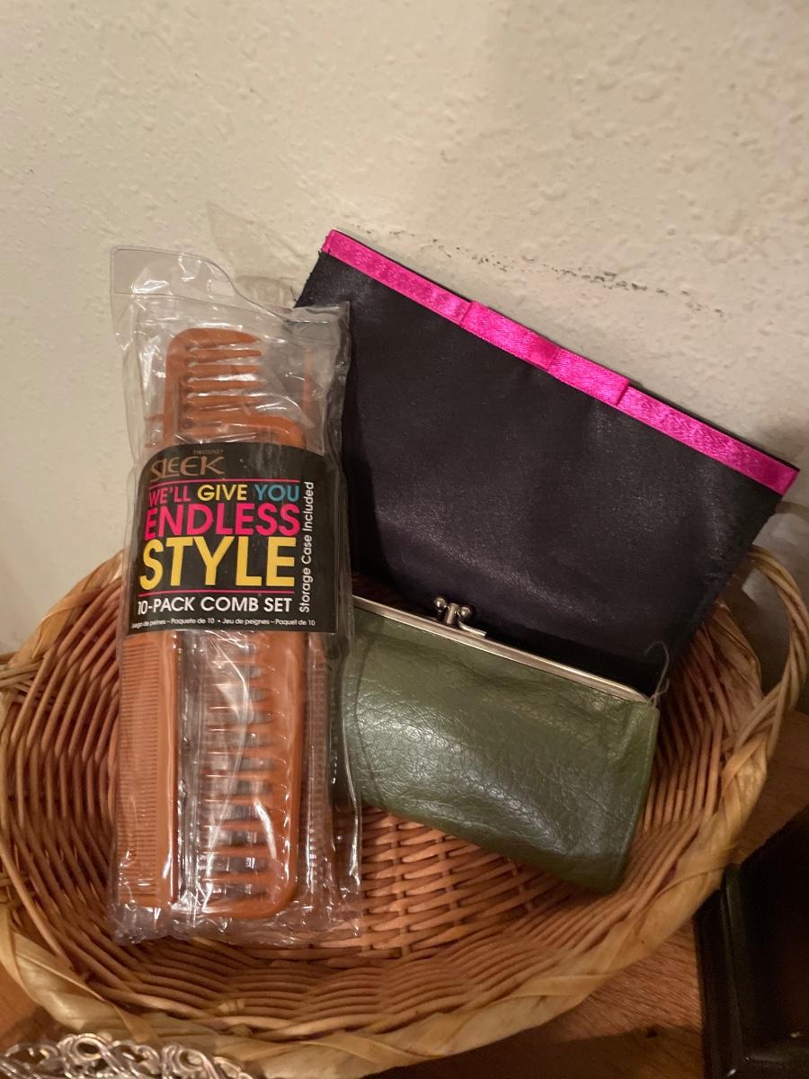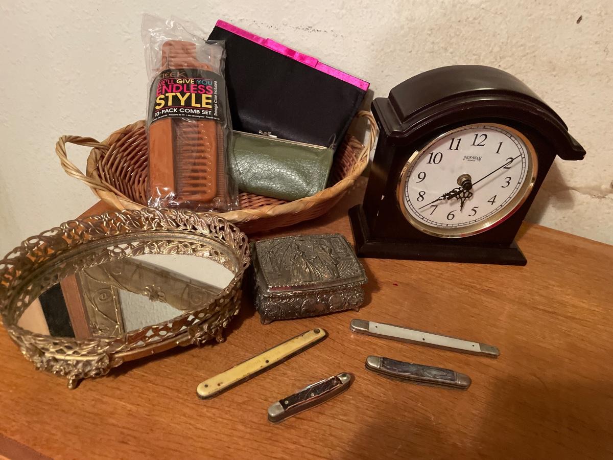 Clock, jewelry storagenee combs, purses basket and vintage k Ives