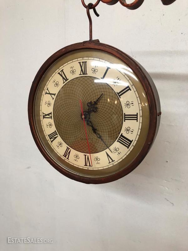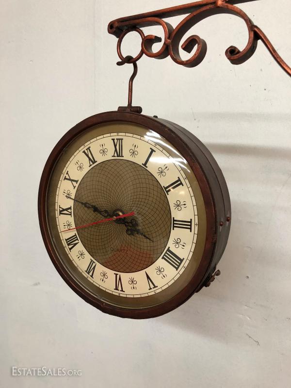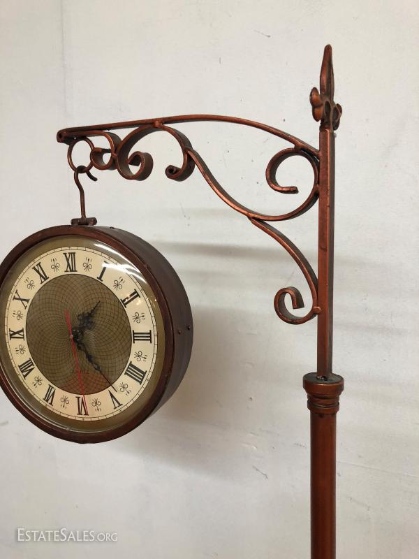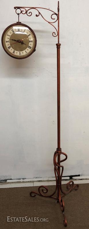 Clock is in working condition, measures 72" tall on stand, clock is 10" in diameter.