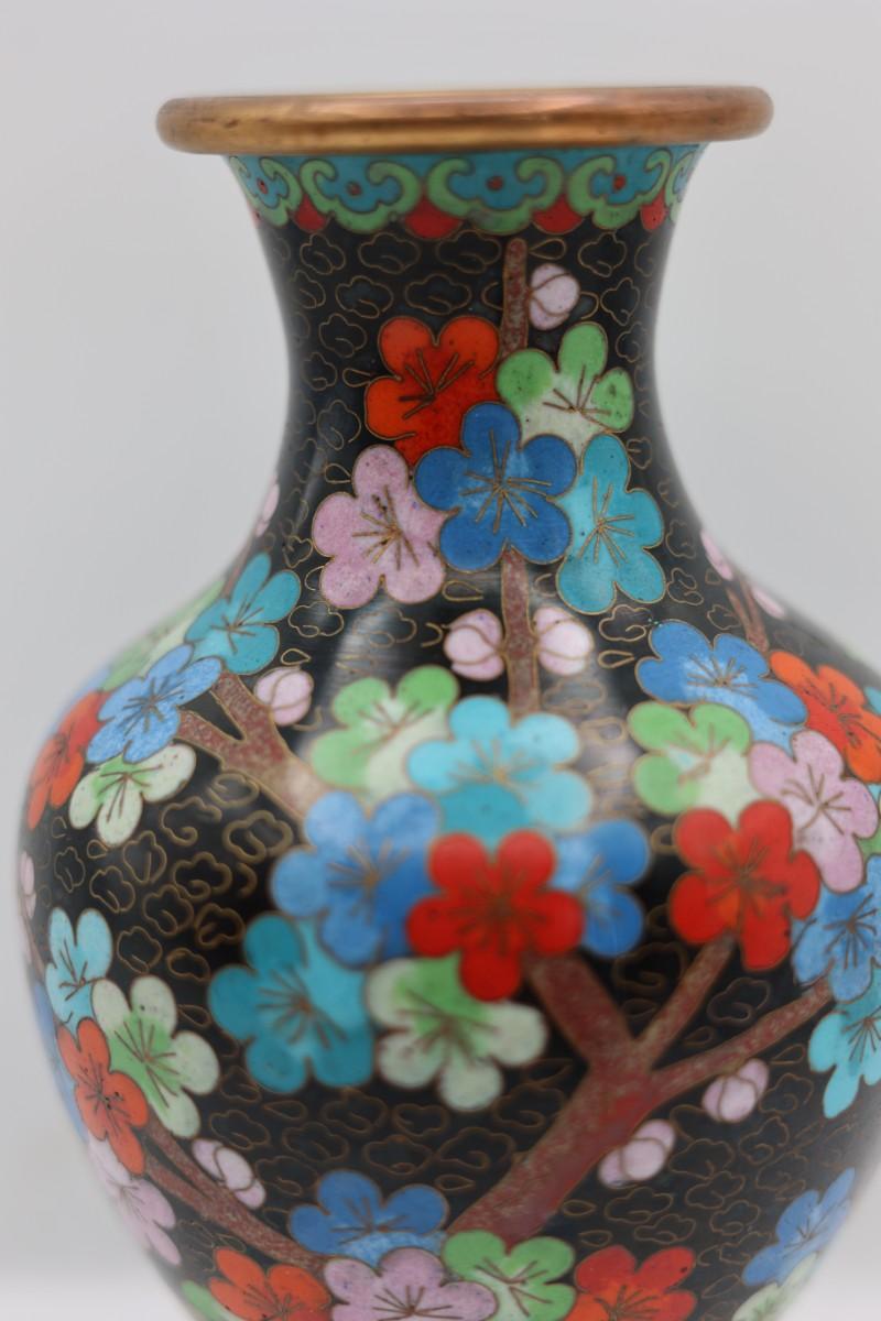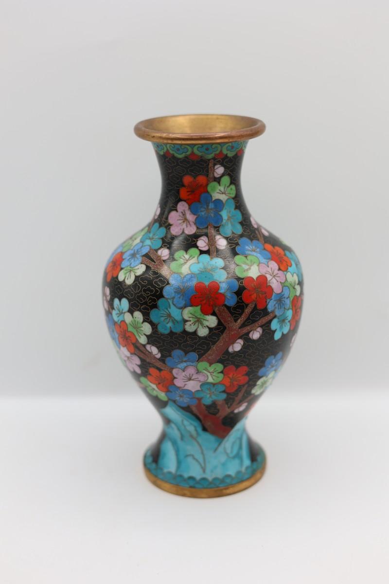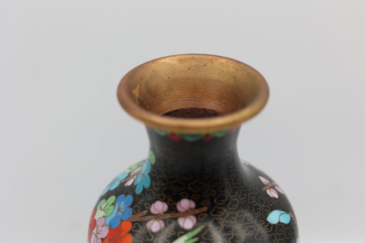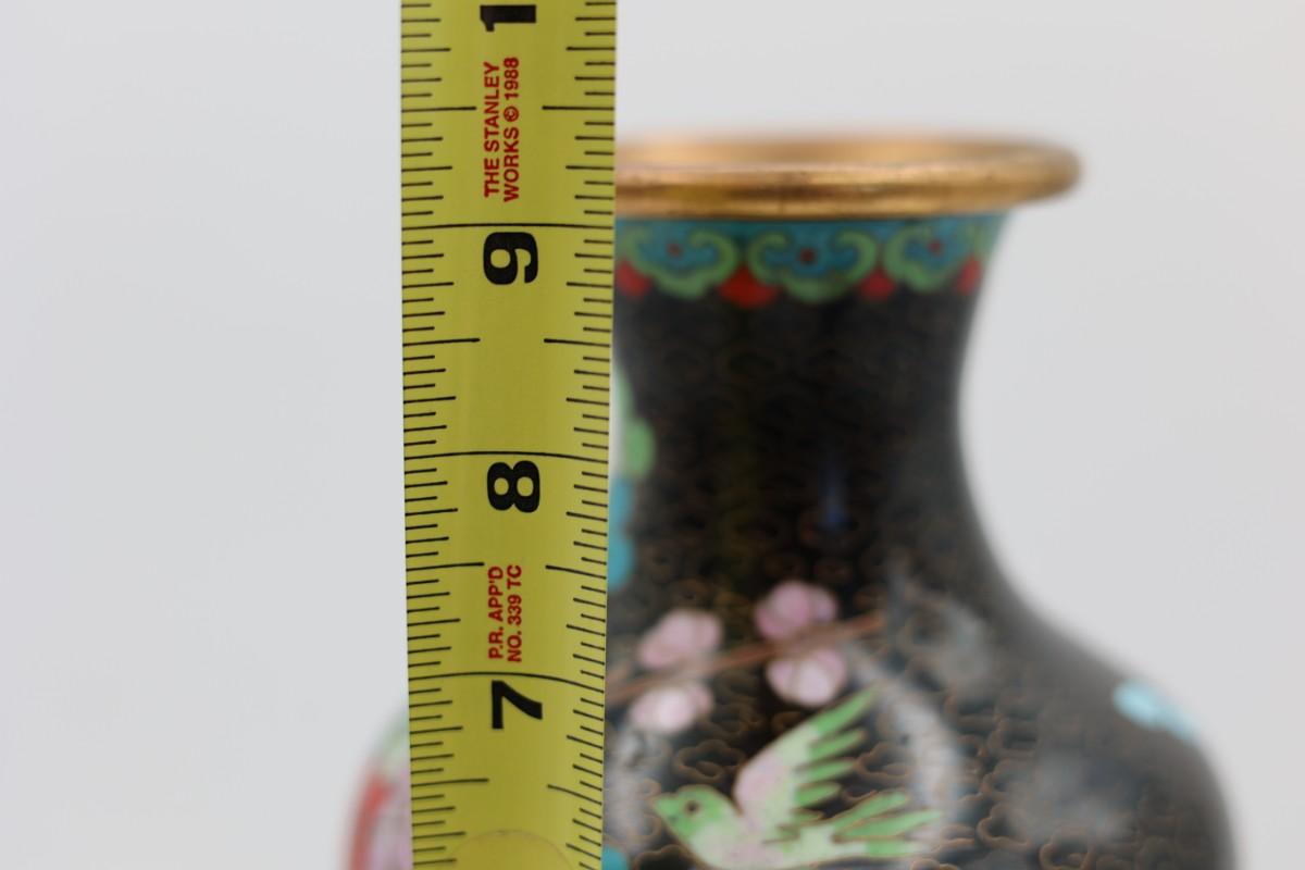 Cloisonné Enamel Vase – Floral Design on Black – Brass Trim