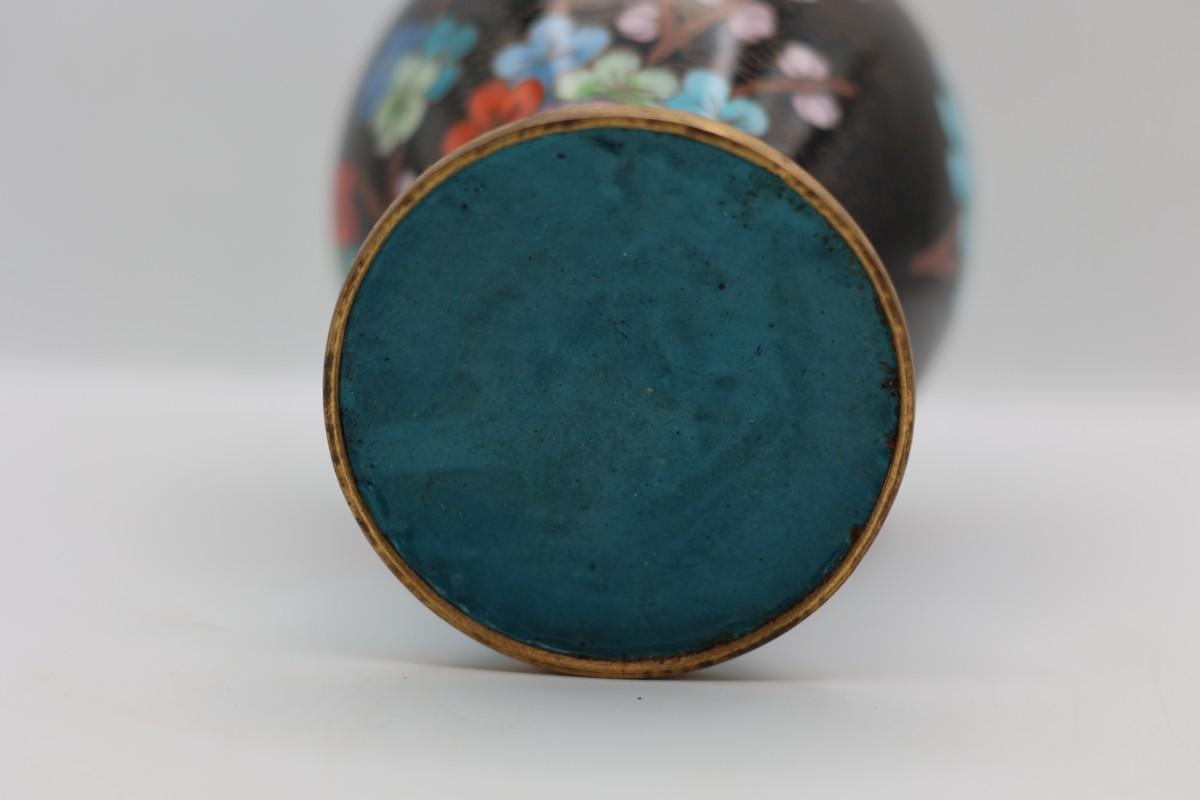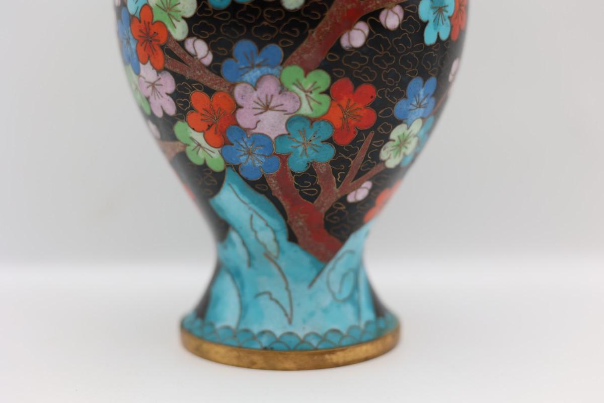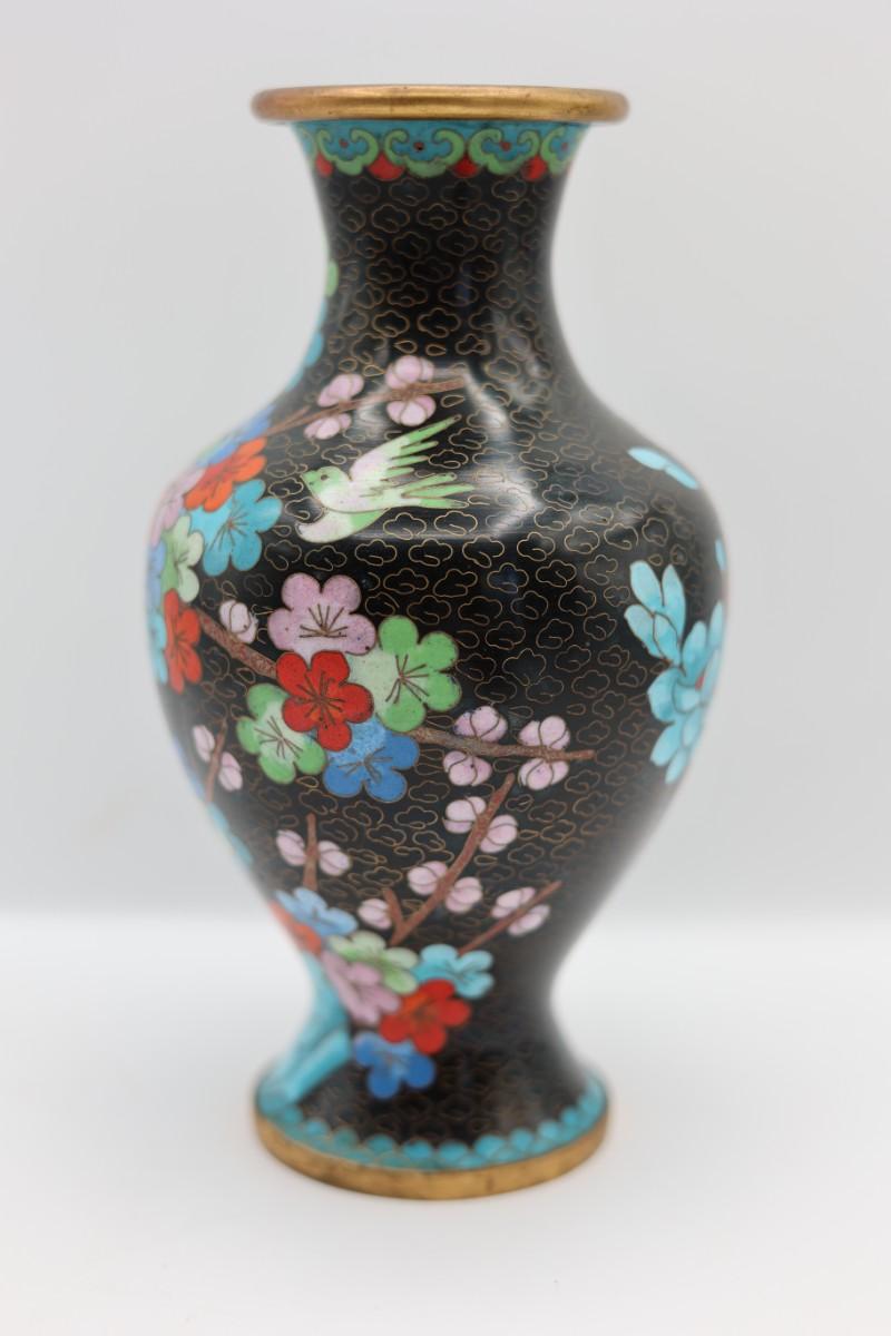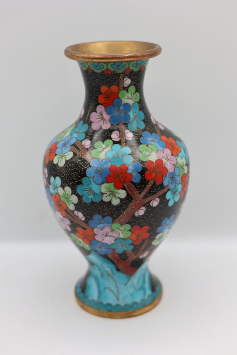 Cloisonné Enamel Vase – Floral Design on Black – Brass Trim