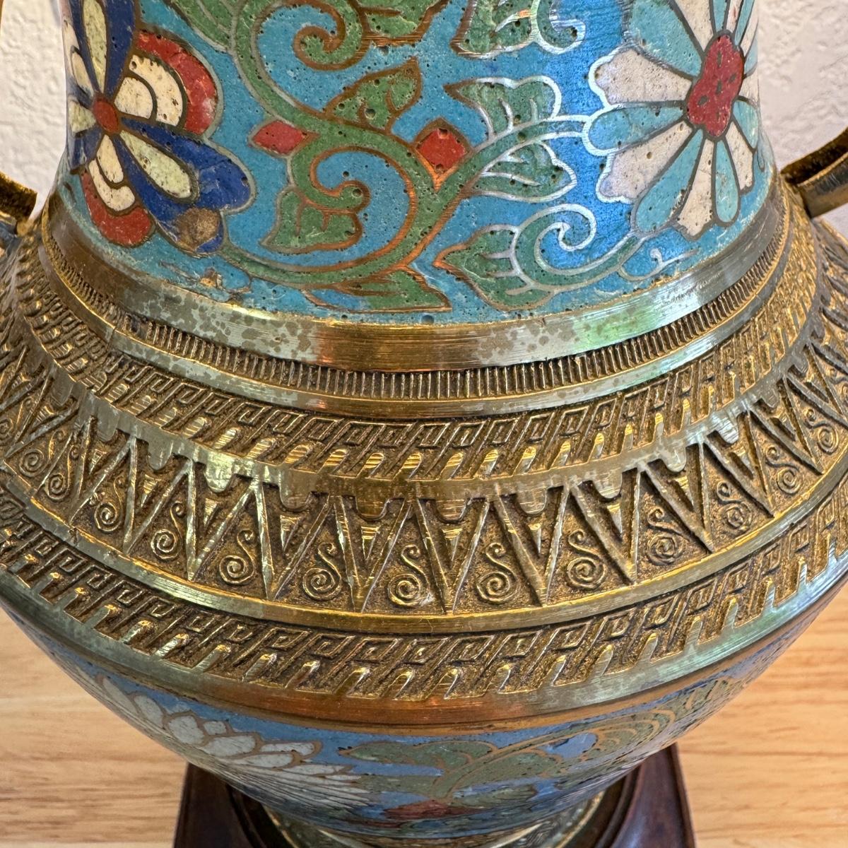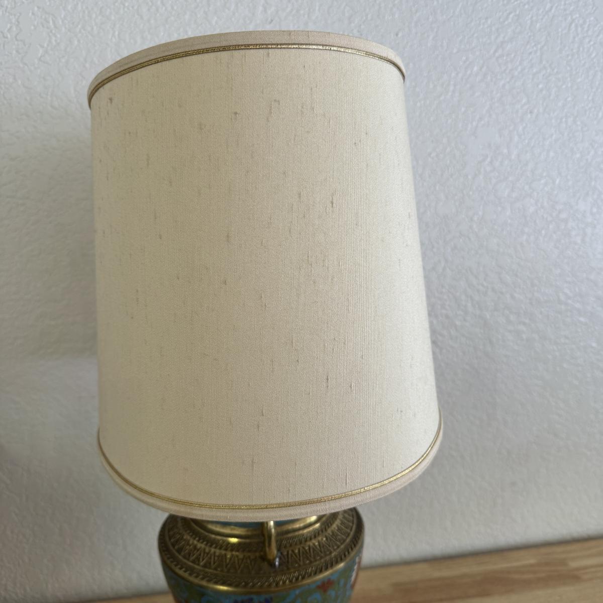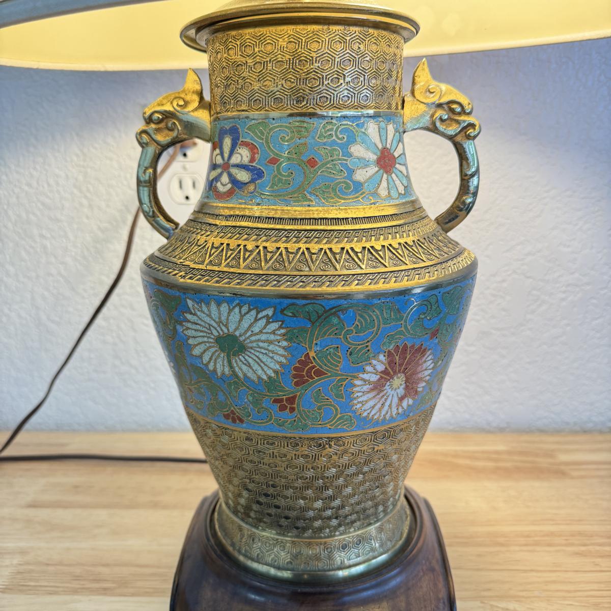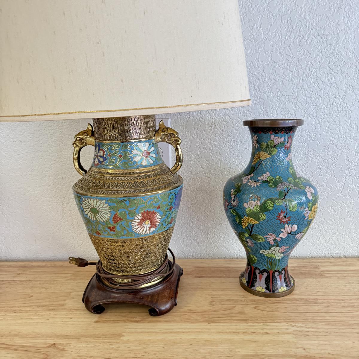 Both items appear to be cloisonné. Lamp has two bulbs and a wooden base. Blue floral cloisonné with brass accents. Oval lamp shade included but finial is silver and doesn’t appear to match. Measures approximately 9” wide diameter on base and 23” tall. Vase is cloisonné over brass. Has an illegible stamp on bottom. Please note there are three nickel sized dents on the vase. See photos. Measures 7.5” wide diameter and 13” tall. Shipping available.