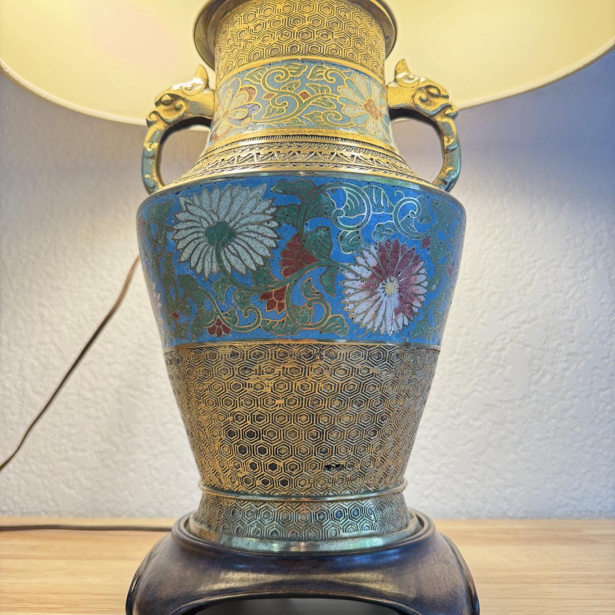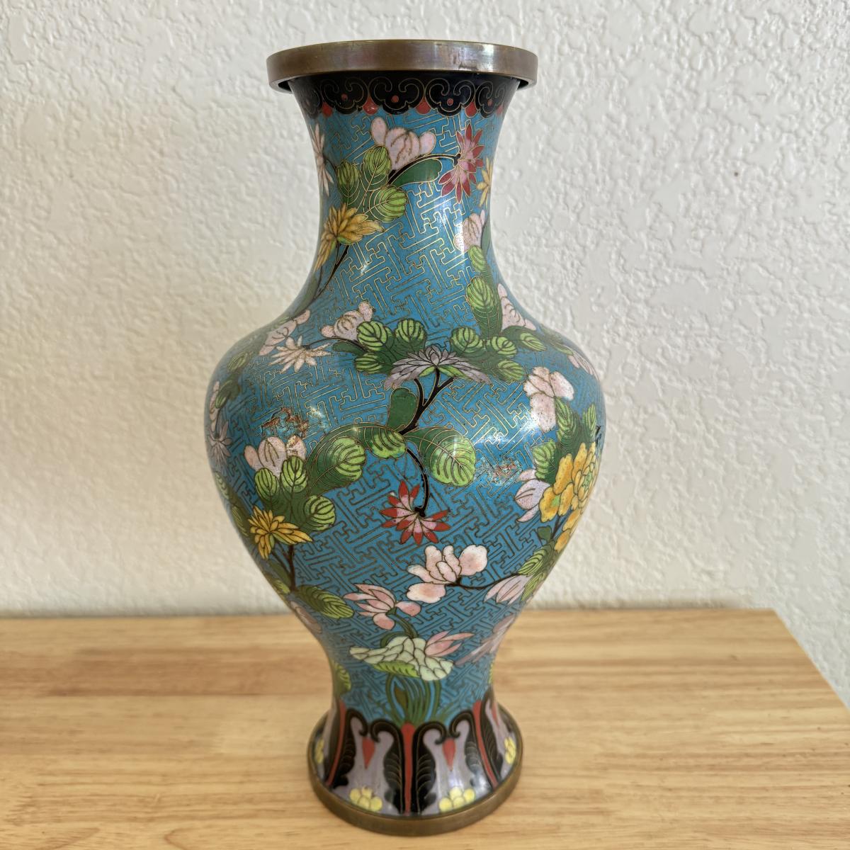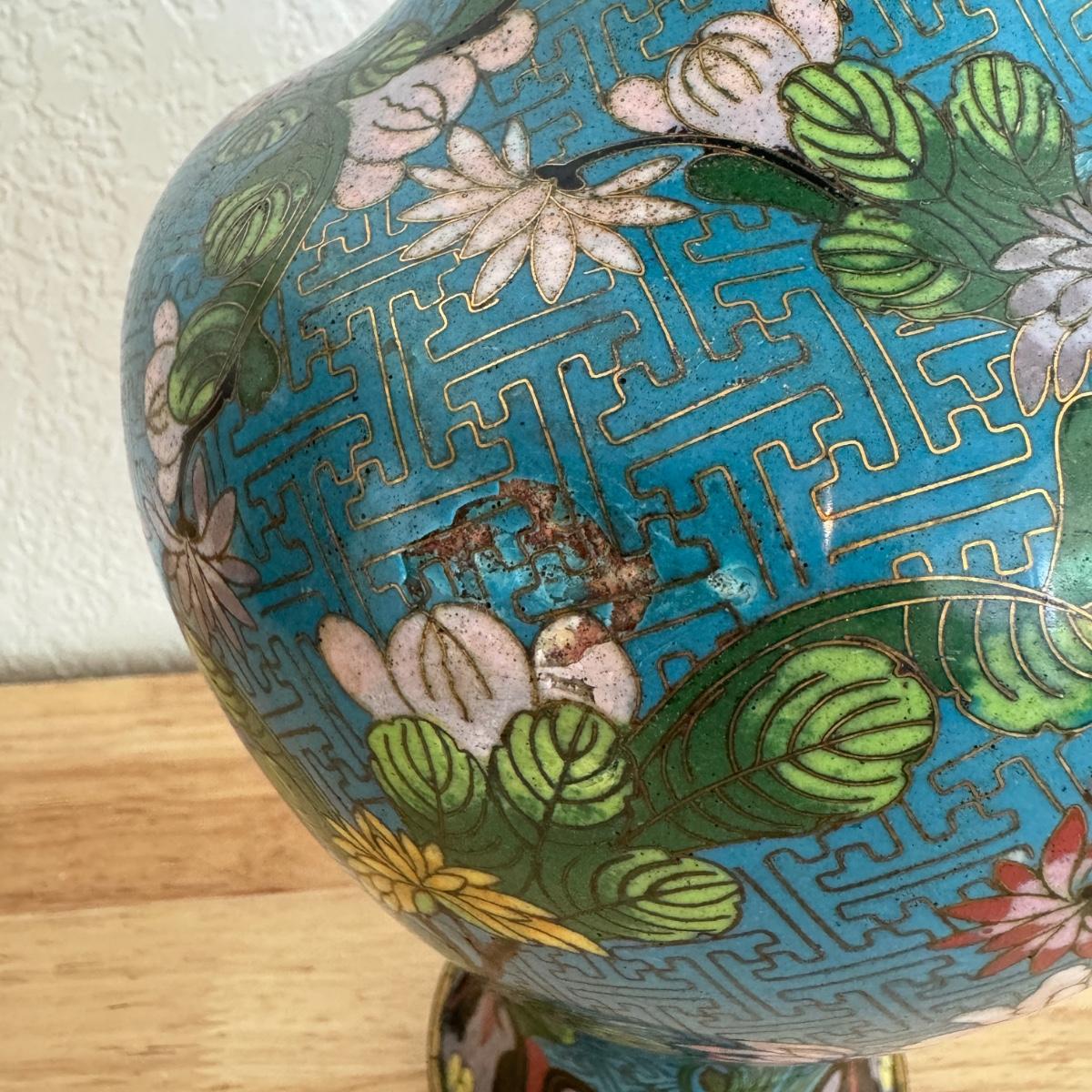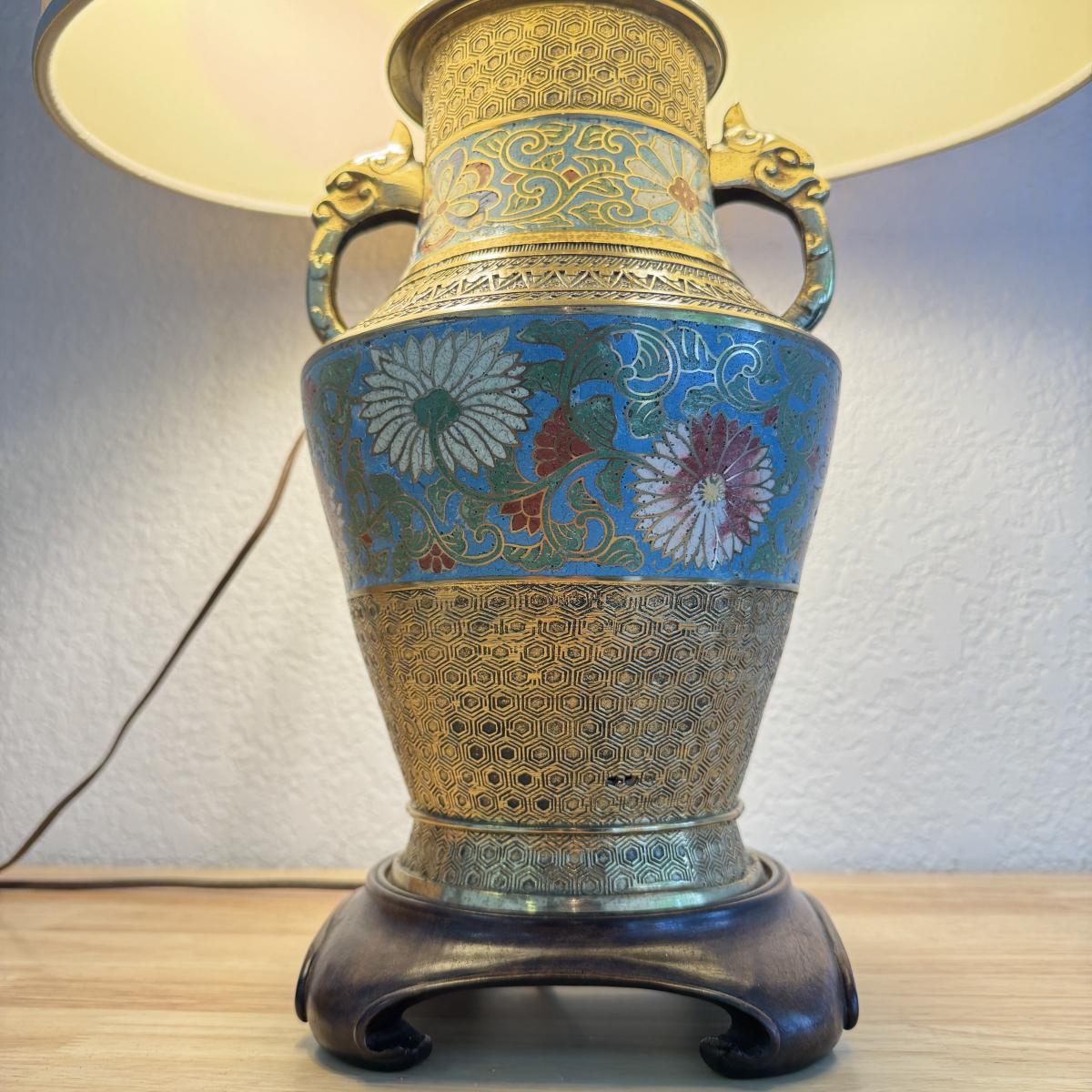 Both items appear to be cloisonné. Lamp has two bulbs and a wooden base. Blue floral cloisonné with brass accents. Oval lamp shade included but finial is silver and doesn’t appear to match. Measures approximately 9” wide diameter on base and 23” tall. Vase is cloisonné over brass. Has an illegible stamp on bottom. Please note there are three nickel sized dents on the vase. See photos. Measures 7.5” wide diameter and 13” tall. Shipping available.