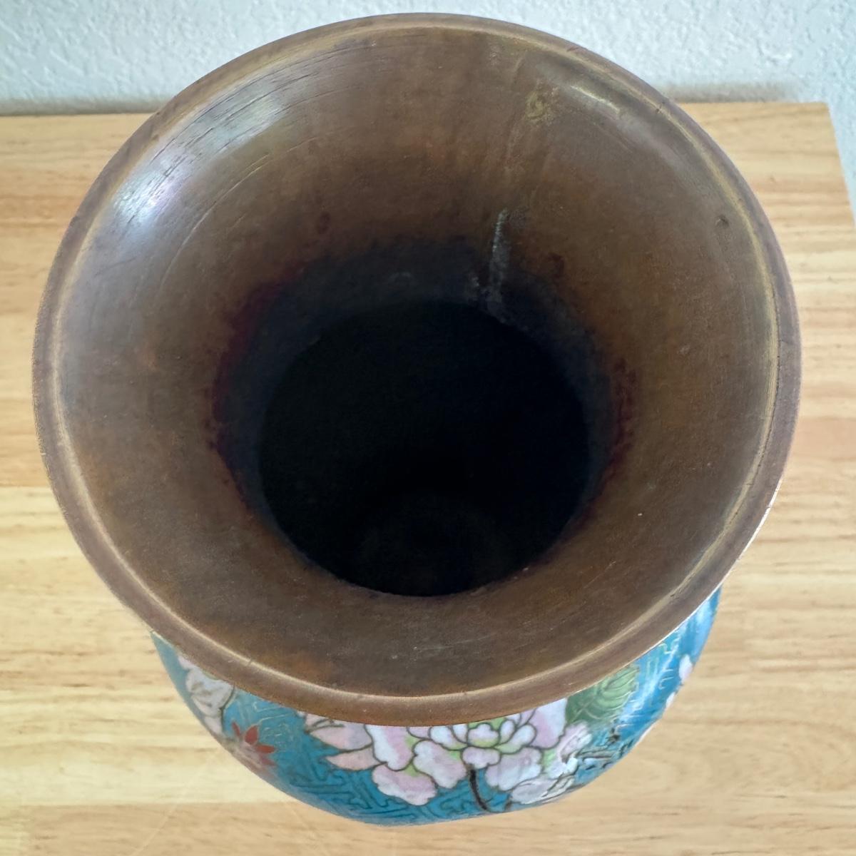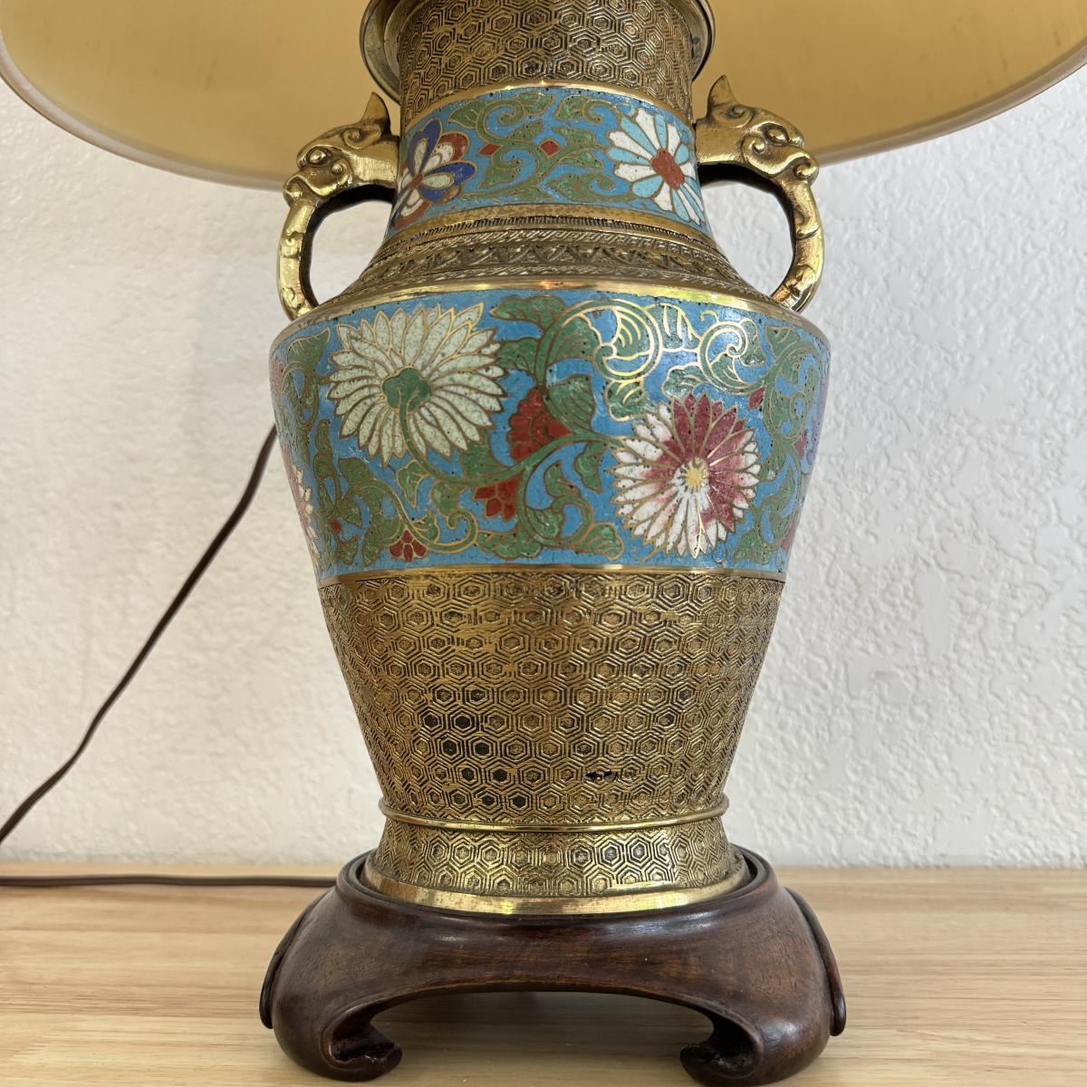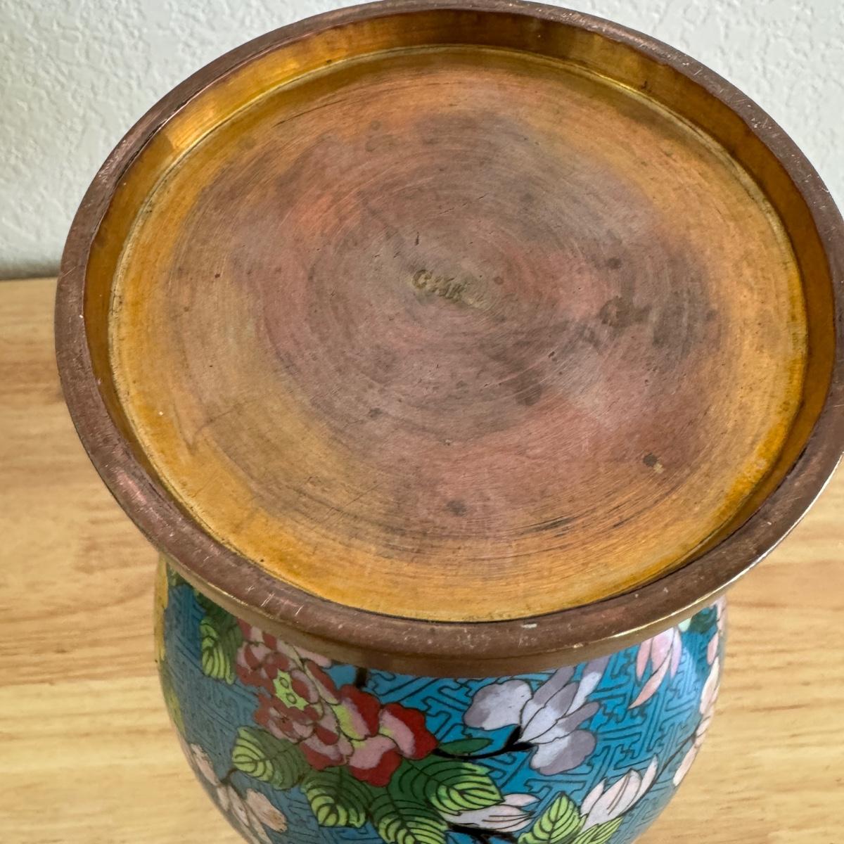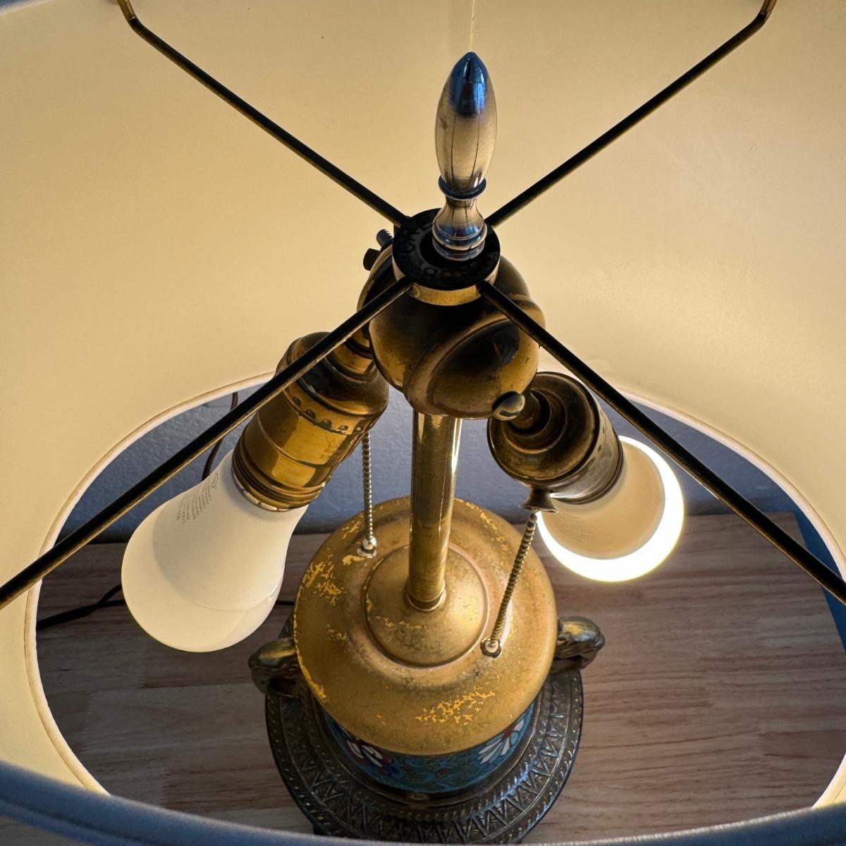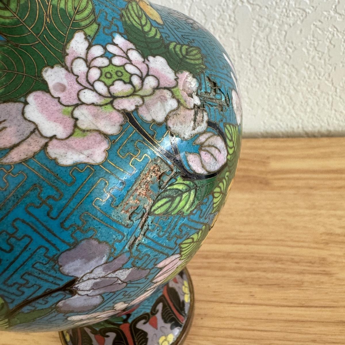 Both items appear to be cloisonné. Lamp has two bulbs and a wooden base. Blue floral cloisonné with brass accents. Oval lamp shade included but finial is silver and doesn’t appear to match. Measures approximately 9” wide diameter on base and 23” tall. Vase is cloisonné over brass. Has an illegible stamp on bottom. Please note there are three nickel sized dents on the vase. See photos. Measures 7.5” wide diameter and 13” tall. Shipping available.