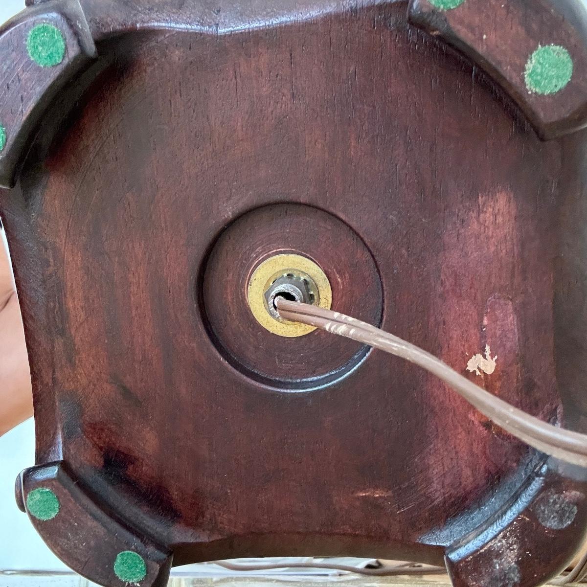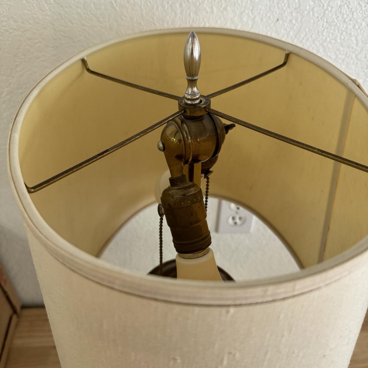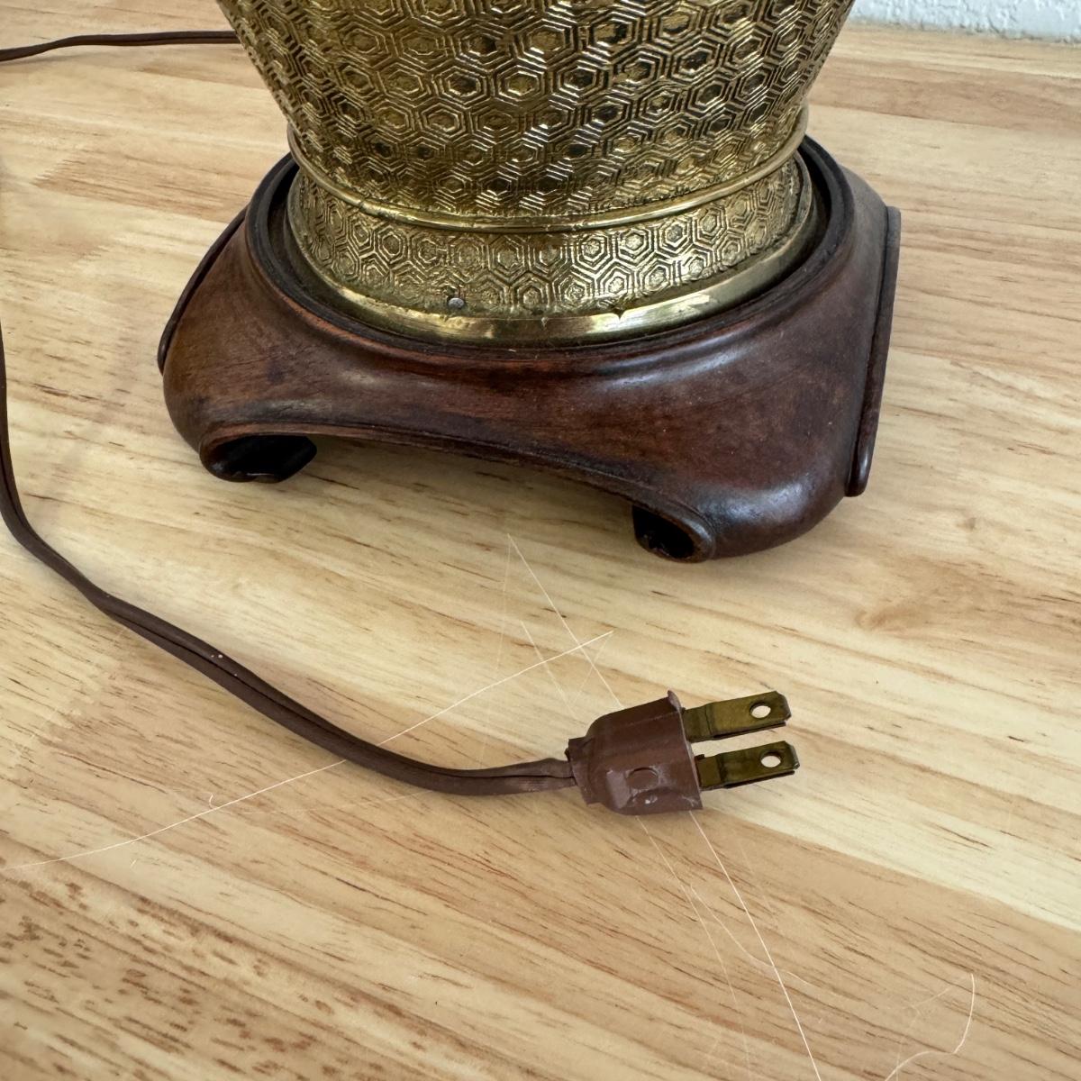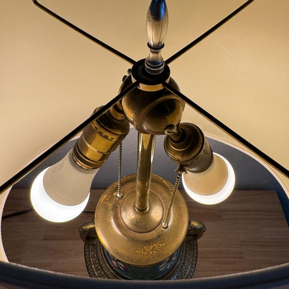 Both items appear to be cloisonné. Lamp has two bulbs and a wooden base. Blue floral cloisonné with brass accents. Oval lamp shade included but finial is silver and doesn’t appear to match. Measures approximately 9” wide diameter on base and 23” tall. Vase is cloisonné over brass. Has an illegible stamp on bottom. Please note there are three nickel sized dents on the vase. See photos. Measures 7.5” wide diameter and 13” tall. Shipping available.