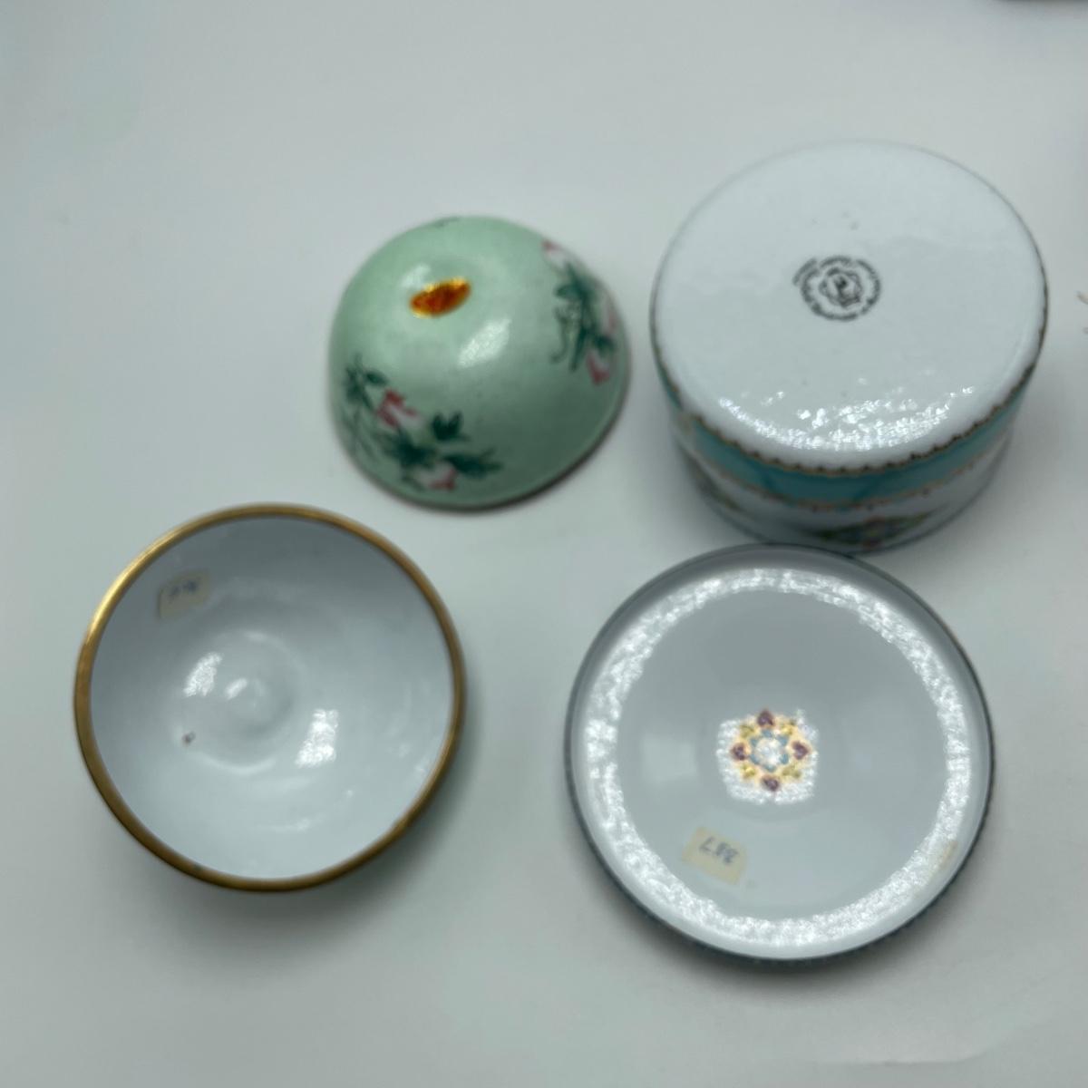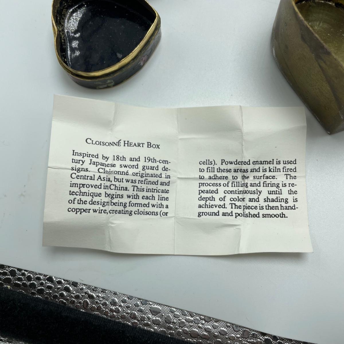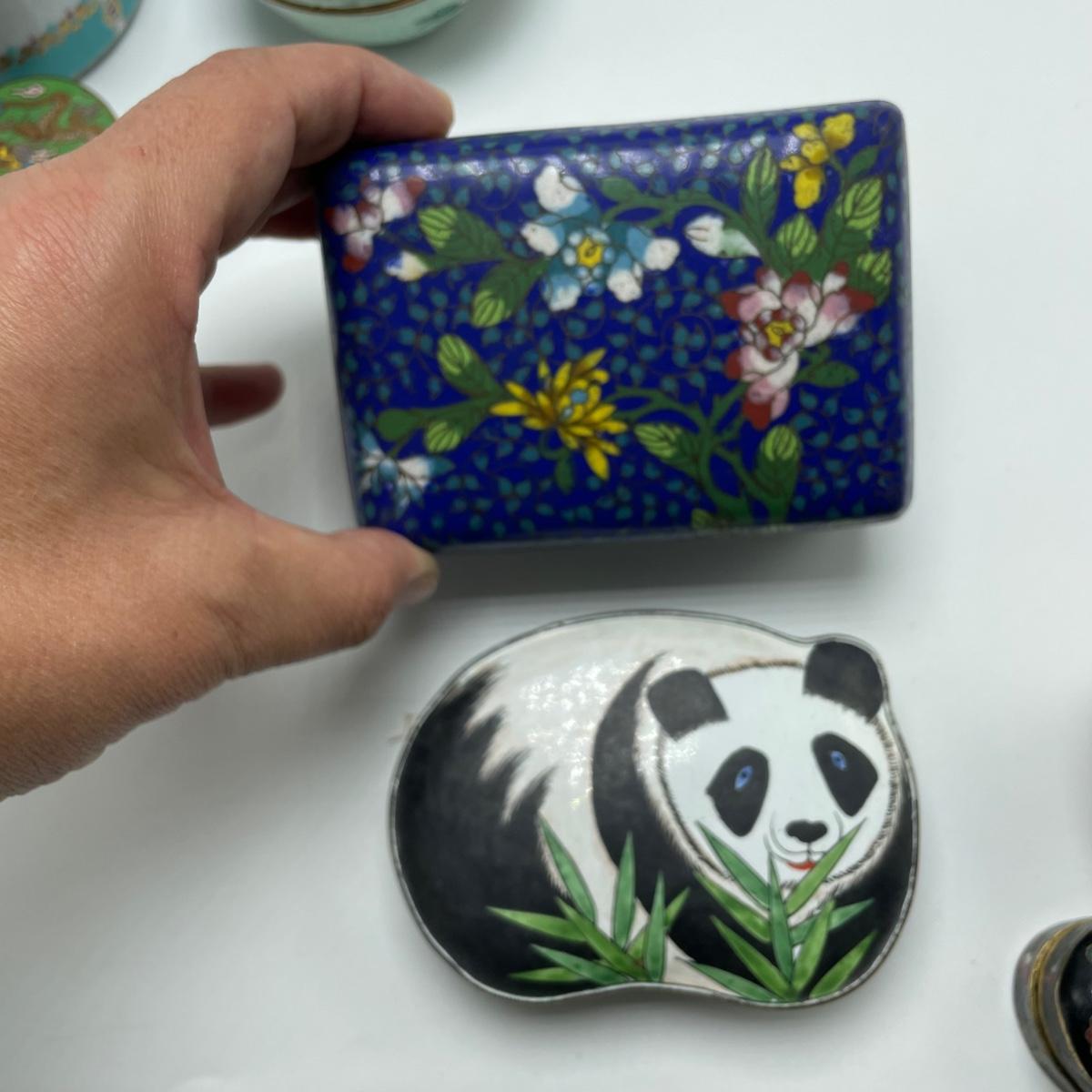 A variety of 12 trinket and pill boxes that appear to be a mix of ceramic and metal with enamel and cloisonné. The black heart has a note of cloisonné information inside from the Museum of Fine Arts in Boston. See images. Shipping Available.