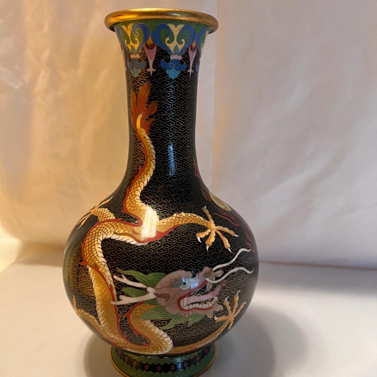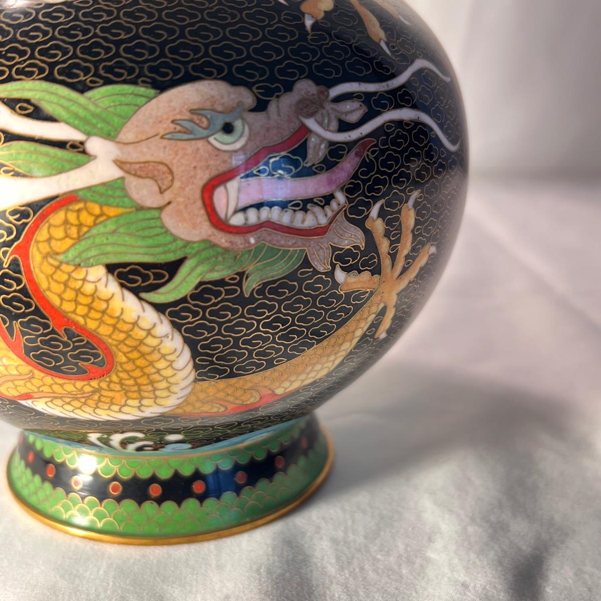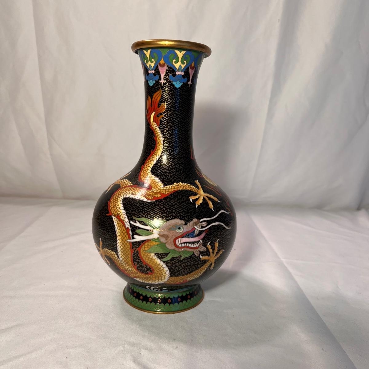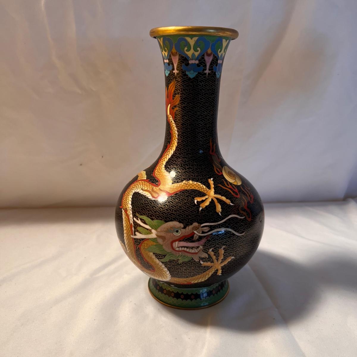 Your eye is immediately drawn to this stunning Cloisonné vase. This enameled vase is black and gold with an intricate dragon complete with breathing fire. No markings found; it measures 7”D (widest point) x 10”H. Some reflections from lighting in pics, this vase has no known blemishes.