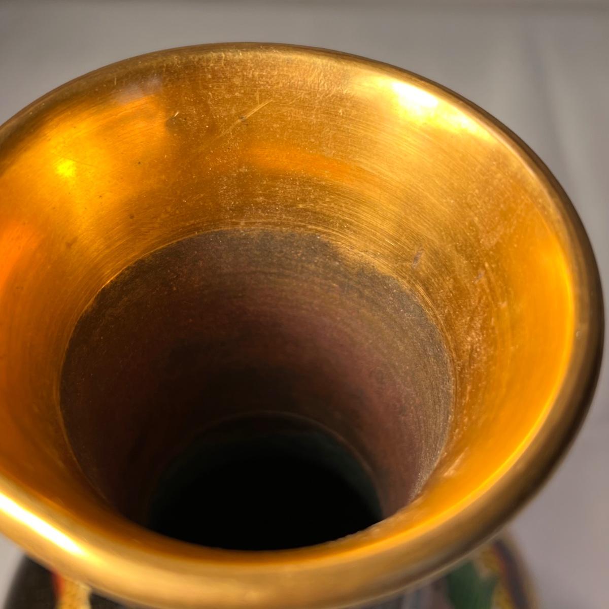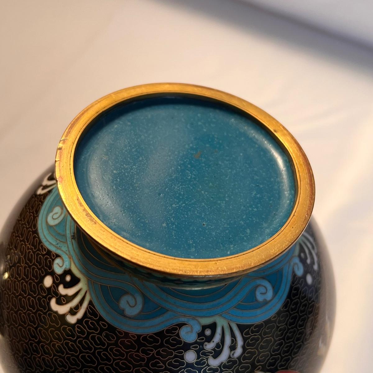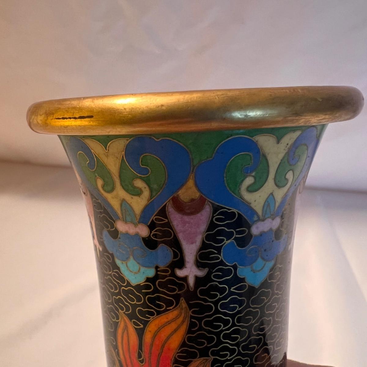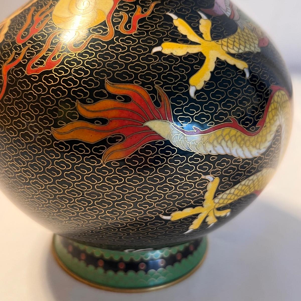 Your eye is immediately drawn to this stunning Cloisonné vase. This enameled vase is black and gold with an intricate dragon complete with breathing fire. No markings found; it measures 7”D (widest point) x 10”H. Some reflections from lighting in pics, this vase has no known blemishes.