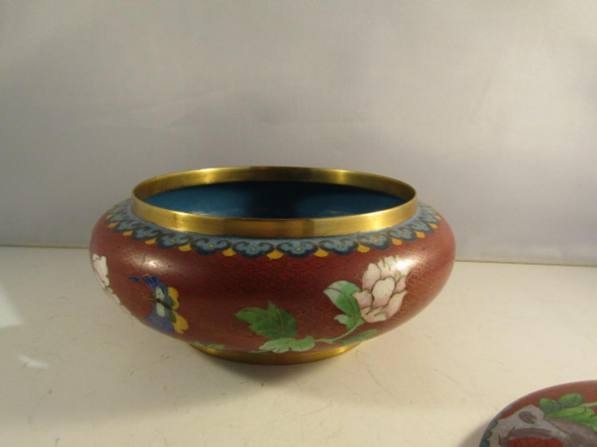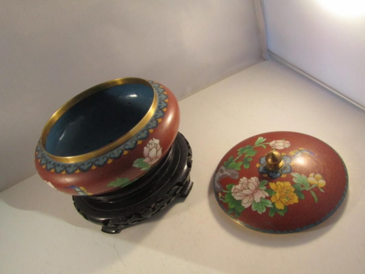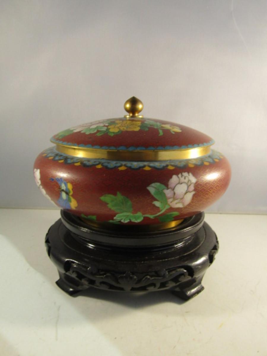 Cloisonne Enamel Bowl with Lid and Wooden Stand- Approx 7" in Diameter