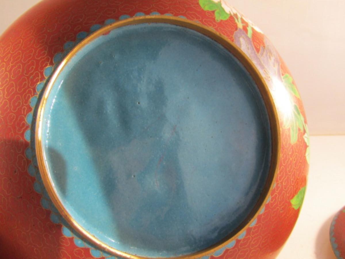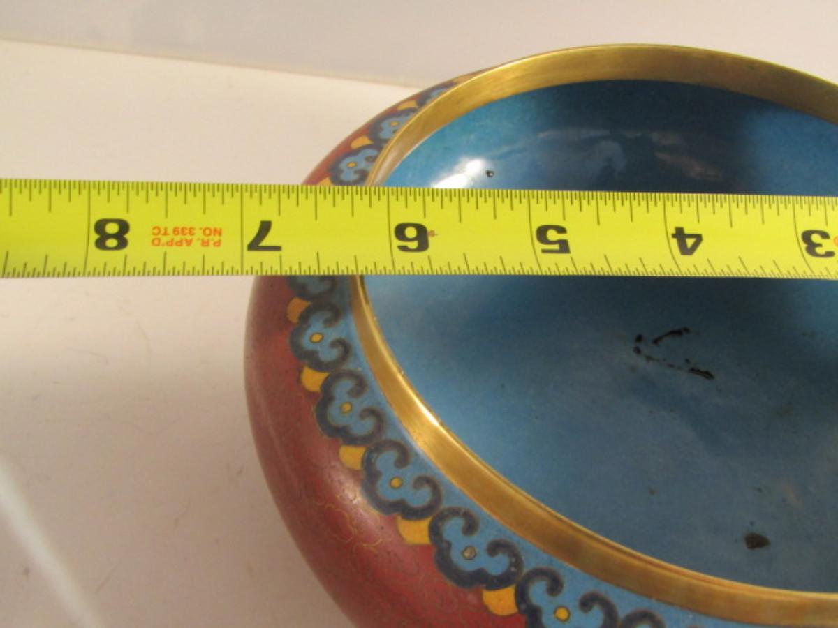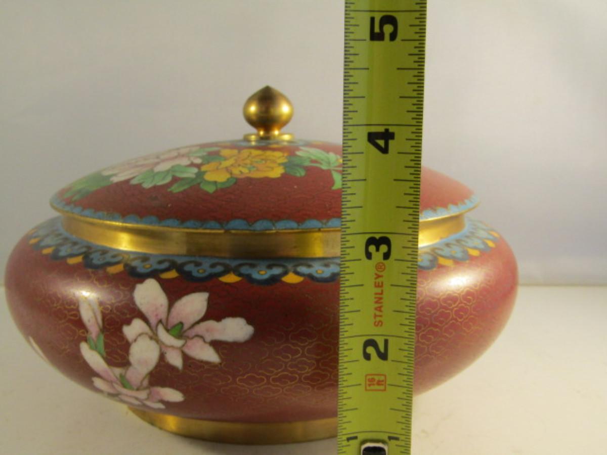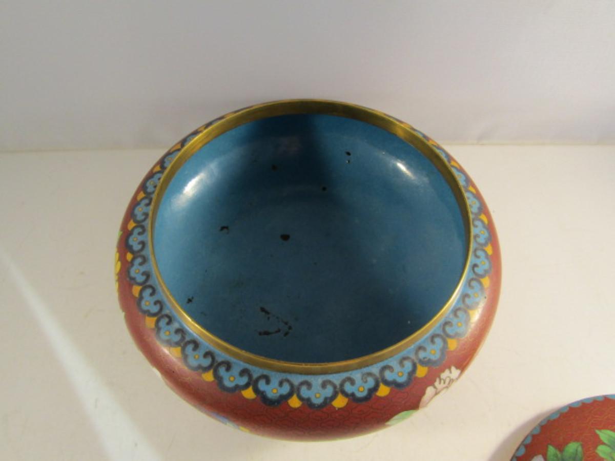 Cloisonne Enamel Bowl with Lid and Wooden Stand- Approx 7" in Diameter