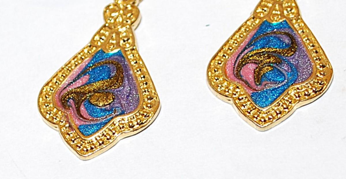 "Cloisonne' Style" Enamel Dangle EARRINGS Set with Gold Tone Surround and Wire Hook Clasp