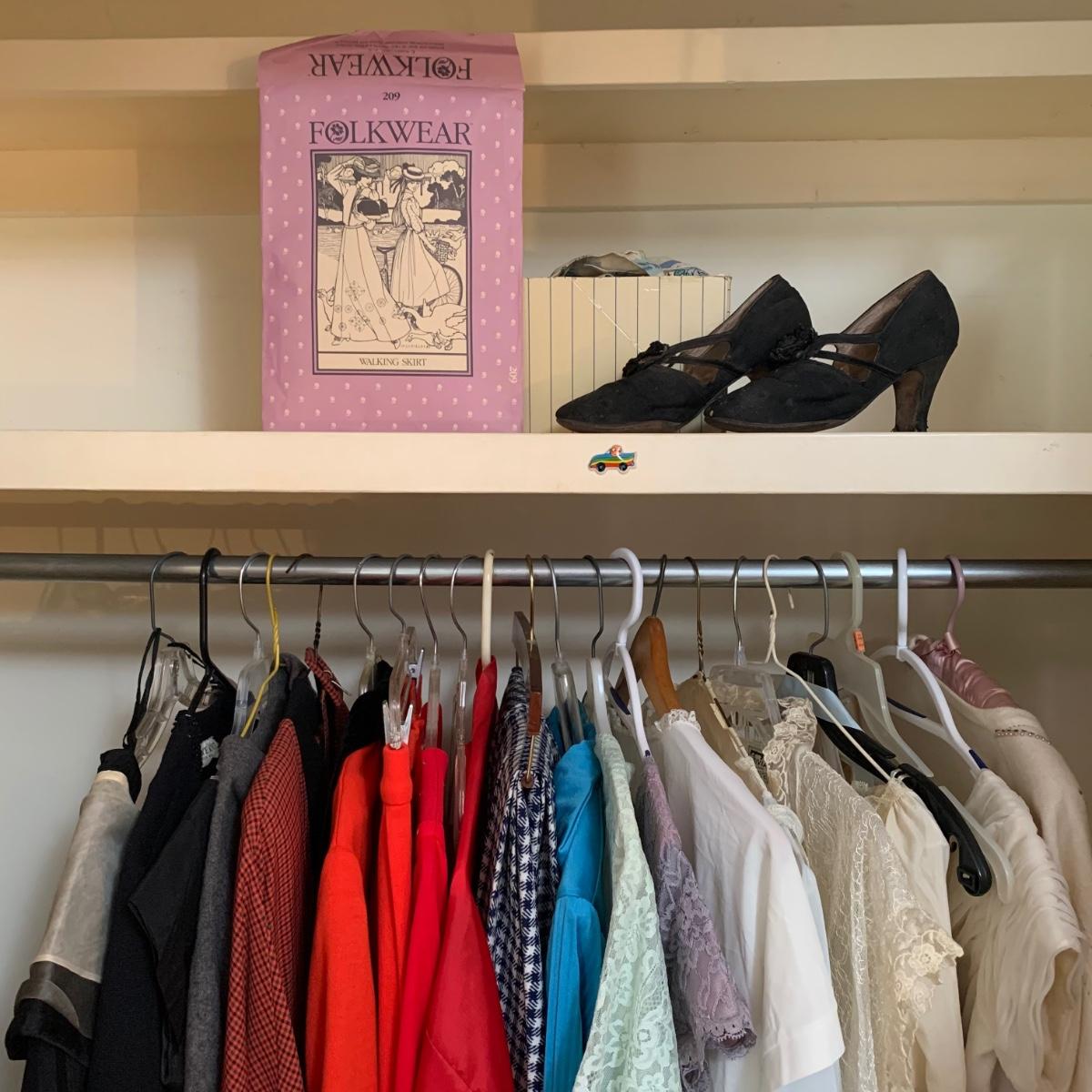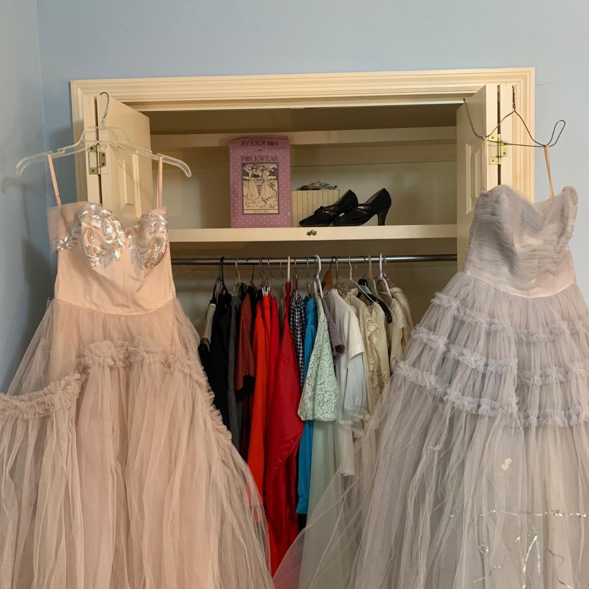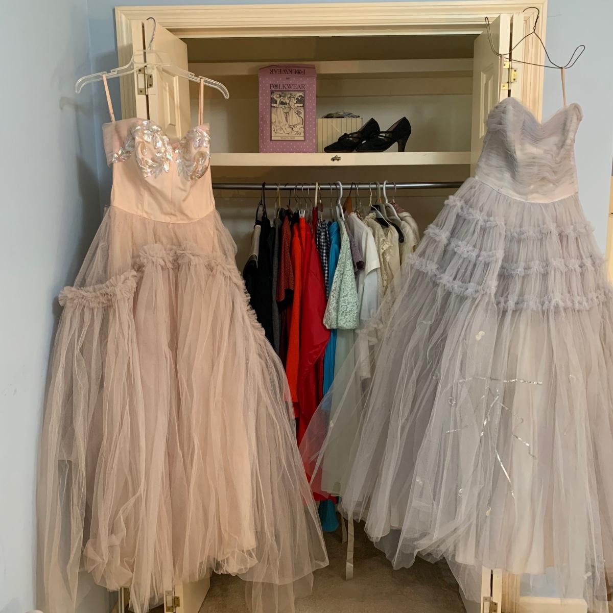 This lot is full of unique vintage clothing. From prom dresses to lady’s pant suits, this thirty one piece collection has it all. Brand names include, Trivia by Charm, GiGi Young, Lady Leona, Swingster Jackets, Butte Knot, Bermuda, and more. Sizes range from 10-16. Lot includes Lady Leona sleepwear, as well as a pair of vintage shoes and Folkwear sewing pattern. Prom dresses have a few pieces of net tulle mesh that need mending, but clothing is in good condition overall. Local pick up only.