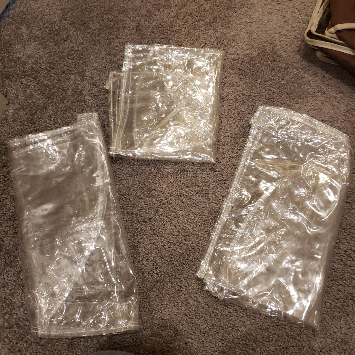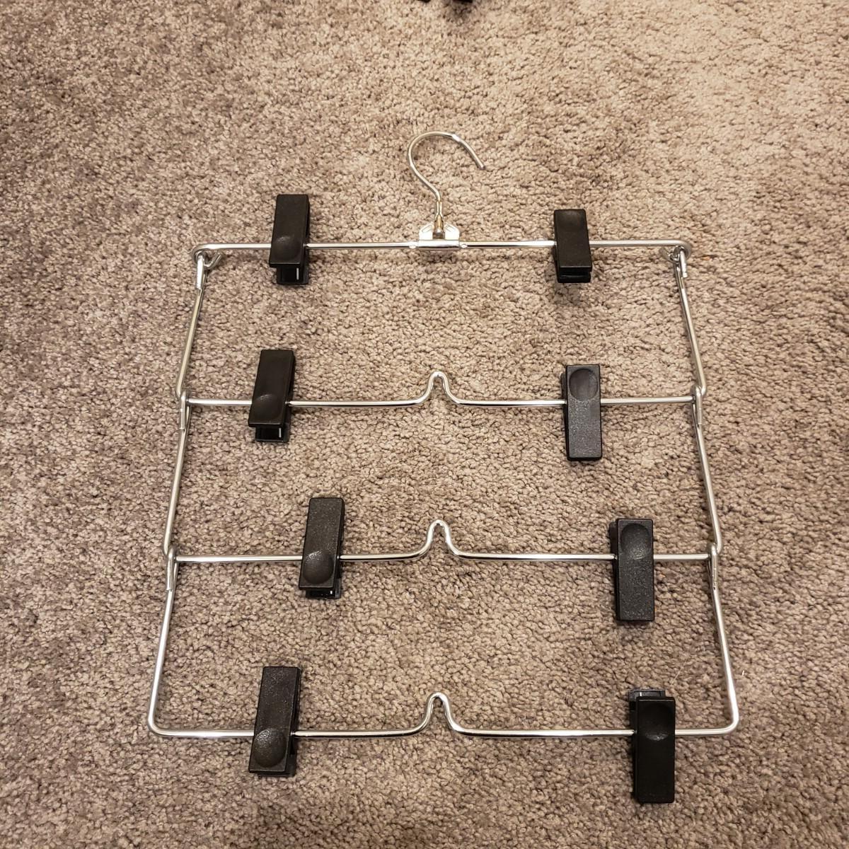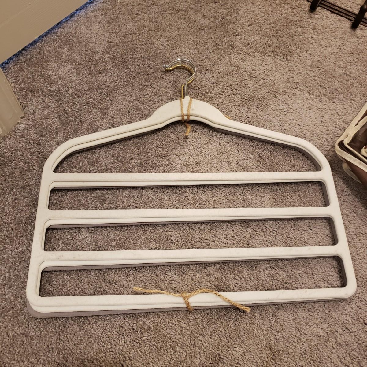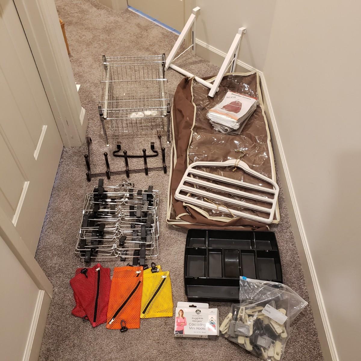 This organization lot will help in your closet and with your clothes! Some highlights are four velvet four pant hangers, a metal drawer, with a flat top for more storage measuring 18" x 13" x 10"H. The white metal adjustable over the door hanger can hold so many clothes! The two brown storage bags have zippers and handles on the side. These measure 41" x 17" x 6"H. The brown metal over the door hanger has five hooks. Two additional closet storage solutions include a Classify shelf separator and a Neatnix cubby that is designed to hang off a closet shelf.