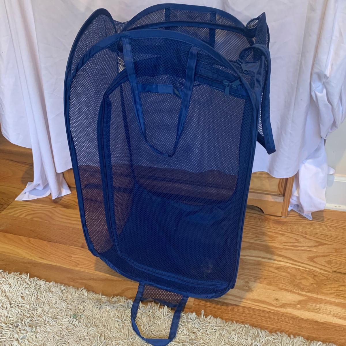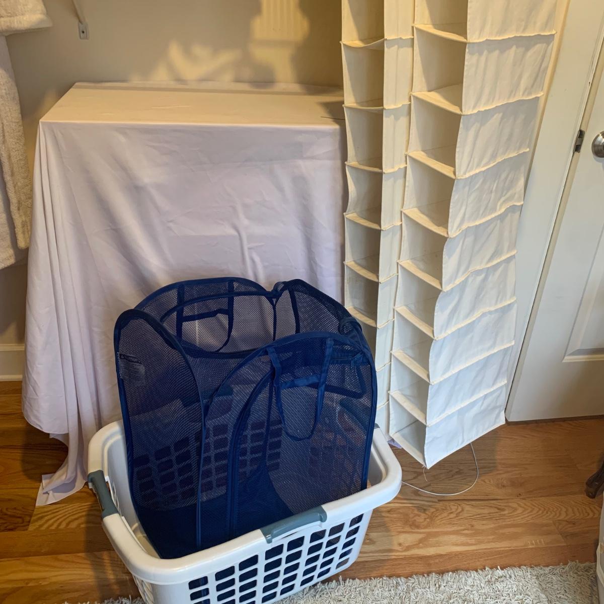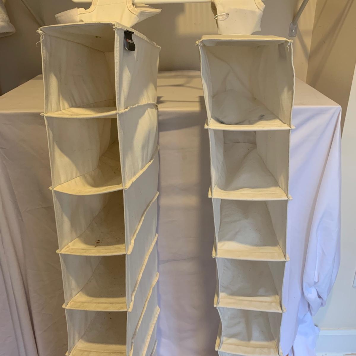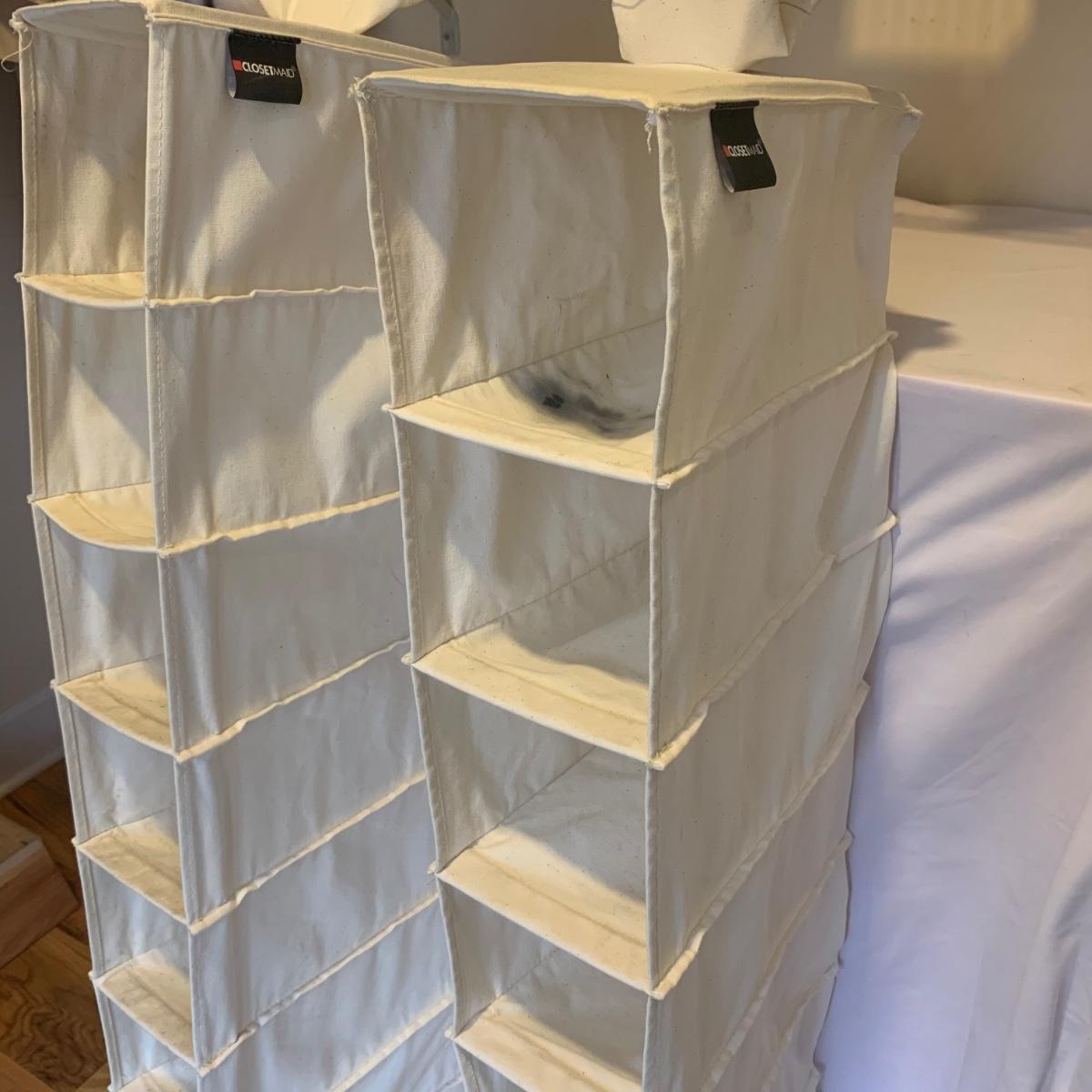 This lot includes two ClosetMaid hanging closet organizers, one plastic Rubbermaid basket, and one mesh laundry basket. The hanging closet organizers have some stains on the inside of the cubes (see photos). The mesh laundry basket has some holes in the mesh (see photos). The hanging closet organizers measure about 49.5in tall. The plastic Rubbermaid basket measures about 26in x 20in x 12in. The mesh basket measures about 14in x 26.5in.