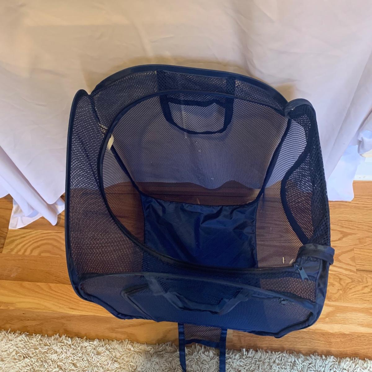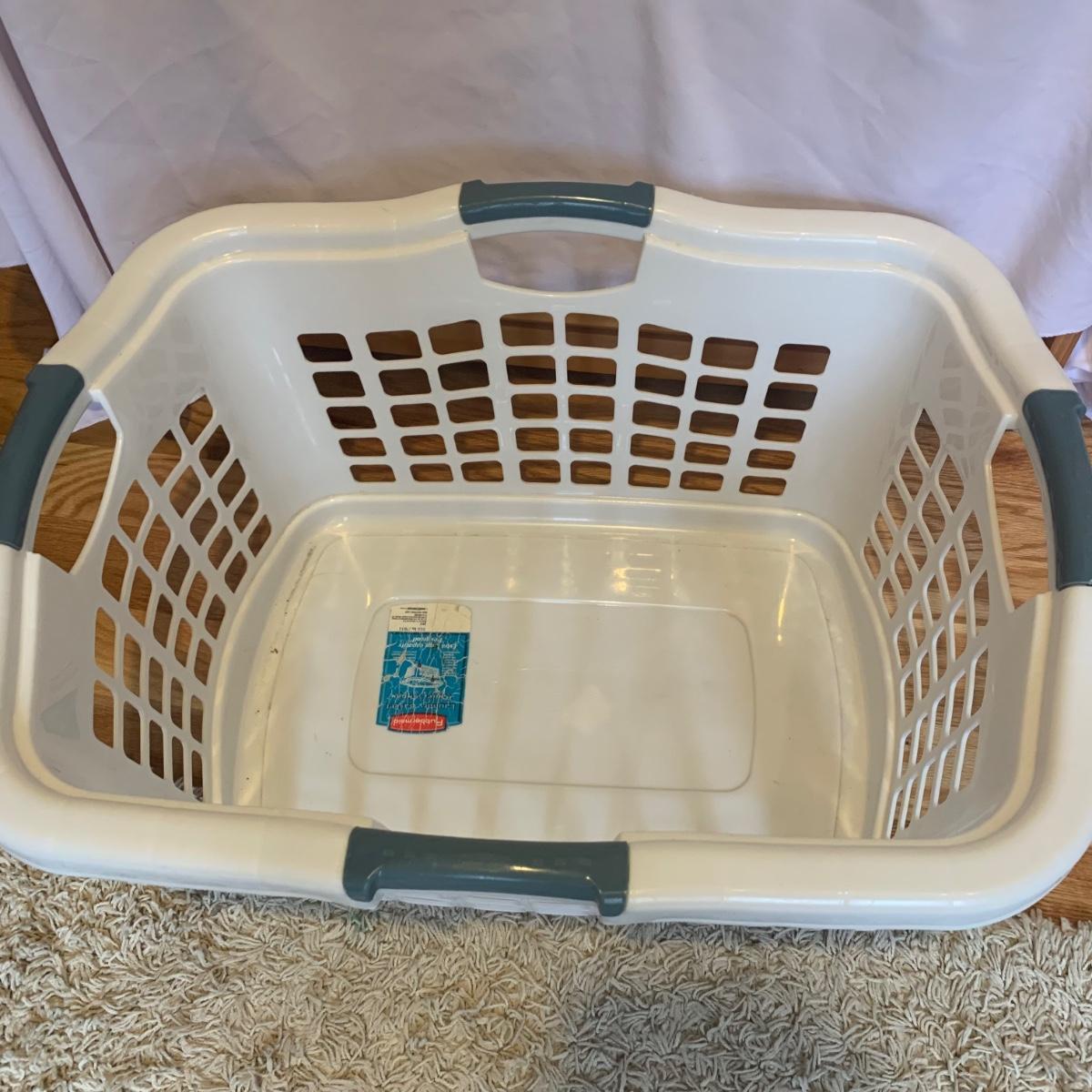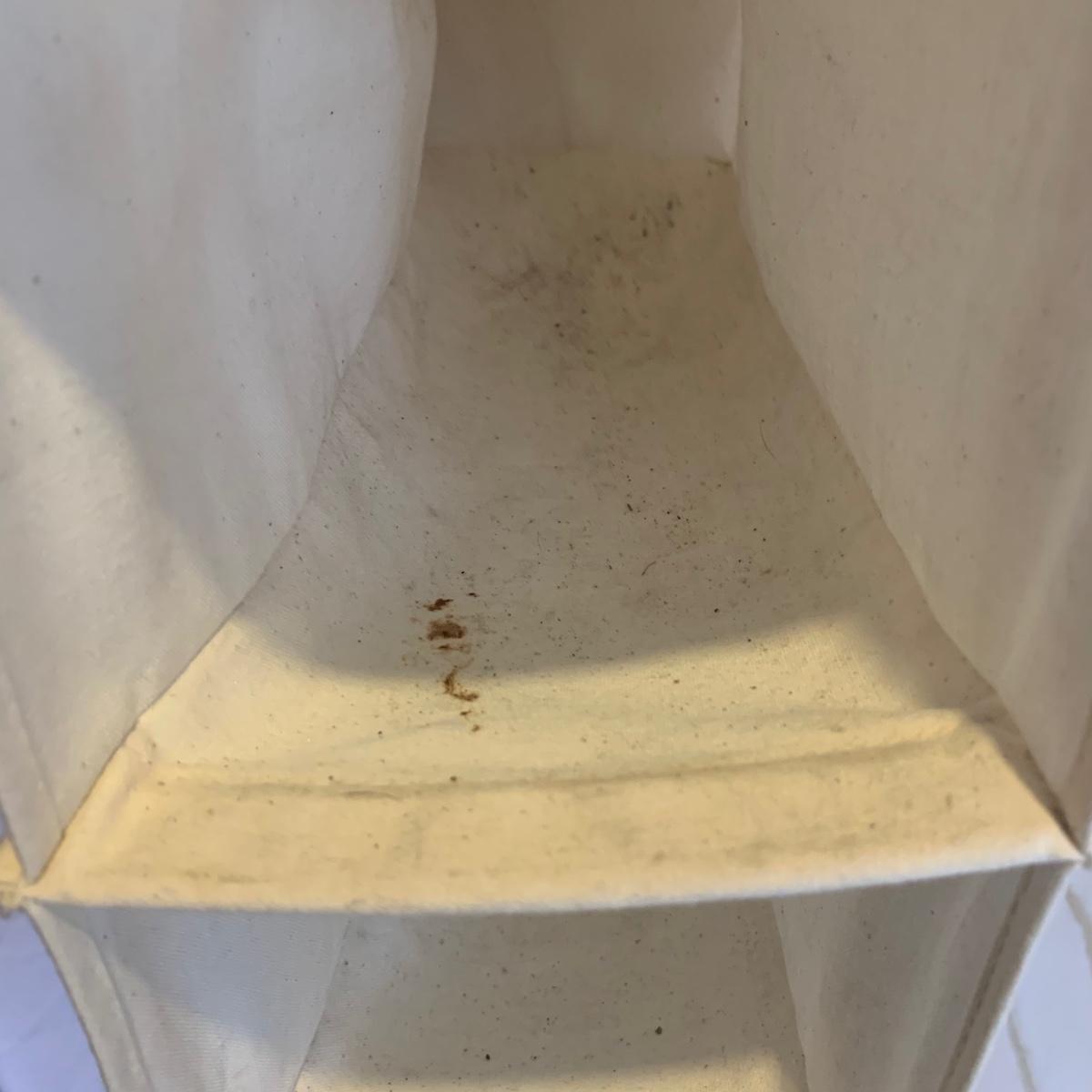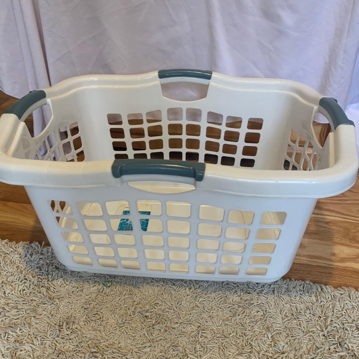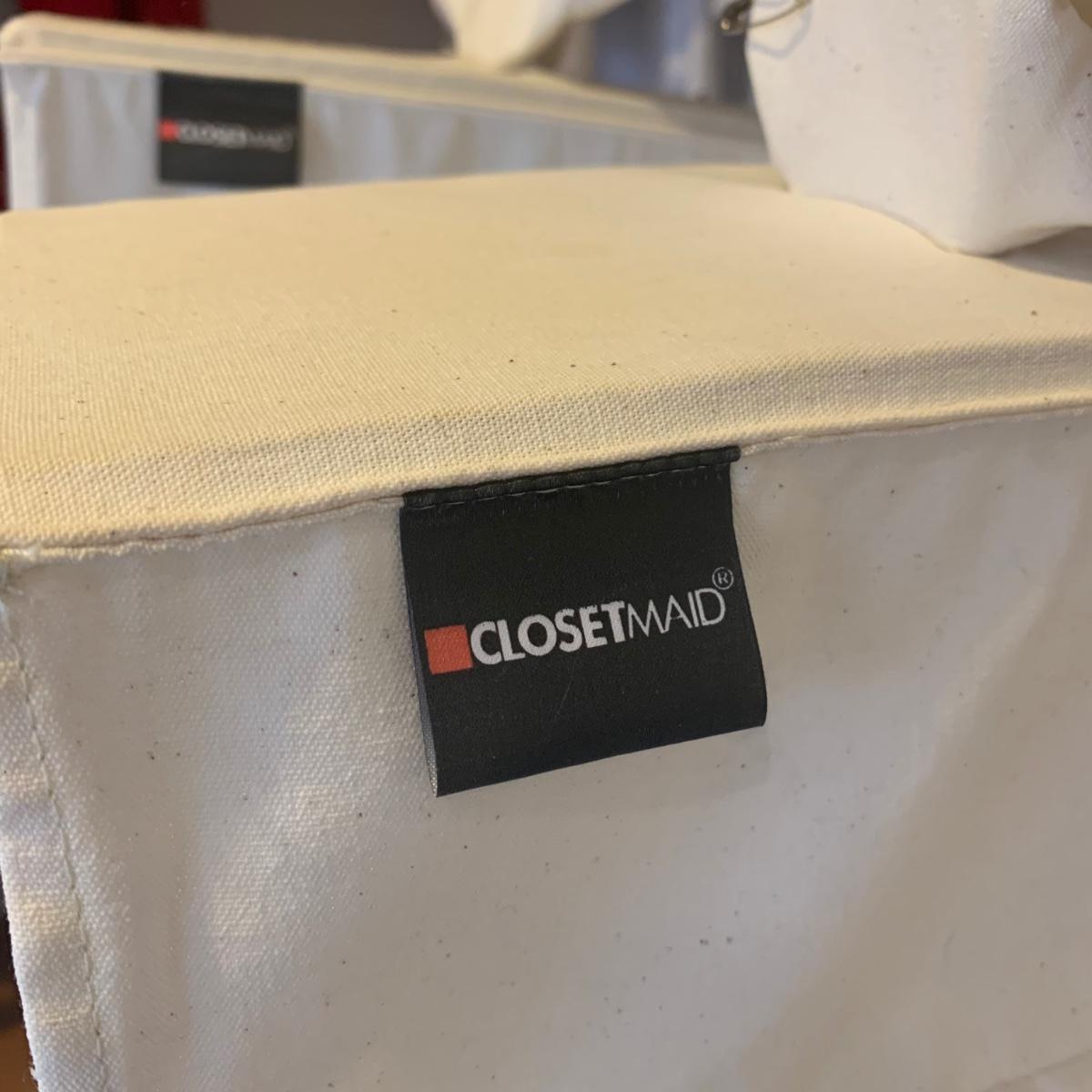 This lot includes two ClosetMaid hanging closet organizers, one plastic Rubbermaid basket, and one mesh laundry basket. The hanging closet organizers have some stains on the inside of the cubes (see photos). The mesh laundry basket has some holes in the mesh (see photos). The hanging closet organizers measure about 49.5in tall. The plastic Rubbermaid basket measures about 26in x 20in x 12in. The mesh basket measures about 14in x 26.5in.
