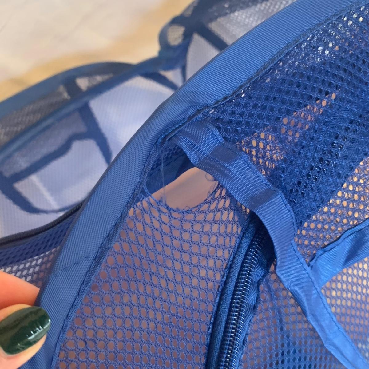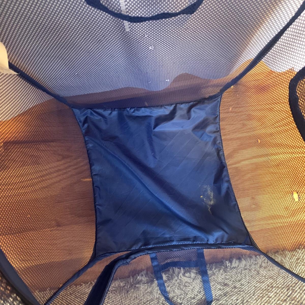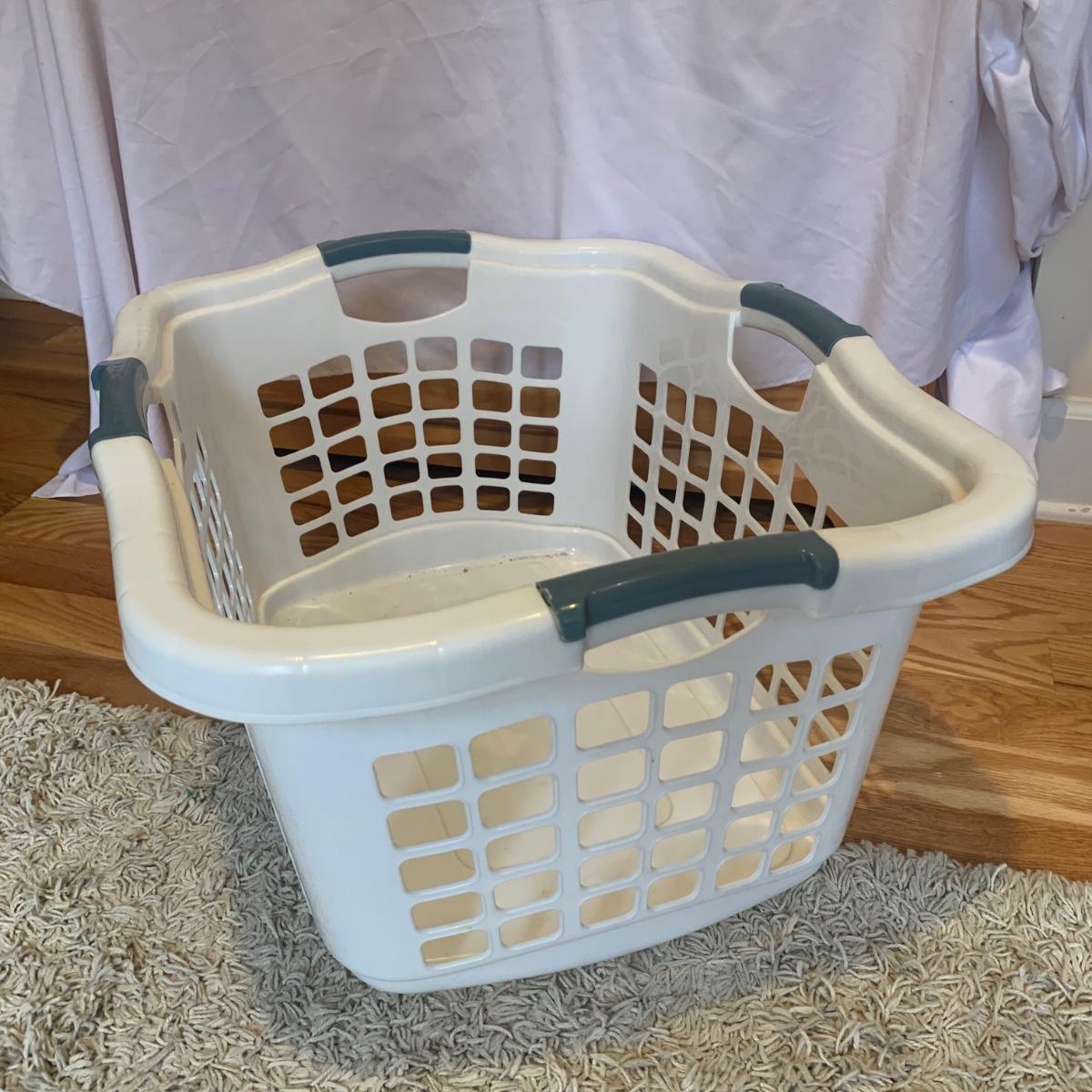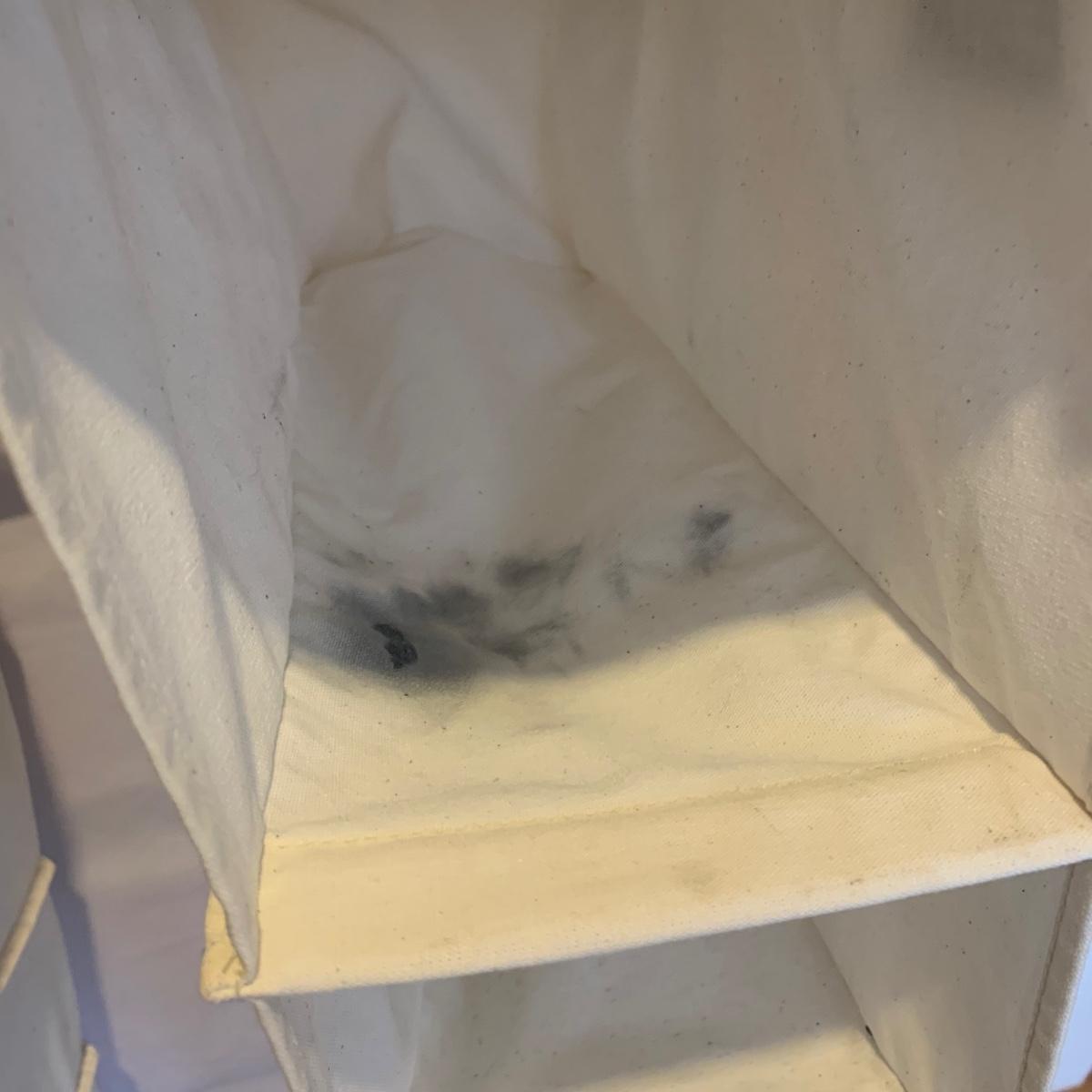 This lot includes two ClosetMaid hanging closet organizers, one plastic Rubbermaid basket, and one mesh laundry basket. The hanging closet organizers have some stains on the inside of the cubes (see photos). The mesh laundry basket has some holes in the mesh (see photos). The hanging closet organizers measure about 49.5in tall. The plastic Rubbermaid basket measures about 26in x 20in x 12in. The mesh basket measures about 14in x 26.5in.