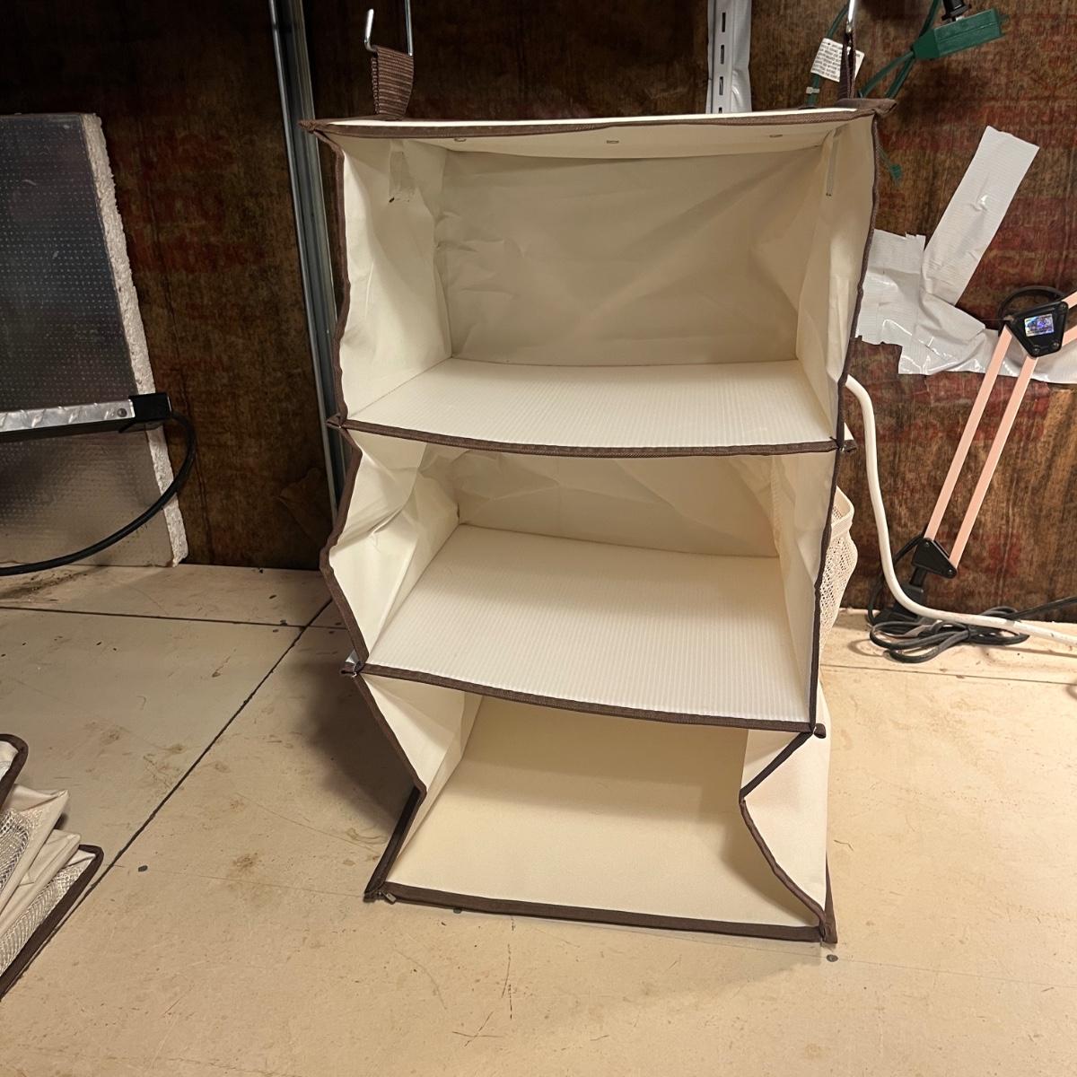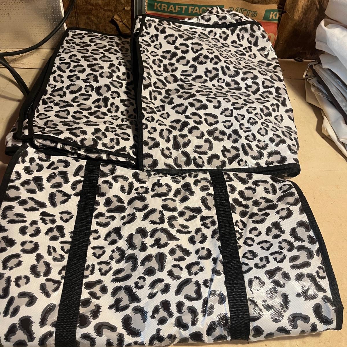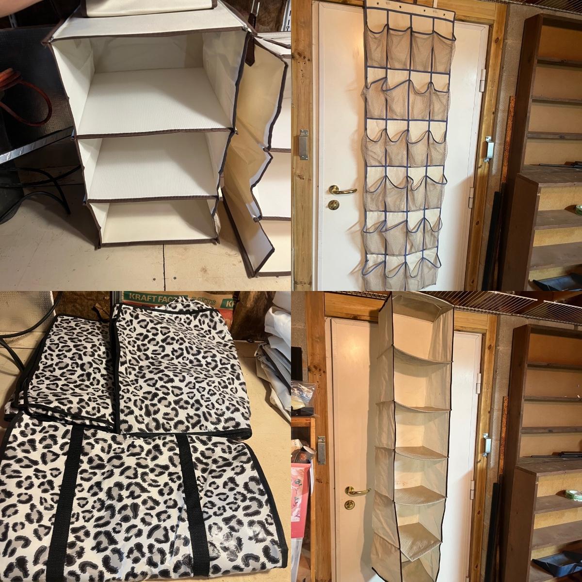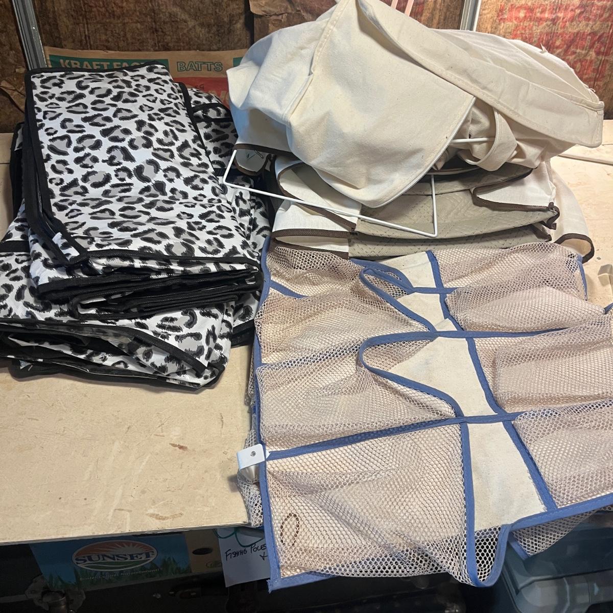 Lot includes three leopard print design bags, three hanging shoe holders, hanging storage bags, over 30 hangers and more. Also includes plastic coated wire closet shelves with the largest measuring 12” x 1.5” x 76”long.
