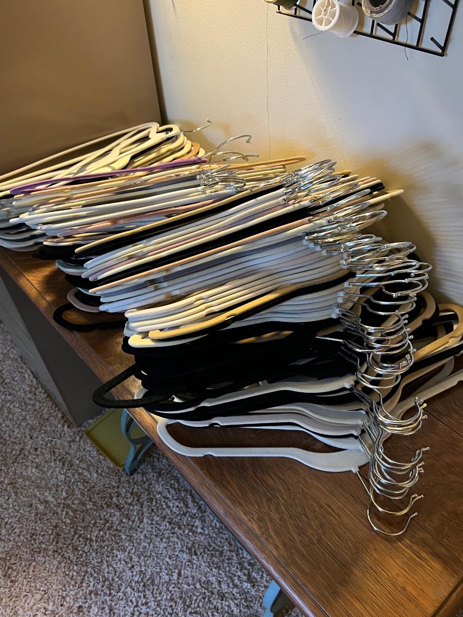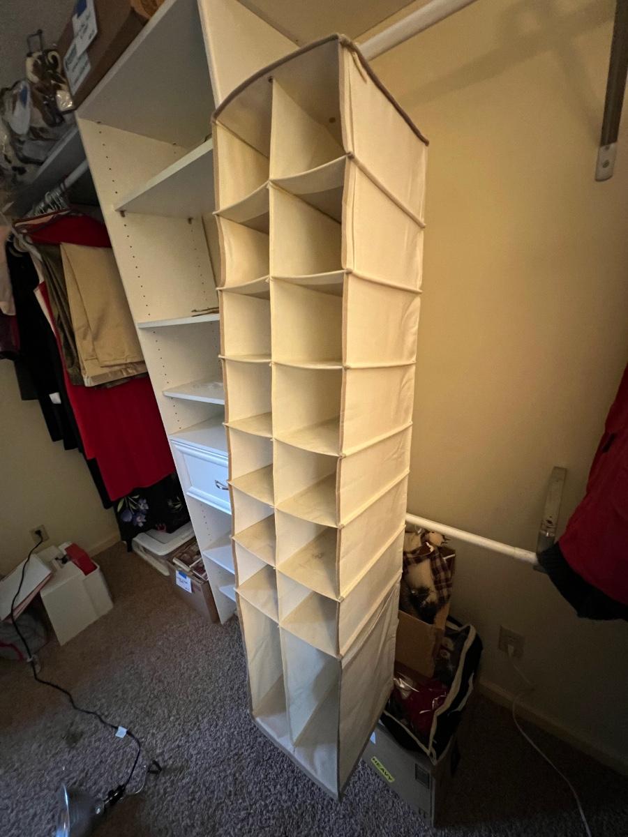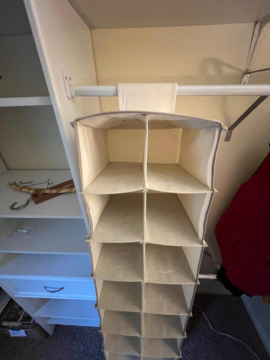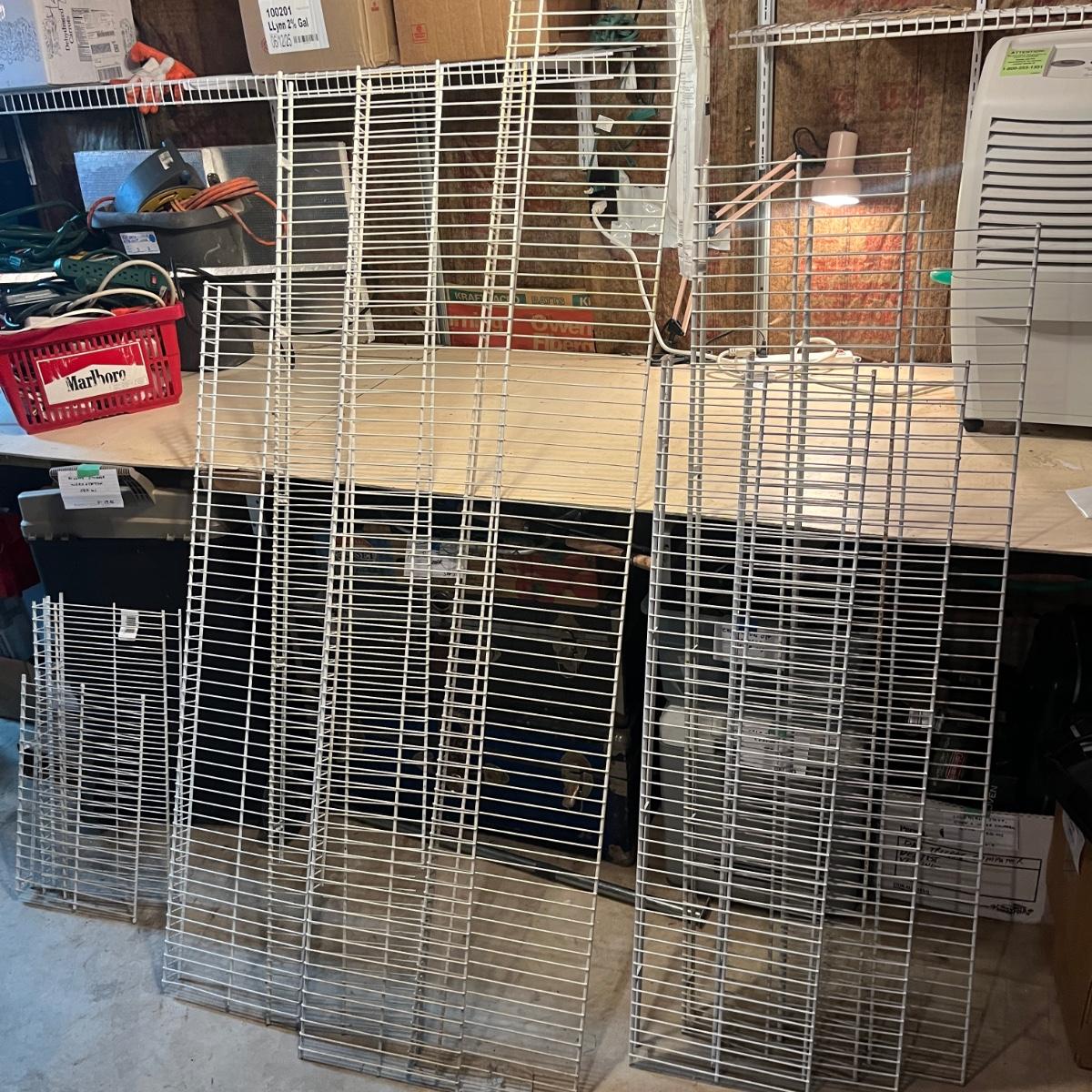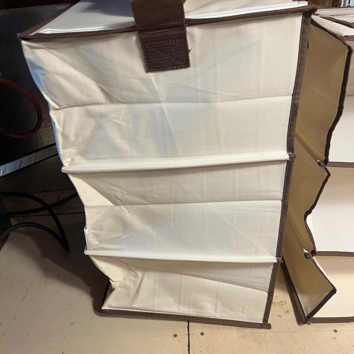 Lot includes three leopard print design bags, three hanging shoe holders, hanging storage bags, over 30 hangers and more. Also includes plastic coated wire closet shelves with the largest measuring 12” x 1.5” x 76”long.