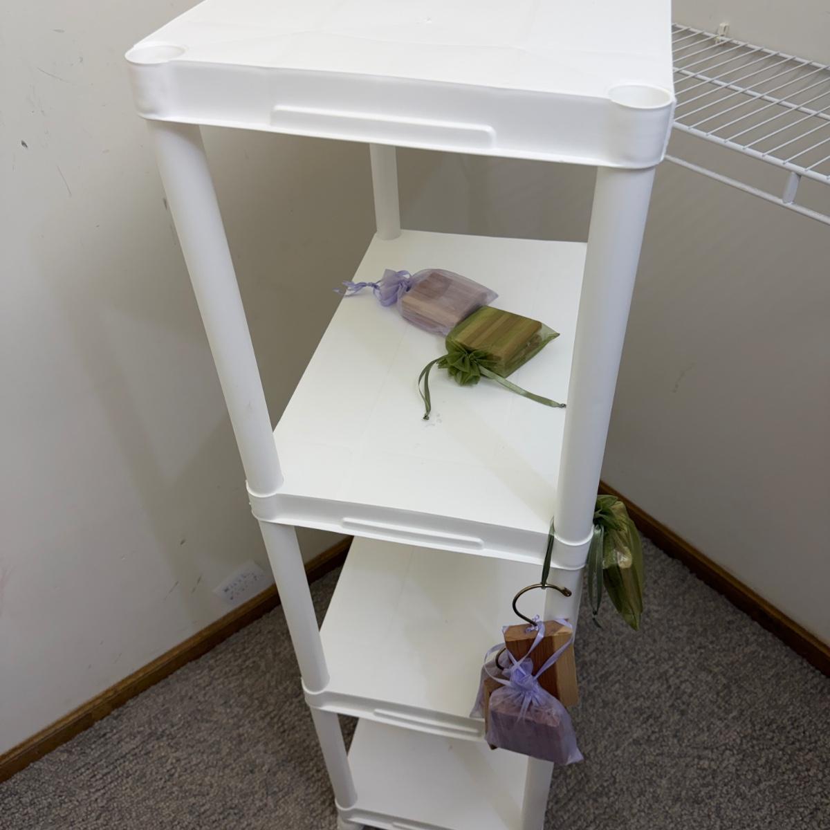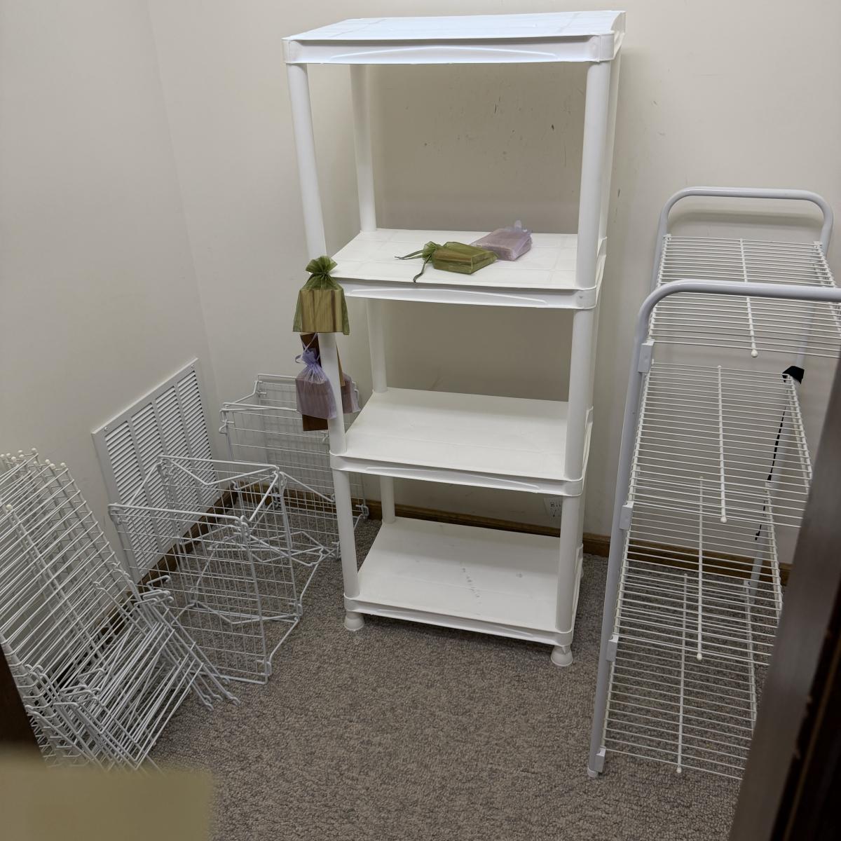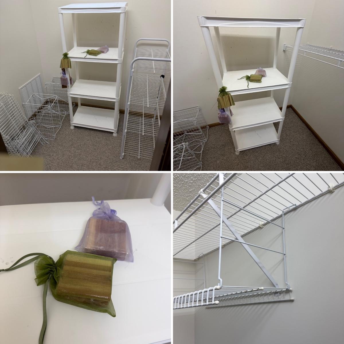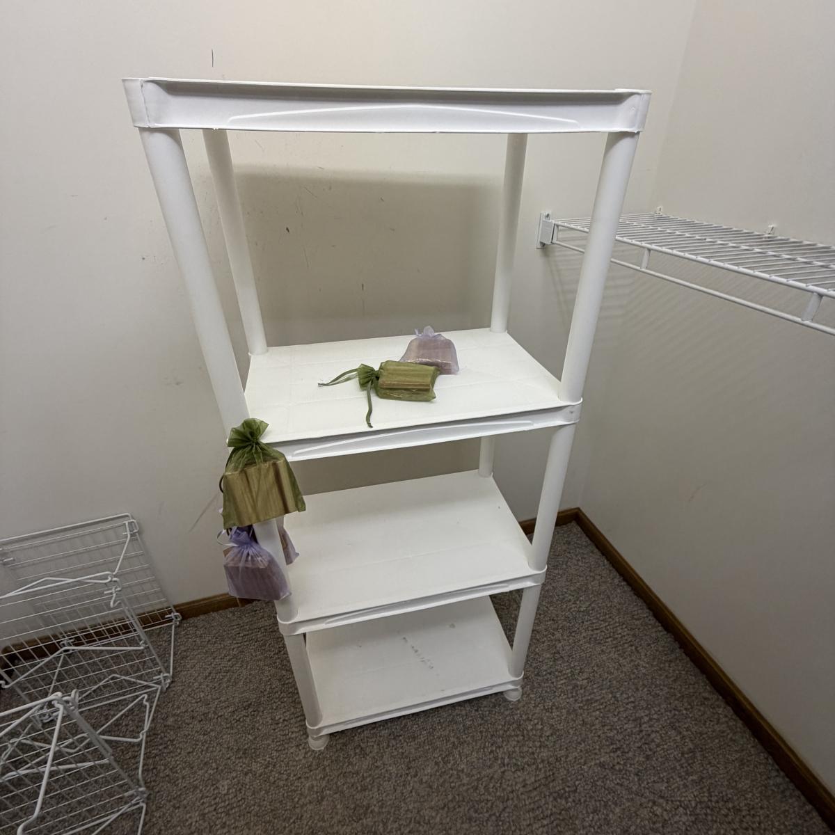 Lot includes plastic four shelf unit, coated metal four shelf unit and hanging shelves. Also includes hanging cedar blocks. Plastic shelving unit measures 22” x 14” x 52”H.