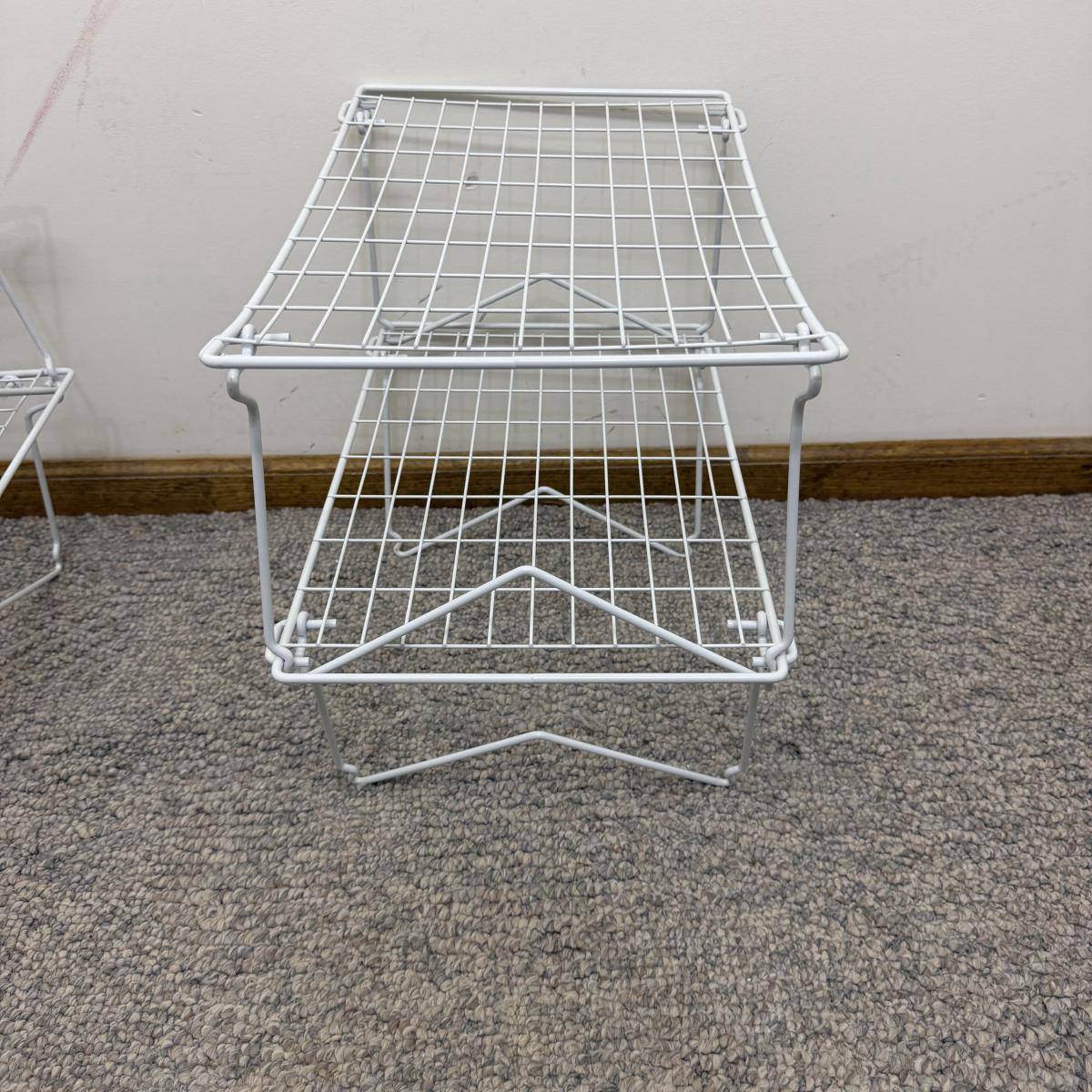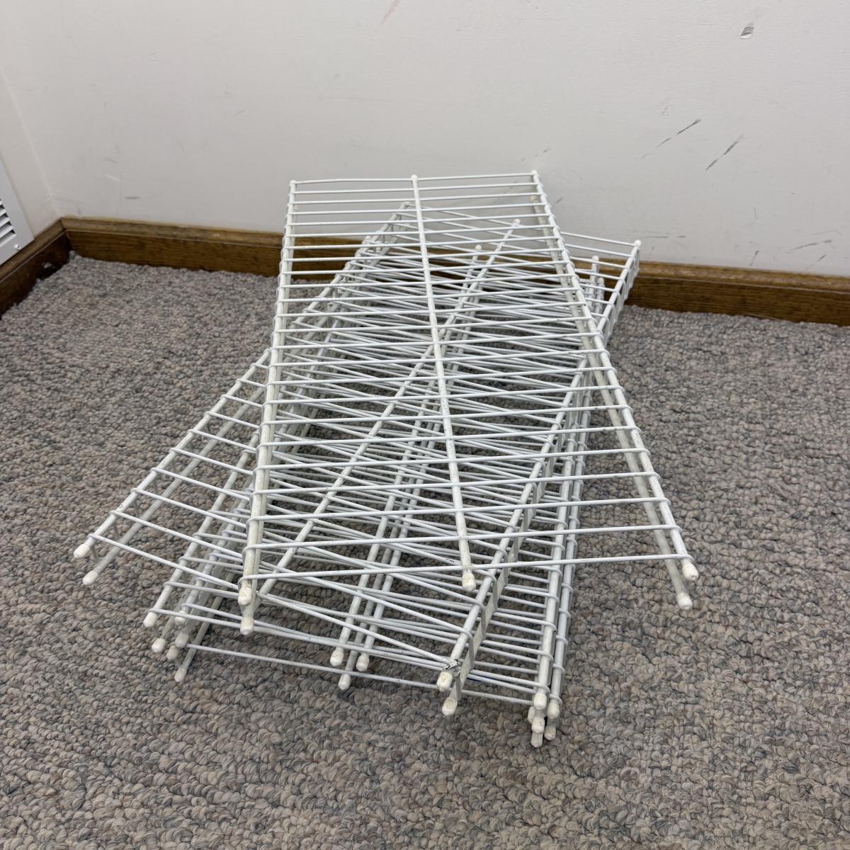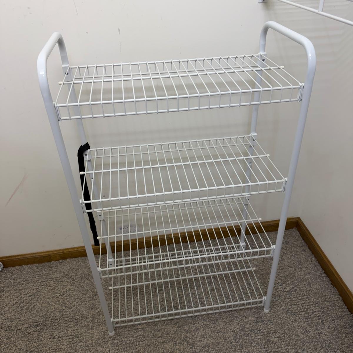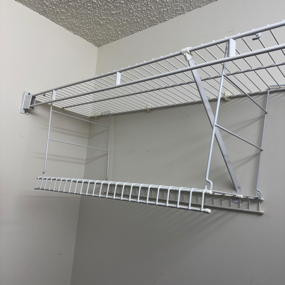 Lot includes plastic four shelf unit, coated metal four shelf unit and hanging shelves. Also includes hanging cedar blocks. Plastic shelving unit measures 22” x 14” x 52”H.