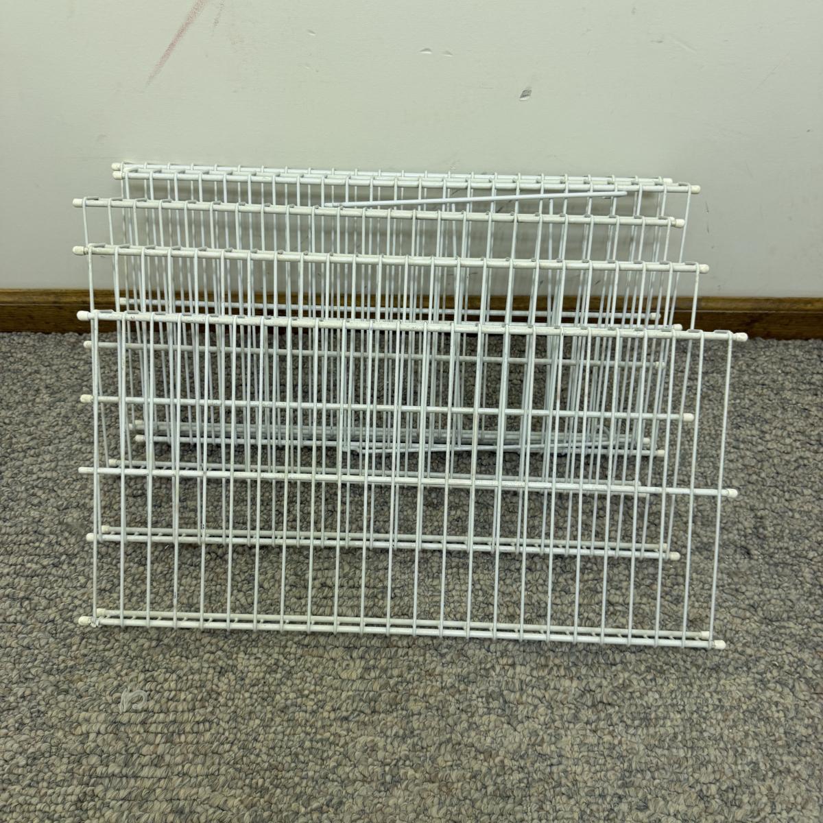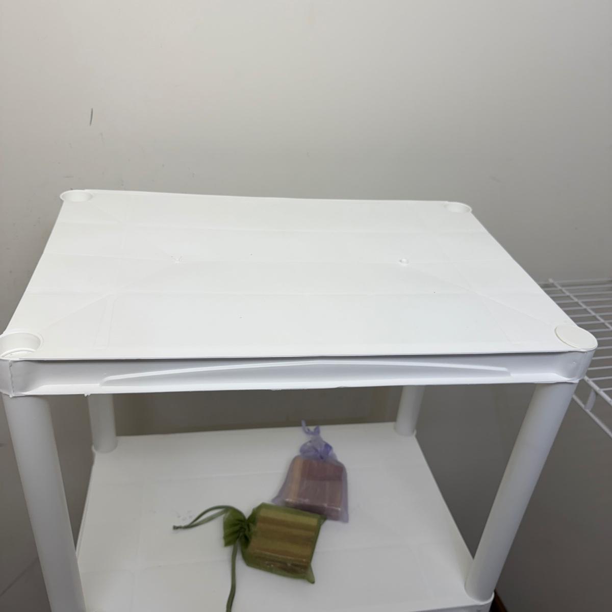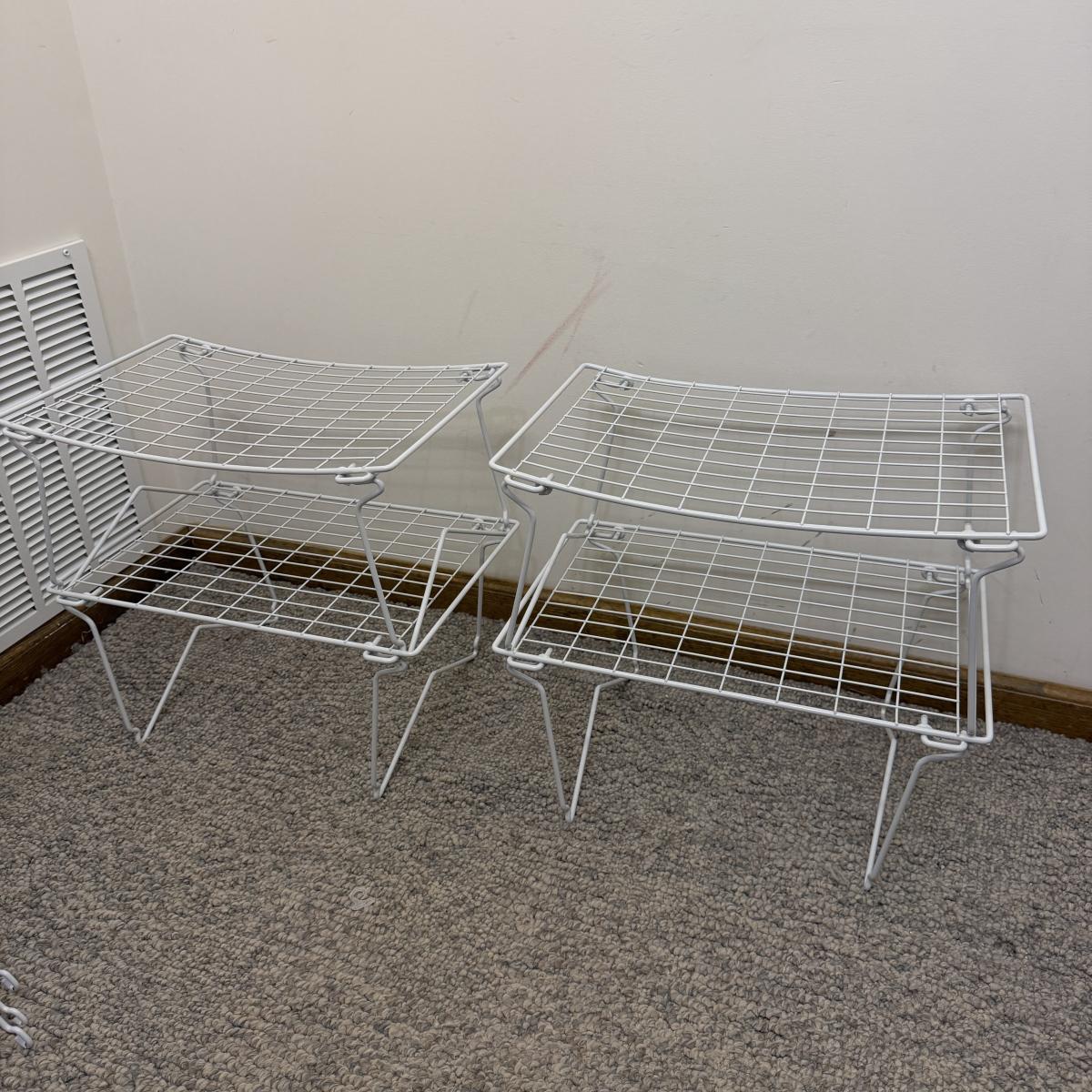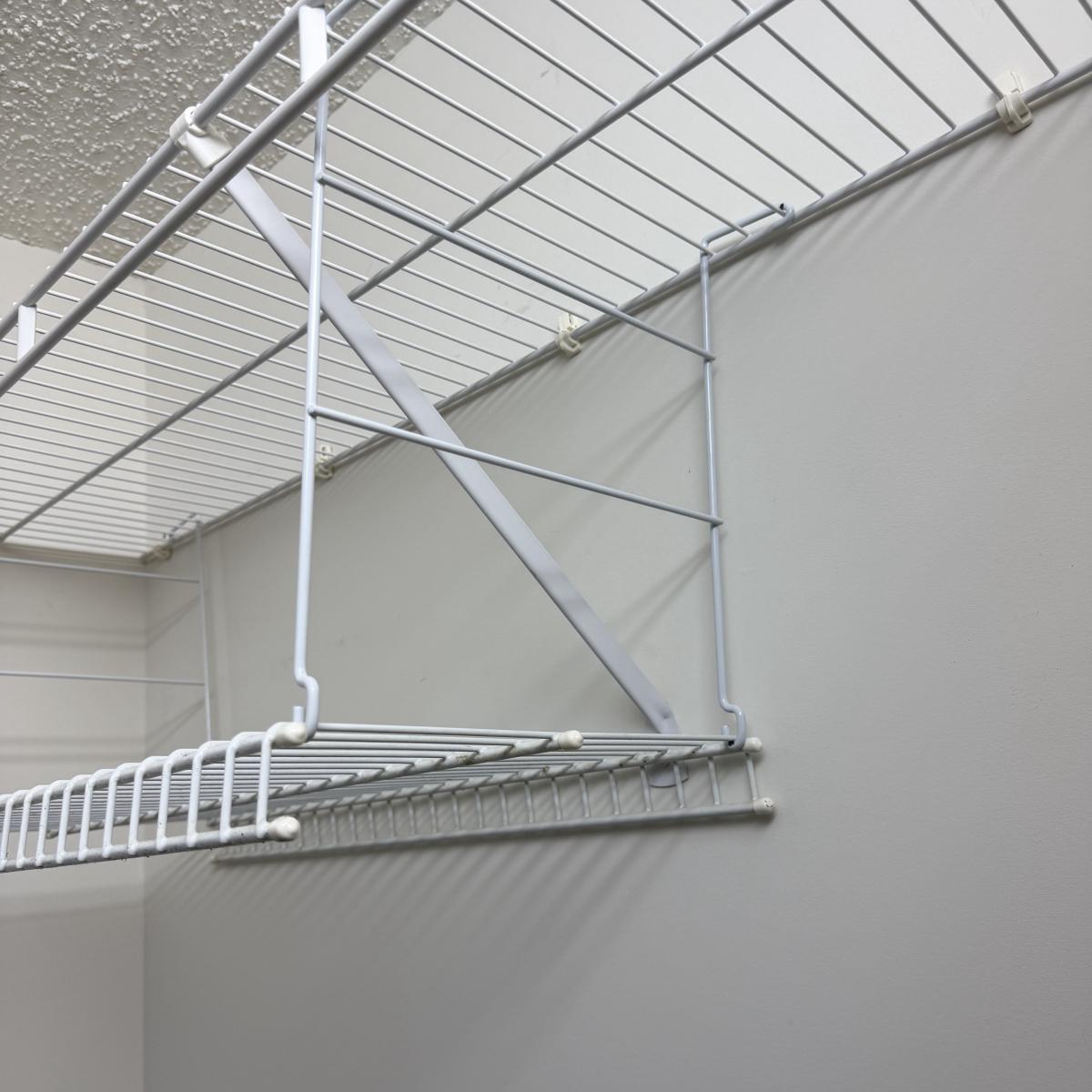 Lot includes plastic four shelf unit, coated metal four shelf unit and hanging shelves. Also includes hanging cedar blocks. Plastic shelving unit measures 22” x 14” x 52”H.