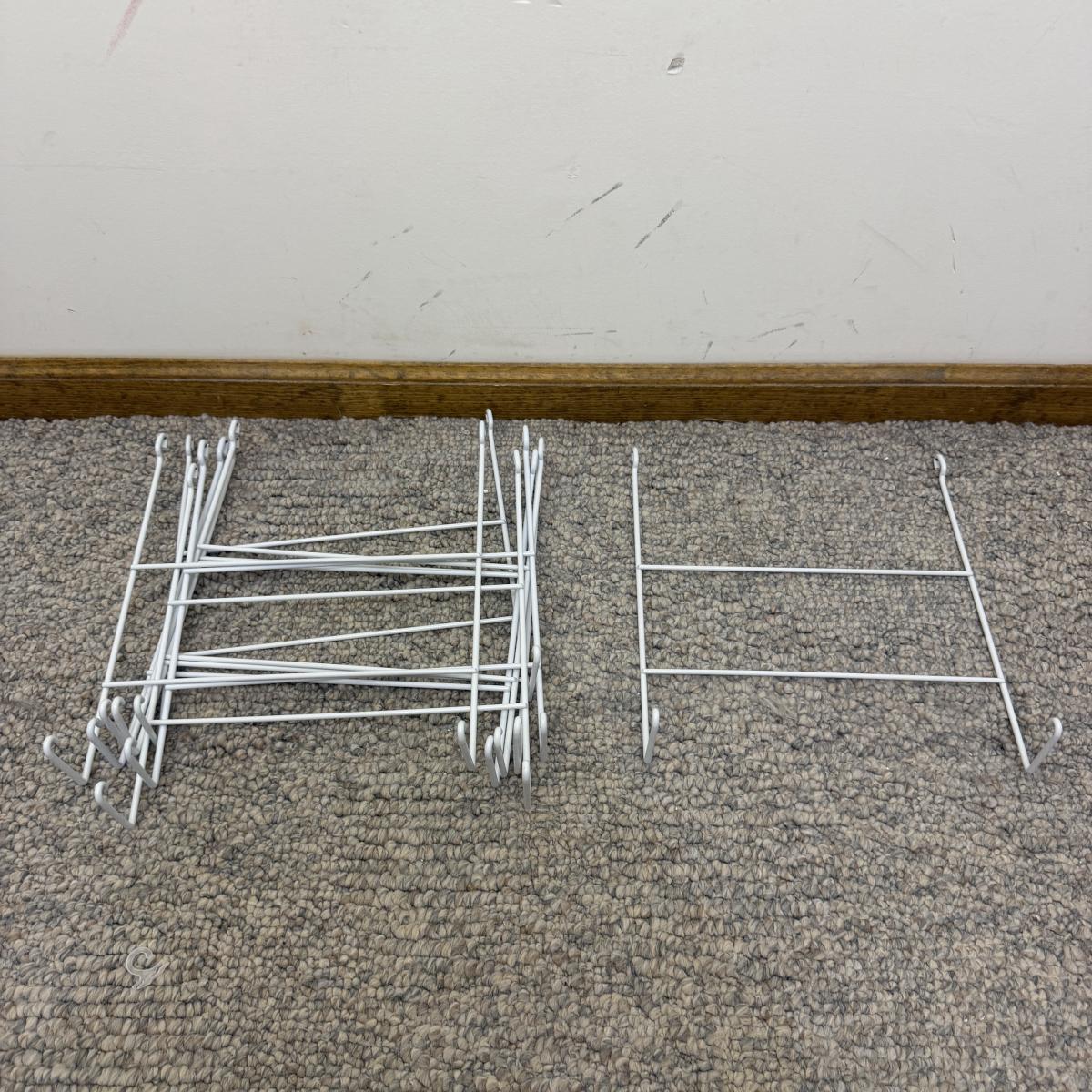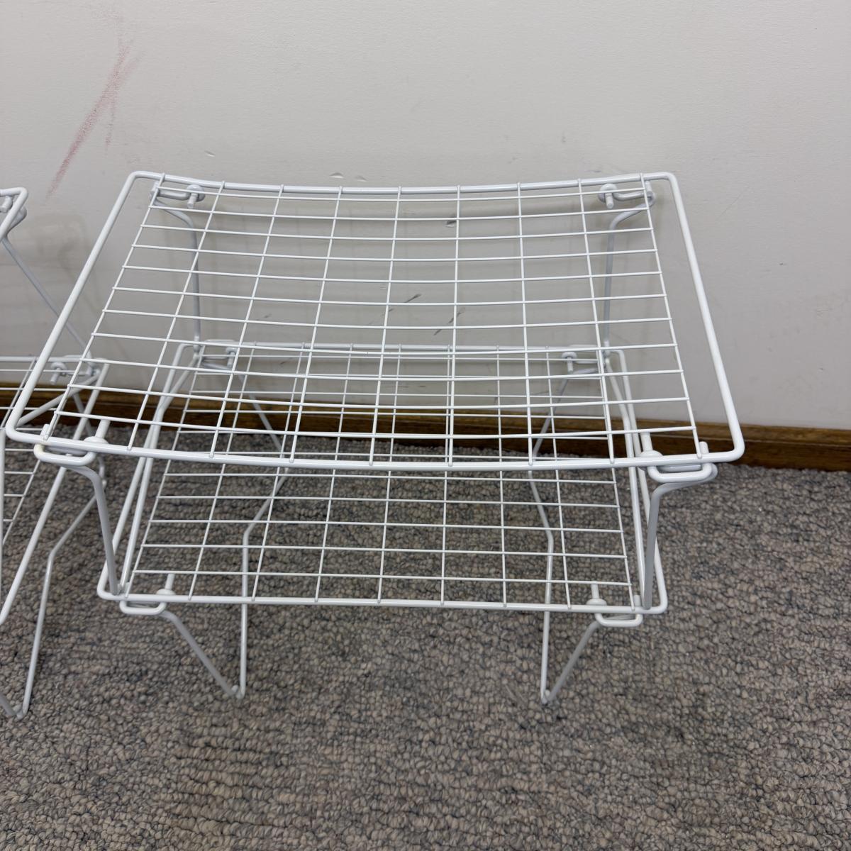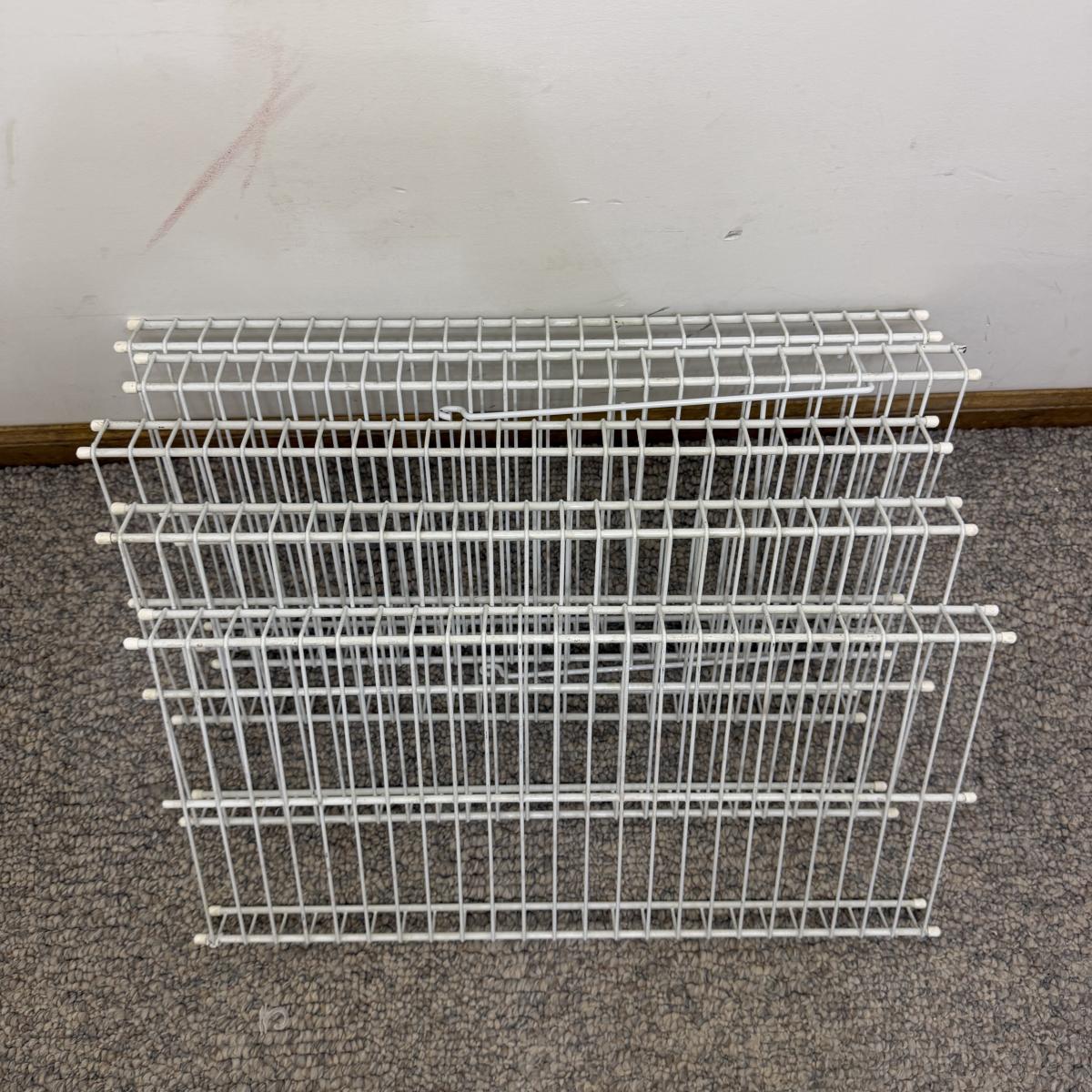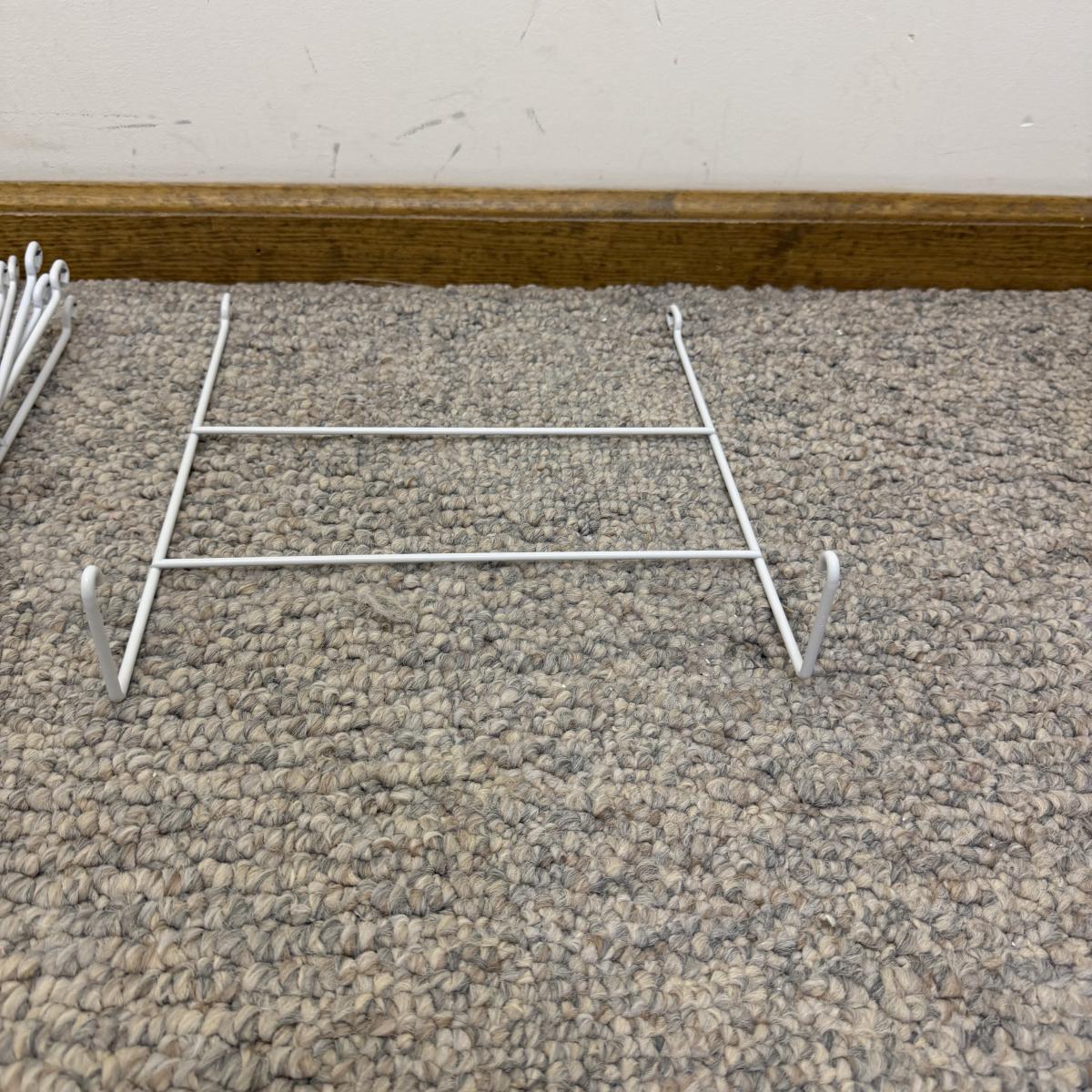 Lot includes plastic four shelf unit, coated metal four shelf unit and hanging shelves. Also includes hanging cedar blocks. Plastic shelving unit measures 22” x 14” x 52”H.