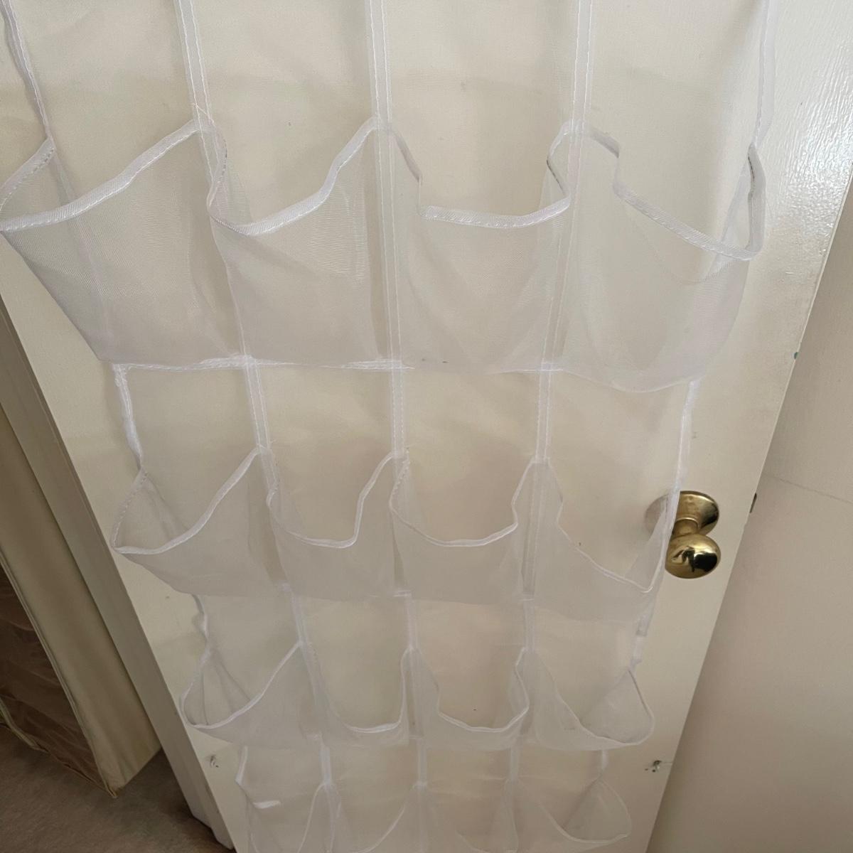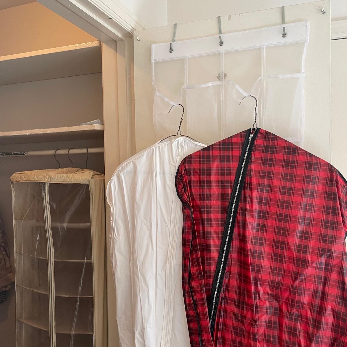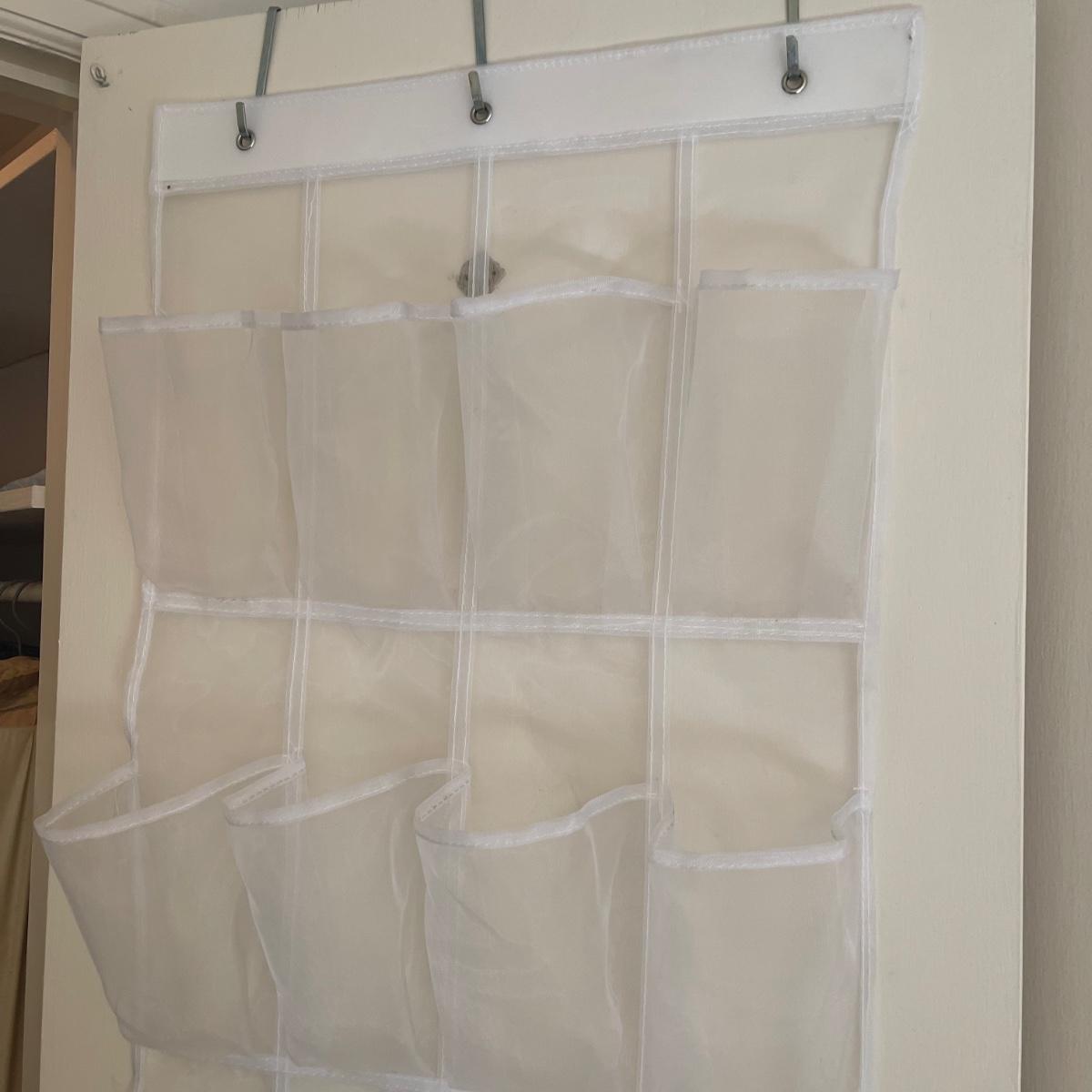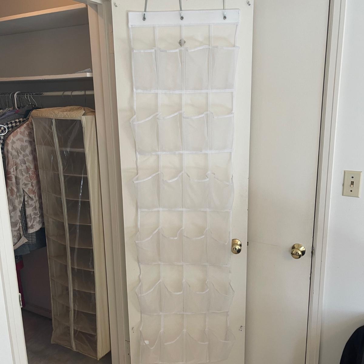 An over the door shoe holder, hanging closet shelving, and six hanging clothing storage bags. The shoe holder is about 68 inches long and covers the back of the door and can hold 24 pairs of shoes. The hanging shelving can be zipped up and has 10 shelves, it’s about 53 inches long when hanging.