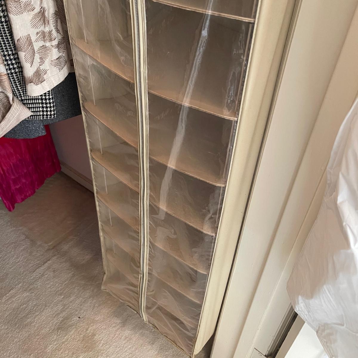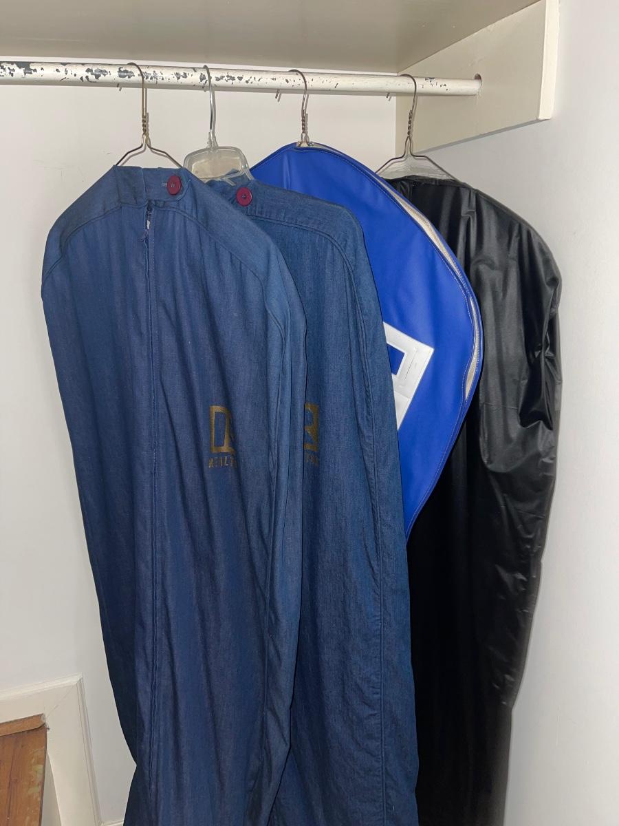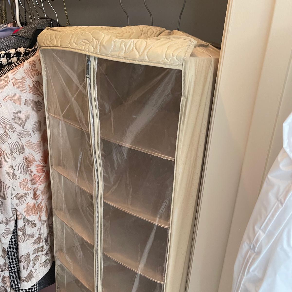 An over the door shoe holder, hanging closet shelving, and six hanging clothing storage bags. The shoe holder is about 68 inches long and covers the back of the door and can hold 24 pairs of shoes. The hanging shelving can be zipped up and has 10 shelves, it’s about 53 inches long when hanging.